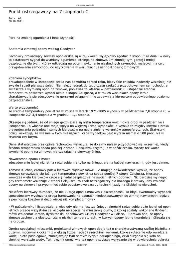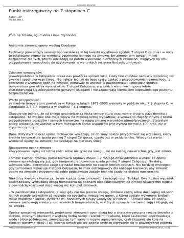 autosalon pomorski Punkt ostrzegawczy na 7 stopniach C Autor: AP 30.10.2011. Pora na zmianę ogumienia i inne czynności Anatomia zimowej opony według Goodyear Fachowcy prowadzący serwisy oponiarskie są w tej kwestii wyjątkowo zgodni: 7 stopni C za dnia i w nocy to ostateczny sygnał do wymiany ogumienia letniego na zimowe. Im zimniej tym gorzej i mniej bezpiecznie dla tych, którzy odkładają na potem wykonanie niezbędnych czynności, mających na celu przygotowanie samochodu do użytkowania w warunkach jesienno – zimowych. Zdaniem synoptyków prawdopodobnie w listopadzie czeka nas powtórka sprzed roku, kiedy fale chłodów nadeszły wcześniej niż zwykle i spadł pierwszy śnieg. Nie należy jednak do tego czasu czekać z przygotowaniem samochodu, a zwłaszcza z wymianą opon na zimowe, ponieważ to właśnie w październiku i listopadzie średnia temperatura powietrza wynosi około 7 stopni Celsjusza, a w takich warunkach opony letnie charakteryzują się zdecydowanie gorszymi osiągami i nie zapewniają kierowcom odpowiedniego poziomu bezpieczeństwa. Warto przypomnieć że średnie temperatury powietrza w Polsce w latach 1971-2005 wynosiły w październiku 7,8 stopnia C, w listopadzie 2,7-3,4 stopnia a w grudniu - 1,1 stopnia. Okazuje się jednak, że od śniegu groźniejsze są niska temperatura oraz mokre drogi w październiku i listopadzie. To właśnie one mają wpływ na większą liczbę wypadków, a wynika to między innymi z braku przygotowania pojazdów i samych kierowców na nagłą zmianę warunków atmosferycznych. Statystyki policji wskazują, że właśnie w tych miesiącach liczba wypadków jest wyższa niemal o 100 proc. niż w styczniu czy lutym. Dane statystyczne oraz opinie fachowców wskazują, że do zimy należy przygotować się wcześniej, kiedy średnia temperatura spada poniżej 7 stopni Celsjusza, często już w październiku. Wtedy też warto wymienić opony na zimowe, nie czekając na pierwszy śnieg. Nowoczesna opona zimowa zdecydowanie lepiej niż letnia radzi sobie nie tylko na śniegu, ale na każdej nawierzchni, gdy jest zimno. Tomasz Kuchar, czołowy polski kierowca rajdowy mówi: - Z mojego doświadczenia wynika, że opony zimowe sprawdzają się już, gdy temperatura powietrza spada poniżej 7 stopni Celsjusza. Niestety, wówczas wielu kierowców czuje się nadal bezpiecznie na swoich letnich oponach. Nic bardziej mylnego: gdy termometr wskazuje 7 stopni Celsjusza, to znak ostrzegawczy dla każdego kierowcy, aby zmienić opony na zimowe i przypomnieć sobie podstawowe zasady techniki jazdy na śliskiej nawierzchni. Niektórzy kierowcy tłumaczą, że nie kupują opon zimowych z oszczędności. To błąd. Ewentualny wypadek spowodowany wydłużoną drogą hamowania na oponach niedostosowanych do zimnej nawierzchni będzie z pewnością kosztował dużo więcej niż komplet zimówek. - W październiku i listopadzie, a więc gdy nie ma jeszcze śniegu, zimówki radzą sobie dużo lepiej od opon letnich przede wszystkim ze względu na specjalną mieszankę gumy, z której zostały wykonane – mówi Waldemar Jarosz, dyrektor ds. handlowych Grupy Goodyear w Polsce. - Sprawia ona, że opony zimowe zachowują elastyczność w niskich temperaturach, w których opony letnie twardnieją i ślizgają się na drodze. Oprócz specjalnej mieszanki, projektanci zimowych opon dbają też o charakterystyczną rzeźbę bieżnika z dużymi, mocnymi klockami z większą liczbą nacięć i szerokimi rowkami, które skutecznie odprowadzają wodę i błoto pośniegowe, zmniejszając tym samym ryzyko aquaplaningu, czyli ślizgania się koła na cienkiej warstwie wody. Taki bieżnik umożliwia też oponie szybsze wgryzanie się w powierzchnię pokrytą http://autosalonpomorski.pl Kreator PDF Utworzono 8 March, 2017, 01:01 autosalon pomorski śniegiem lub lodem i docieranie do twardego podłoża, poprawiając dzięki temu przyczepność. Na rynku opon zimowych jest w czym wybierać. Można kupić w rozsądnej cenie chwalone przez fachowców opony Dębica Frigo 2. Dla kierujących pojazdami, którzy cenią przede wszystkim ekonomikę jazdy, właściwym wyborem będzie opona Fulda Kristall Control HP. Najbardziej wymagający kierowcy mogą wybrać wysokiej klasy opony zimowe takie jak np. Goodyear Ultra Grip 8, a wielbiciele szybkiej jazdy na ośnieżonych trasach – dynamiczne Dunlop SP Winter Sport 4D. A czym się kierować, gdy zimowe opony mają już za sobą wiele sezonów jesienno – zimowej eksploatacji i wykazują znaczny stopień zużycia? - Choć polskie normy stanowią, że głębokość bieżnika powinna mieć minimum 1,6 mm, to jednak im jest ona większa, tym bardziej zwiększa się poziom bezpieczeństwa. Dlatego zimą dobrze jest, jeśli nie jest to mniej niż 3 mm – radzą trenerzy Szkoły Jazdy Renault. Poza tym trzeba pamiętać o prawidłowym ciśnieniu w oponach. Ryzyko wypadku zwiększają pozornie błahe zaniedbania, jak np. niewymieniona na nową przepalona żarówka, brudne reflektory czy zanieczyszczone z zewnątrz i wewnątrz szyby. - Oprócz dobrej widoczności i przyczepności należy zadbać o sprawność układów amortyzacji i hamowania - radzi Zbigniew Weseli, dyrektor Szkoły Jazdy Renault. Dobrą widoczność warunkują m.in. odpowiednio dobrany do pory roku płyn do spryskiwaczy oraz sprawne wycieraczki. Jeżeli wycieraczki rozmazują zanieczyszczenia, źle zbierają wodę, pozostawiają smugi i piszczą, to znak, że pióro wycieraczki jest najprawdopodobniej zużyte i wymaga wymiany. - Działanie wszystkich świateł powinno być sprawdzane regularnie, a przepalone żarówki wymieniane na bieżąco. W okresie jesienno-zimowym radzimy pamiętać o sprawdzeniu świateł przeciwmgłowych, które w tym czasie mogą być bardzo przydatne, a o których część kierowców zapomina ze względu na stosunkowo rzadkie ich używanie – mówią trenerzy Szkoły Jazdy Renault. Warto również pamiętać o regularnym czyszczeniu wszyst