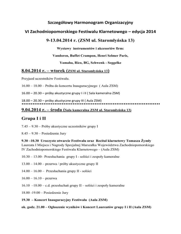 Szczegółowy Harmonogram Organizacyjny VI Zachodniopomorskiego Festiwalu Klarnetowego – edycja 2014 9-13.04.2014 r. (ZSM ul. Staromłyńska 13) Wystawy instrumentów i akcesoriów firm: Vandoren, Buffet Crampon, Henri Selmer Paris, Yamaha, Rico, BG, Schwenk - Seggelke 8.04.2014 r. – wtorek (ZSM ul. Staromłyńska 13) Przyjazd uczestników Festiwalu. 16.00 – 18.00 – Próba do koncertu Inauguracyjnego ( Aula ZSM) 16.00 – 20.30 – próby akustyczne grupy I i II ( Sala kameralna ZSM) 18.00 – 20.30 – próby akustyczne grupy III ( Aula ZSM) 9.04.2014 r. – środa (Sala kameralna ZSM ul. Staromłyńska 13) Grupa I i II 7.45 – 9.30 – Próby akustyczne uczestników grupy I 8.45 – 9.30 – Posiedzenie Jury 9.30 –10.30 Uroczyste otwarcie Festiwalu oraz Recital klarnetowy Tomasza Żymły Laureata I Miejsca i Nagrody Specjalnej Marszałka Województwa Zachodniopomorskiego IV Zachodniopomorskiego Festiwalu Klarnetowego – (Aula ZSM) 10.30 – 13.00– Przesłuchania grupy I - soliści i zespoły kameralne 13.00 – 14.00 – przerwa / próby akustyczne grupy II 14.00 – 16.00 – Przesłuchania grupy II - soliści 16.00 – 16.10 – przerwa 16.10 –18.00 – c.d. przesłuchań grupy II – soliści i zespoły kameralne 18.00 -19.00 – Posiedzenie Jury 19.30 – Koncert Inauguracyjny Festiwalu (Aula ZSM) ok. godz. 21.00 – Ogłoszenie wyników i Koncert Laureatów grupy I i II (Aula ZSM) 9.04.2014 r. – środa (Aula ZSM ul. Staromłyńska 13) Grupa III 7.00 – 9.00 – Próby akustyczne grupy III ( występ w godz. 10.30 – 13.00) 8.45 – 9.30 – Posiedzenie Jury 9.30 –10.30 Uroczyste otwarcie Festiwalu oraz Recital klarnetowy Tomasza Żymły Laureata I Miejsca i Nagrody Specjalnej Marszałka Województwa Zachodniopomorskiego IV Zachodniopomorskiego Festiwalu Klarnetowego 10.30 – 13.00 – Przesłuchania grupy III – soliści 13.00 – 14.00 - przerwa / próby akustyczne grupy III (występ w godz. 14.00 – 16.00) 14.00 – 16.00 – c.d. przesłuchań grupy III – soliści 16.00 – 17.00 – przerwa 17.00 – 18.00 – Wykład nt. „Eksploatacja, konserwacja i naprawa instrumentów” - Piotr Śmietana 18.00 – 19.30 – Rezerwacja sali – próba przed Koncertem Inauguracyjnym 19.30 – Koncert Inauguracyjny Festiwalu (Aula ZSM) ok. godz. 21.00 – Ogłoszenie wyników i Koncert Laureatów grupy I i II (Aula ZSM) 10.04.2014 r. - czwartek (Aula ZSM ul. Staromłyńska 13) Grupa III 8.00 – 9.30 – Próby akustyczne grupy III – soliści i zespoły kameralne 9.00 – 10.00 – Posiedzenie Jury 10.00 – 11.30 – c.d. przesłuchań grupy III – soliści 12.00 – 13.00 – Wykład - mgr Dariusz Egielman ( Sala rytmiczno – kameralna ZSM) 13.00 – 14.00 – przerwa / próby akustyczne zespoły kameralne 14.00 – 15.00 – c.d. przesłuchań grupy III – zespoły kameralne 15.00 – 16.00 – Posiedzenie Jury 16.00- 17.00 - Wykład - dr hab. Jan Jakub Bokun ( Sala kameralna ZSM) 17.00 – 18.30 – Master Class – prof. Guy Dangain ( Aula ZSM) 19.30 – Koncert Gwiazdy Festiwalu (13 Muz, Plac Żołnierza Polskiego 2) ok. godz. 21.00 - Ogłoszenie wyników i Koncert Laureatów grupy III (Aula ZSM) 11.04.2014 r. - piątek (Aula ZSM ul. Staromłyńska 13) Grupa IV 7.00. – 9.00 – Próby akustyczne grupy IV- soliści (występ w godz. 9.00 – 11.30) 8.30 – 9.00 – Posiedzenie Jury 9.00 – 11.30 – Przesłuchania grupy IV – soliści 9.30 – 11.00 – Warsztaty klarnetowe dla uczniów i nauczycieli - lekcje otwarte prof. Mieczysław Stachura ( Sala Kameralna ZSM) 11.00 – 12.00 – Pokaz multimedialny – RICO (Sala Kameralna ZSM) 11.30 – 12.00 - Próby akustyczne grupy IV- soliści (występ w godz. 12.00 – 13.00) 12.00 – 13.00 – c.d. przesłuchań grupy IV – soliści 13.00 – 14.00 – Przerwa / próby akustyczne grupy IV – soliści (występ w godz. 14.00 – 17.00) 14.00 – 17.00 – c.d. przesłuchań grupy IV- soliści 19.00 – 21.30 – Koncert Symfoniczny (Filharmonia im. Mieczysława Karłowicza w Szczecinie) 12.04.2014 r. sobota (Aula ZSM ul. Staromłyńska 13) Grupa IV 8.00 – 9.30 – Próby akustyczne grupy IV – soliści (występ w godz. 10.00 – 11.30) 9.30 – 10.00 – Posiedzenie Jury 10.00 – 11.30 – Przesłuchania grupy IV – soliści 10.00 -12.00 - Wykład prof. Orlando Jacinto Garcia (Akademia Sztuki – pl. Orła Białego) 12.00 – 13.00 – Koncert południowy - Karel Dohnal – klarnet solo (Aula ZSM) 13.00 – 14.00 – Przerwa / próby akustyczne grupy IV – soliści (występ w godz. 14.00 - 16.15) 14.00 - 16.30– c. d. przesłuchań grupy IV – soliści 14.00 – 16.00 – Master Class – Riccardo Crocilla ( Sala Kameralna ZSM) 16.30 – 18.00 – Posiedzenie Jury 18.00 – 19.30 – Prezentacja firmy Yamaha (13 Muz , Plac Żołnierza Polskiego 2) 19.30 – Koncert przy świecach – 13 Muz Ok. 21.00 – Ogłoszenie wyników i Koncert Laureatów grupy IV (soliści) - Aula ZSM 13.04.2014 r. niedziela (Aula ZSM ul. Staromłyńska 13) Grupa IV 7.00 – 9.00 – Próby akustyczne grupy IV – zespoły kameralne 9.00 - 11.15 – Przesłuchania grupy IV – zespoły kameralne 11.15 – 12.00 – Posiedzenie Jury Ok. godz. 13.00 - Ogłoszenie wyników i Koncert Laureatów grupy IV - zespoły kameralne oraz oficjalne zakończenie Festiwalu.