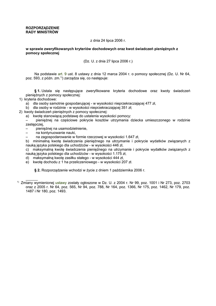 ROZPORZĄDZENIE RADY MINISTRÓW z dnia 24 lipca 2006 r. w sprawie zweryfikowanych kryteriów dochodowych oraz kwot świadczeń pieniężnych z pomocy społecznej (Dz. U. z dnia 27 lipca 2006 r.) Na podstawie art. 9 ust. 8 ustawy z dnia 12 marca 2004 r. o pomocy społecznej (Dz. U. Nr 64, poz. 593, z późn. zm.1)) zarządza się, co następuje: § 1. Ustala się następujące zweryfikowane kryteria dochodowe oraz kwoty świadczeń pieniężnych z pomocy społecznej: 1) kryteria dochodowe: a) dla osoby samotnie gospodarującej - w wysokości nieprzekraczającej 477 zł, b) dla osoby w rodzinie - w wysokości nieprzekraczającej 351 zł; 2) kwoty świadczeń pieniężnych z pomocy społecznej: a) kwotę stanowiącą podstawę do ustalenia wysokości pomocy: – pieniężnej na częściowe pokrycie kosztów utrzymania dziecka umieszczonego w rodzinie zastępczej, – pieniężnej na usamodzielnienie, – na kontynuowanie nauki, – na zagospodarowanie w formie rzeczowej w wysokości 1.647 zł, b) minimalną kwotę świadczenia pieniężnego na utrzymanie i pokrycie wydatków związanych z nauką języka polskiego dla uchodźców - w wysokości 446 zł, c) maksymalną kwotę świadczenia pieniężnego na utrzymanie i pokrycie wydatków związanych z nauką języka polskiego dla uchodźców - w wysokości 1.175 zł, d) maksymalną kwotę zasiłku stałego - w wysokości 444 zł, e) kwotę dochodu z 1 ha przeliczeniowego - w wysokości 207 zł. § 2. Rozporządzenie wchodzi w życie z dniem 1 października 2006 r. 1) ______ Zmiany wymienionej ustawy zostały ogłoszone w Dz. U. z 2004 r. Nr 99, poz. 1001 i Nr 273, poz. 2703 oraz z 2005 r. Nr 64, poz. 565, Nr 94, poz. 788, Nr 164, poz. 1366, Nr 175, poz. 1462, Nr 179, poz. 1487 i Nr 180, poz. 1493.