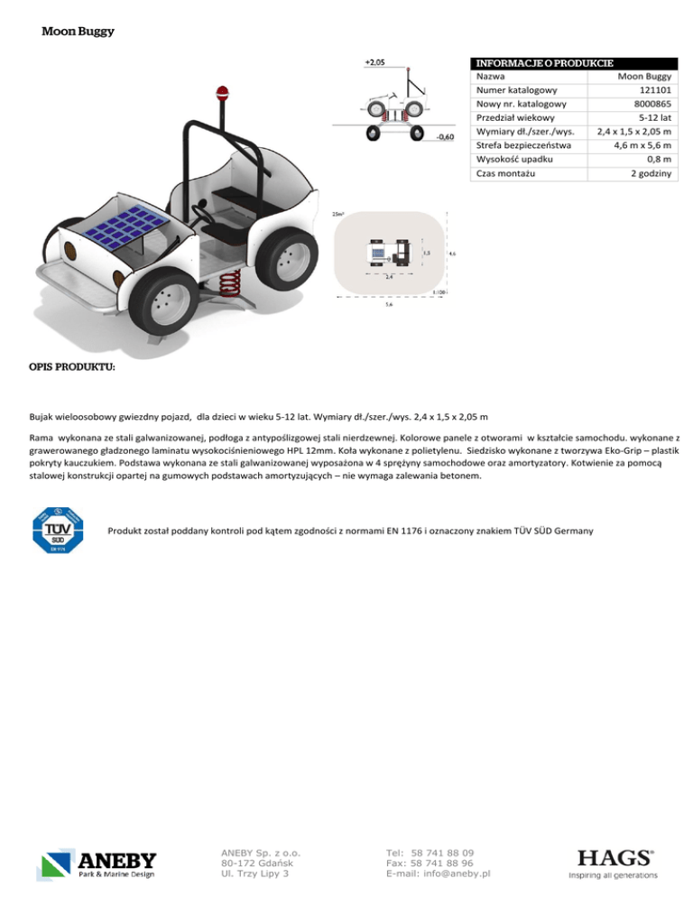 Nazwa Numer katalogowy Nowy nr. katalogowy Przedział wiekowy Wymiary dł./szer./wys. Strefa bezpieczeństwa Wysokość upadku Czas montażu Moon Buggy 121101 8000865 5-12 lat 2,4 x 1,5 x 2,05 m 4,6 m x 5,6 m 0,8 m 2 godziny Bujak wieloosobowy gwiezdny pojazd, dla dzieci w wieku 5-12 lat. Wymiary dł./szer./wys. 2,4 x 1,5 x 2,05 m Rama wykonana ze stali galwanizowanej, podłoga z antypoślizgowej stali nierdzewnej. Kolorowe panele z otworami w kształcie samochodu. wykonane z grawerowanego gładzonego laminatu wysokociśnieniowego HPL 12mm. Koła wykonane z polietylenu. Siedzisko wykonane z tworzywa Eko-Grip – plastik pokryty kauczukiem. Podstawa wykonana ze stali galwanizowanej wyposażona w 4 sprężyny samochodowe oraz amortyzatory. Kotwienie za pomocą stalowej konstrukcji opartej na gumowych podstawach amortyzujących – nie wymaga zalewania betonem. Produkt został poddany kontroli pod kątem zgodności z normami EN 1176 i oznaczony znakiem TÜV SÜD Germany ANEBY Sp. z o.o. 80-172 Gdańsk Ul. Trzy Lipy 3 Tel: 58 741 88 09 Fax: 58 741 88 96 E-mail: [email protected]