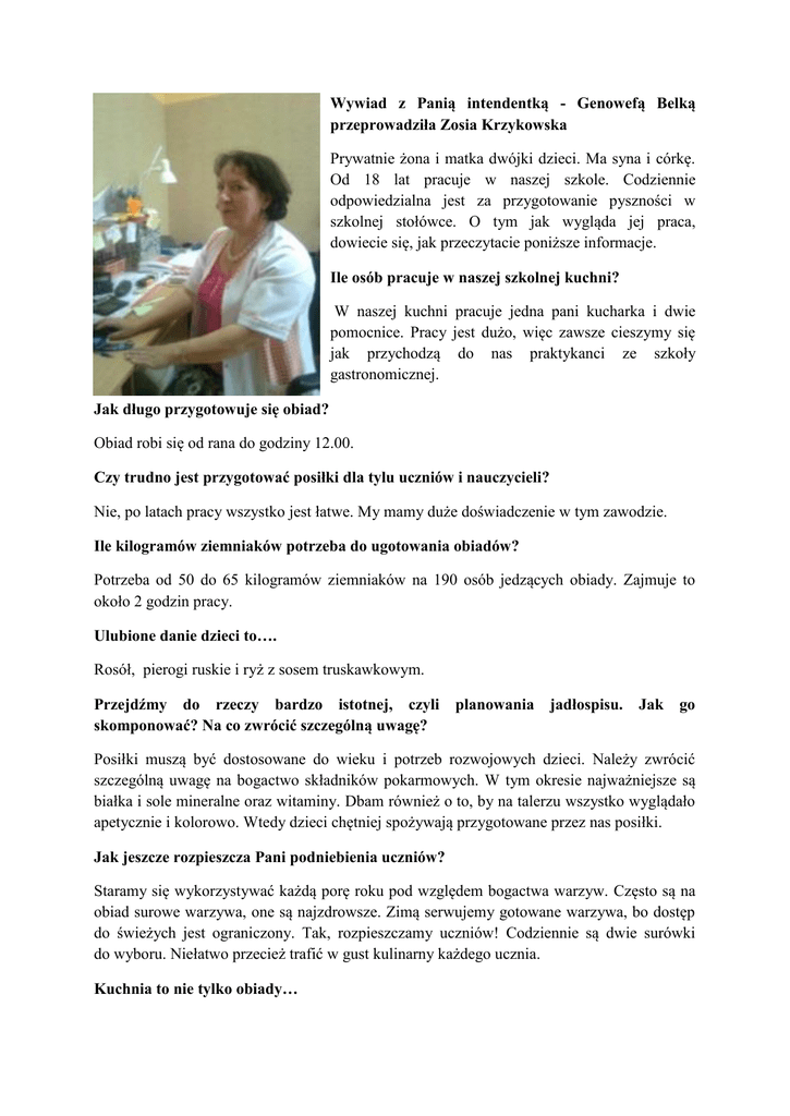 Wywiad z Panią intendentką - Genowefą Belką przeprowadziła Zosia Krzykowska Prywatnie żona i matka dwójki dzieci. Ma syna i córkę. Od 18 lat pracuje w naszej szkole. Codziennie odpowiedzialna jest za przygotowanie pyszności w szkolnej stołówce. O tym jak wygląda jej praca, dowiecie się, jak przeczytacie poniższe informacje. Ile osób pracuje w naszej szkolnej kuchni? W naszej kuchni pracuje jedna pani kucharka i dwie pomocnice. Pracy jest dużo, więc zawsze cieszymy się jak przychodzą do nas praktykanci ze szkoły gastronomicznej. Jak długo przygotowuje się obiad? Obiad robi się od rana do godziny 12.00. Czy trudno jest przygotować posiłki dla tylu uczniów i nauczycieli? Nie, po latach pracy wszystko jest łatwe. My mamy duże doświadczenie w tym zawodzie. Ile kilogramów ziemniaków potrzeba do ugotowania obiadów? Potrzeba od 50 do 65 kilogramów ziemniaków na 190 osób jedzących obiady. Zajmuje to około 2 godzin pracy. Ulubione danie dzieci to…. Rosół, pierogi ruskie i ryż z sosem truskawkowym. Przejdźmy do rzeczy bardzo istotnej, czyli skomponować? Na co zwrócić szczególną uwagę? planowania jadłospisu. Jak go Posiłki muszą być dostosowane do wieku i potrzeb rozwojowych dzieci. Należy zwrócić szczególną uwagę na bogactwo składników pokarmowych. W tym okresie najważniejsze są białka i sole mineralne oraz witaminy. Dbam również o to, by na talerzu wszystko wyglądało apetycznie i kolorowo. Wtedy dzieci chętniej spożywają przygotowane przez nas posiłki. Jak jeszcze rozpieszcza Pani podniebienia uczniów? Staramy się wykorzystywać każdą porę roku pod względem bogactwa warzyw. Często są na obiad surowe warzywa, one są najzdrowsze. Zimą serwujemy gotowane warzywa, bo dostęp do świeżych jest ograniczony. Tak, rozpieszczamy uczniów! Codziennie są dwie surówki do wyboru. Niełatwo przecież trafić w gust kulinarny każdego ucznia. Kuchnia to nie tylko obiady… Racja. Nasza szkoła przystąpiła kolejny raz do programów: „Owoce w szkole” i „Szklanka mleka”. Wyobraźcie sobie, że pierwszy program obejmuje 198 osób, zaś drugi 265 osób. To jednak nie wszystko. Nasze panie kucharki przygotowują 49 śniadań dla uczniów naszej szkoły. Są to bułeczki z wędliną i z sałatą. W swojej pracy lubi Pani… Przede wszystkim kontakt z ludźmi i tymi małymi, i tymi dużymi. W życiu prywatnym najbardziej lubię… Spędzać czas ze swoją rodziną. Członkom rodziny też Pani dogadza kulinarnie? Tak, o nich również dbam. Piekę im sama zdrowy chlebek. Gotuję pyszny rosołek, za którym sama też przepadam.