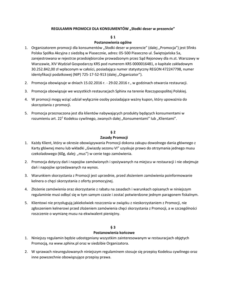REGULAMIN PROMOCJI DLA KONSUMENTÓW „Słodki deser w prezencie” §1 Postanowienia ogólne 1. Organizatorem promocji dla konsumentów „Słodki deser w prezencie” (dalej „Promocja”) jest Sfinks Polska Spółka Akcyjna z siedzibą w Piasecznie, adres: 05-500 Piaseczno ul. Świętojańska 5a, zarejestrowana w rejestrze przedsiębiorców prowadzonym przez Sąd Rejonowy dla m.st. Warszawy w Warszawie, XIV Wydział Gospodarczy KRS pod numerem KRS 0000016481, o kapitale zakładowym 30.252.842,00 zł wpłaconym w całości, posiadająca numer statystyczny REGON 472247798, numer identyfikacji podatkowej (NIP) 725-17-52-913 (dalej „Organizator”). 2. Promocja obowiązuje w dniach 15.02.2016 r. - 29.02.2016 r., w godzinach otwarcia restauracji. 3. Promocja obowiązuje we wszystkich restauracjach Sphinx na terenie Rzeczypospolitej Polskiej. 4. W promocji mogą wziąć udział wyłącznie osoby posiadające ważny kupon, który upoważnia do skorzystania z promocji. 5. Promocja przeznaczona jest dla klientów nabywających produkty będących konsumentami w rozumieniu art. 221 Kodeksu cywilnego, zwanych dalej „Konsumentami” lub „Klientami”. §2 Zasady Promocji 1. Każdy Klient, który w okresie obowiązywania Promocji dokona zakupu dowolnego dania głównego z Karty głównej menu lub wkładki „Gwiazdy sezonu VI” uzyskuje prawo do otrzymania jednego musu czekoladowego (60g, dalej: „mus”) w cenie tego zamówienia. 2. Promocja dotyczy dań i napojów zamówionych i spożywanych na miejscu w restauracji i nie obejmuje dań i napojów sprzedawanych na wynos. 3. Warunkiem skorzystania z Promocji jest uprzednie, przed złożeniem zamówienia poinformowanie kelnera o chęci skorzystania z oferty promocyjnej. 4. Złożenie zamówienia oraz skorzystanie z rabatu na zasadach i warunkach opisanych w niniejszym regulaminie musi odbyć się w tym samym czasie i zostać potwierdzone jednym paragonem fiskalnym. 5. Klientowi nie przysługują jakiekolwiek roszczenia w związku z nieskorzystaniem z Promocji, nie zgłoszeniem kelnerowi przed złożeniem zamówienia chęci skorzystania z Promocji, a w szczególności roszczenie o wymianę musu na ekwiwalent pieniężny. §3 Postanowienia końcowe 1. Niniejszy regulamin będzie udostępniany wszystkim zainteresowanym w restauracjach objętych Promocją, na www.sphinx.pl oraz w siedzibie Organizatora. 2. W sprawach nieuregulowanych niniejszym regulaminem stosuje się przepisy Kodeksu cywilnego oraz inne powszechnie obowiązujące przepisy prawa.