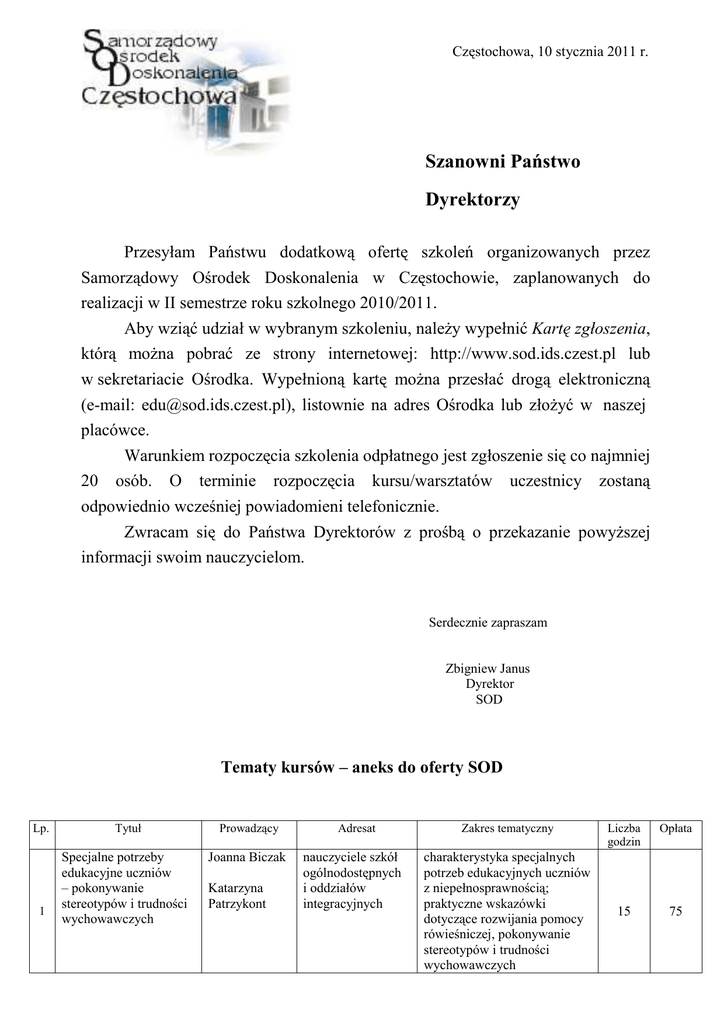 Częstochowa, 10 stycznia 2011 r. Szanowni Państwo Dyrektorzy Przesyłam Państwu dodatkową ofertę szkoleń organizowanych przez Samorządowy Ośrodek Doskonalenia w Częstochowie, zaplanowanych do realizacji w II semestrze roku szkolnego 2010/2011. Aby wziąć udział w wybranym szkoleniu, naleŜy wypełnić Kartę zgłoszenia, którą moŜna pobrać ze strony internetowej: http://www.sod.ids.czest.pl lub w sekretariacie Ośrodka. Wypełnioną kartę moŜna przesłać drogą elektroniczną (e-mail: [email protected]), listownie na adres Ośrodka lub złoŜyć w naszej placówce. Warunkiem rozpoczęcia szkolenia odpłatnego jest zgłoszenie się co najmniej 20 osób. O terminie rozpoczęcia kursu/warsztatów uczestnicy zostaną odpowiednio wcześniej powiadomieni telefonicznie. Zwracam się do Państwa Dyrektorów z prośbą o przekazanie powyŜszej informacji swoim nauczycielom. Serdecznie zapraszam Zbigniew Janus Dyrektor SOD Tematy kursów – aneks do oferty SOD Lp. 1 Tytuł Specjalne potrzeby edukacyjne uczniów – pokonywanie stereotypów i trudności wychowawczych Prowadzący Joanna Biczak Katarzyna Patrzykont Adresat nauczyciele szkół ogólnodostępnych i oddziałów integracyjnych Zakres tematyczny charakterystyka specjalnych potrzeb edukacyjnych uczniów z niepełnosprawnością; praktyczne wskazówki dotyczące rozwijania pomocy rówieśniczej, pokonywanie stereotypów i trudności wychowawczych Liczba godzin Opłata 15 75 2 3 4 Pomoc psychologicznopedagogiczna – praca z dziećmi z zaburzeniami zachowania Joanna Biczak Organizowanie indywidualnej pomocy psychologiczno -pedagogicznej na terenie przedszkola Twórcze wychowanie małego dziecka ElŜbieta Kurzynoga Danuta Lis ElŜbieta Kurzynoga Danuta Lis 5 6 7 8 Wykorzystanie usług i zasobów Internetu, opracowanie WebQuestów przedmiotowych Wybrane tańce narodowe i zabawy taneczne cz. 1 Budowanie atmosfery sprzyjającej nauce i wychowaniu Praca z uczniem o specjalnych potrzebach edukacyjnych na lekcjach języków obcych Alligator Flash Designer – tworzenie materiałów do zajęć edukacyjnych Anna Warzocha Anna Warzocha Urszula Brylewska Iwona SkrzypczykGałkowska ElŜbieta Majba Jacek Turlejski 9 „ABC tańca towarzyskiego. Podstawowe kroki wybranych tańców 10 towarzyskich” – cz. I. Emisja i higiena głosu 11 Grzegorz Papalski dr Małgorzata DawidziakKładoczna zainteresowani nauczyciele wszystkich typów szkół i placówek nauczyciele wychowania przedszkolnego przyczyny i przejawy zaburzeń w zachowaniu; oddziaływania terapeutyczne nauczyciela wobec ucznia z zaburzonym zachowaniem; model pracy z uczniem z zaburzonym zachowaniem w świetle nowych regulacji prawnych tworzenie zespołów wspierających dziecko z opinią, orzeczeniem i potrzebami specjalnymi nauczyciele wychowania przedszkolnego rozwijanie ekspresji słownej, muzycznej, ruchowej poprzez nowatorskie metody pracy nauczyciele edukacji wczesnoszkolnej praca w programie PowerPoint; portale edukacyjne; opracowanie i tworzenie WebQuestów nauczyciele edukacji wczesnoszkolnej nauka tańców narodowych: krakowiaka, poloneza; zabawy taneczne z piosenką zainteresowani nauczyciele wszystkich typów szkół i placówek komunikacja interpersonalna; aktywizujące metody współpracy nauczyciela z innymi podmiotami szkoły; narzędzia budowy poŜądanego środowiska edukacyjnego techniki pracy z uczniem dyslektycznym, niedosłyszącym, z ADHD na lekcjach języka obcego nauczyciele języków obcych zainteresowani nauczyciele wszystkich typów szkół i placówek nauczyciele wychowania przedszkolnego, edukacji wczesnoszkolnej, muzyki, zainteresowani nauczyciele zainteresowani nauczyciele wszystkich typów szkół i placówek Alligator Flash jako doskonały program do tworzenia animacji, stron www, materiałów interaktywnych do lekcji i innych prac w technologii Flash – niezrównana prostota obsługi, potęŜne moŜliwości podział tańców towarzyskich i ich ogólna charakterystyka; nauka podstawowych kroków wybranych tańców towarzyskich ćwiczenia artykulacyjne; wykształcenie prawidłowego oddechu; ćwiczenia narządów mowy; ekspresja mowy 10 50 20 100 15 75 20 100 15 105 5 20 6 30 12 60 6 40 10 60