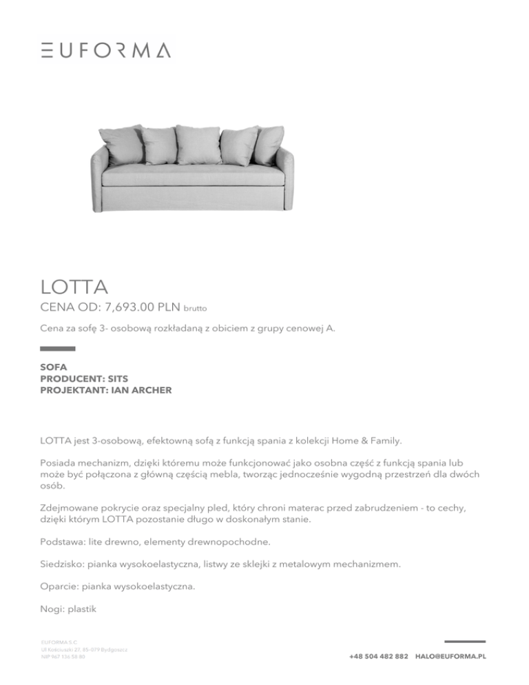 LOTTA CENA OD: 7,693.00 PLN brutto Cena za sofę 3- osobową rozkładaną z obiciem z grupy cenowej A. SOFA PRODUCENT: SITS PROJEKTANT: IAN ARCHER LOTTA jest 3-osobową, efektowną sofą z funkcją spania z kolekcji Home & Family. Posiada mechanizm, dzięki któremu może funkcjonować jako osobna część z funkcją spania lub może być połączona z główną częścią mebla, tworząc jednocześnie wygodną przestrzeń dla dwóch osób. Zdejmowane pokrycie oraz specjalny pled, który chroni materac przed zabrudzeniem - to cechy, dzięki którym LOTTA pozostanie długo w doskonałym stanie. Podstawa: lite drewno, elementy drewnopochodne. Siedzisko: pianka wysokoelastyczna, listwy ze sklejki z metalowym mechanizmem. Oparcie: pianka wysokoelastyczna. Nogi: plastik Obicie: szeroki wybór tkanin. Powered by TCPDF (www.tcpdf.org)