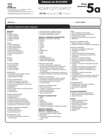 Odesłaç do 20.10.2015 Targi w Krakowie Sp. z o.o., 31-586 Kraków, ul. Galicyjska 9 tel. +12 6519028; 6445932, fax +12 6446141 e-mail: [email protected], www.kompozyty.krakow.pl KRS 0000192313 Sàd Rejonowy dla Krakowa ÂródmieÊcia w Krakowie XI Wydzia∏ Gospodarczy Krajowego Rejestru Sàdowego, NIP 676-10-50-090 KOMPOZYT-EXPO® 25-26 listopada 2015, Kraków Grupy towarowe 5a Wystawca:................................................................................................................................................................................. Numer stoiska: ............................... Prosimy o zaznaczenie zakresu ekspozycji SUROWCE WŁÓKNA włókna szklane włókna węglowe włókna naturalne włókna metalowe aramidy ŻYWICE żywice poliestrowe żywice epoksydowe żywice winyloestrowe żywice fenolowe żywice poliuretanowe żywice termoutwardzalne żywice termoplastyczne silikon ŻELKOTY żelkoty topkoty KLEJE, KITY, SPOIWA środki adhezyjne środki klejące środki zwilżające środki smarujące WYPEŁNIACZE proszek (talk, mika, węglan wapnia, krzemionka, tlenek glinu) granulki (mikro & makro) DODATKI, MODYFIKATORY środki pomocnicze przy obróbce środki do modyfikacji właściwości surowce do produkcji farb, tuszy, spoiw przyspieszacze katalizatory farby, emaile, lakiery, barwniki, pigmenty utwardzacze nanocząsteczki OSNOWY KOMPOZYTOWE powłoki proszkowe powłoki płynne powłoki z tworzyw sztucznych powłoki przemysłowe plazmowe środki do obróbki powierzchniowej nitrowanie i polimeryzacja plazmowa piaskowanie i czyszczenie na mokro MATERIAŁY JĄDROWE/ RDZENIOWE struktury piankowe struktury plastra miodu materiały naturalne PRZETWÓRSTWO GUMY materiały, komponenty, mieszanki wzmacniające .................................... data środki chemiczne, dodatki do gumy technologie do przetwórstwa gumy produkty i półfabrykanty z gumy PRODUKTY POÂREDNIE KOMPOZYTOWE MATERIAŁY WYKONANE W PROCESIE PULTRUZJI tkaniny maty taśmy rowing sploty liny kszta∏towniki siatki pr´ty PREPREGI NANOKOMPOZYTY PANELE SANDWICZOWE STRUKTURY HYBRYDOWE KOMPOZYTY METALOWE wyroby z kompozytów metalowych fazy zbrojące dla kompozytów metalowych (proszki, włókna, preformy ceramiczne), procesy wytwórcze, narzędzia i maszyny do ich realizacji metody badawcze kompozytów metalowych recykling metalowych materiałów kompozytów KOMPOZYTY CERAMICZNE komponenty w postaci proszków i włókien technologie otrzymywania kompozytów kompozyty wysokotemperaturowe nanokompozyty KOMPOZYTY KONSTRUKCYJNE beton wzmocniony naprawa i zabezpieczenia betonu posadzki przemysłowe wzmocnienia konstrukcji kleje/ uszczelniacze PRODUKTY KOMPOZYTOWE płyty rury profile pojemniki elementy formowane elementy budowlane produkty dla użytkowych dziedzin przemysłu MASZYNY, NARZ¢DZIA, PRODUKTY POMOCNICZNE PRODUKCJA I OBRÓBKA WŁÓKIEN piece do produkcji i obróbki włókien przewijarki maszyny do produkcji, impregnacji i cięcia tkanin inne ......................................................... piecz´ç firmy FORMY formy metalowe, kompozytowe pasty do modelowania i polerowania uszczelniacze i powłoki sprzęt do konserwacji i czyszczenia form adherenty PRODUKCJA I OBRÓBKA ŻYWIC systemy dozujące, mieszalniki maszyny, materiały i narzędzia do impregnacji MASZYNY I NARZĘDZIA rozpylacze, wtryskiwarki, wytłaczarki wyciskarki do klejów autoklawy maszyny do kształtowania wstępnego maszyny do wytwarzania komponentów włóknistych maszyny do nawijania włókien maszyny do prasowania ciągłego maszyny do odlewania odśrodkowego maszyny RTM maszyny i narzędzia do formowania kontaktowego maszyny do formowania bezpośredniego maszyny do szybkiego prototypowania narzędzia z ostrzami z materiałów supertwardych narzędzia do obróbki materiałów kompozytowych narzędzia do pultruzji, tłoczenia i prasowania urządzenia pomiarowe do badań i kontroli jakości żelkociarki OPROGRAMOWANIE projektowanie, wzornictwo, kalkulacja modelowanie i symulacja baza danych materiałów inne OCHRONA ÂRODOWISKA sprzęt do czyszczenia pomieszczeń sprzęt zapewniajacy bezpieczeństwo odzież ochronna USŁUGI obróbka CNC kompozytów usługi recyklingowe organizacje normalizujące wzornictwo przemysłowe badania i rozwój usługi doradcze, szkolenia wydawnictwa Internet .................................................................................. podpis osoby upowa˝nionej do zawierania umów