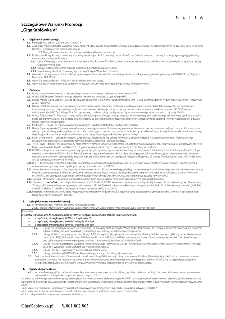 Szczegółowe Warunki Promocji „GigaKablówka V” 1. Ogólne warunki Promocji 1.1. Promocja trwa od 24.10.2016 r. do 31.12.2017 r. 1.2. Z Promocji może skorzystać wyłącznie Nowy Abonent, który zawrze z Operatorem Umowę o świadczenie usług telekomunikacyjnych na czas określony 24 pełnych Okresów Rozliczeniowych obejmującą Usługi: 1.2.1. Usługa Internetowa łącznie z usługą dodatkową Bezpieczny Internet 1.3. Dodatkowo Nowy Abonent zawierający Umowę określoną w pkt 1.2. powyżej, ma możliwość zamówienia w ramach Umowy Promocyjnej następujących Usług na warunkach niniejszej Promocji: 1.3.1. Usługa Telewizyjna w wariancie o minimalnej wartości Pakietów TV 35,00 zł./mies. w wariancie Pakiet Standard lub w wariancie Pakiet Extra łącznie z Usługą GigaNagrywarka, albo 1.3.2. Usługa Telefoniczna łącznie z usługą dodatkową Identyfikacja Numeru, albo 1.3.3. Innych usług określonych w niniejszych Szczegółowych Warunkach Promocji. 1.4. Warunkiem skorzystania z niniejszej Promocji jest wyrażenie w Umowie Promocyjnej zgody na weryfikację wiarygodności płatniczej w KRD BIG SA oraz Rejestrze Dłużników ERIF BIGSA. 1.5. Wszystkie ceny podane w niniejszym dokumencie są cenami brutto. 1.6. Wszystkie opłaty abonamentowe podane w niniejszym dokumencie dotyczą jednego Okresu Rozliczeniowego. 2. Definicje 2.1. Usługa Internetowa (Internet) – usługa stałego dostępu do internetu realizowana w technologii HFC. 2.2. Usługa Telefoniczna (Telefon) – usługa głosowa, realizowana w oparciu o technologię HFC. 2.3. Usługa Mobila (Netia Mobile) – usługa obejmująca połączenia telefoniczne, usługi przesyłania SMS i usługi transmisji danych (w tym przesyłanie MMS) realizowana w sieci ruchomej. 2.4. Usługa HBO GO – usługa telewizji kablowej, umożliwiająca dostęp do kanału HBO wraz z możliwością korzystania z biblioteki filmów HBO GO poprzez sieć internetową, np. z wykorzystaniem przeglądarki internetowej. Aktywacja Usługi następuje poprzez rejestrację użytkownika w serwisie HBO GO, którego właścicielem jest HBO Česká Republika. Do poprawnego działania Usługi niezbędne jest łącze internetowe o przepustowości co najmniej 2 Mb/s. 2.5. Usługa Telewizyjna (TV, Telewizja) – usługa telewizji kablowej umożliwiająca dostęp do programów telewizyjnych, wybranych przez Abonenta zgodnie z aktualną ofertą programową Operatora, poprzez sieć internetową za pośrednictwem Urządzenia Netia Player. Do poprawnego działania Telewizji niezbędna jest aktywna Usługa Internetowa Operatora. 2.6. Multiroom – Usługa Telewizyjna świadczona na drugim Urządzeniu Netia Player na tym samym łączu. 2.7. Usługa GigaNagrywarka (GigaNagrywarka) – usługa polegająca na umożliwieniu nagrywania i odtwarzania przez Abonentów, będących osobami fizycznymi, na własny użytek osobisty, wskazanych przez nich treści telewizyjnych poprzez uaktywnienie funkcji urządzenia Netia Player. Szczegółowe zasady świadczenia Usługi GigaNagrywarka zawarte są w „Zasadach świadczenia Usługi GigaNagrywarka” dostępnych na netia.pl. 2.8. Pakiet Usług (Pakiet) – Usługa Internetowa wraz z Usługą Telefoniczną lub Usługą Telewizyjną, zakupione łącznie na warunkach niniejszej Promocji; Usługi świadczone są przez Operatora pod tym samym adresem, za pomocą tego samego łącza. 2.9. Netia Player – dekoder TV, udostępniony Abonentowi w ramach Umowy o świadczenie usług telekomunikacyjnych w celu korzystania z Usługi Telewizyjnej. Netia Player umożliwia dostęp do dodatkowych usług oraz aplikacji świadczonych przez podmioty trzecie (firmy zewnętrzne). 2.10. GO ON – usługa serwisu muzycznego oferującego muzykę na żądanie poprzez sieć internetową na komputerach, telewizorach, tabletach i smartfonach. Usługa oferowana w wariancie GO ON – Pakiet Pełny aktywowana jest na wskazany w pkt 1.2. okres obowiązywania Umowy Promocyjnej i pozwala na nielimitowane odsłuchiwanie utworów. Usługę należy aktywować przez aplikację e-sklep, dostępną pod adresem e-sklep.netia.pl. Usługa świadczona jest przez GO ON Sp. z o.o., 02-508 Warszawa, ul. Puławska 41 lokal 3. 2.11. HFC – technologia świadczenia przez Operatora Usług, realizowanych na hybrydowej sieci CATV wykorzystującej systemy światłowodowe i koncentryczne, z zastosowaniem cyfrowej transmisji danych opartej na standardzie EuroDOCSIS.. 2.12. Nowy Abonent – Abonent, który nie posiadał w okresie ostatnich 30 dni poprzedzających datę startu niniejszej Promocji oraz nie posiada aktualnie obowiązującej Umowy w zakresie Usługi, na którą ma być zawarta nowa Umowa. Nowa Umowa nie może być zawarta na ten sam adres instalacji Usługi, w którym w okresie ostatnich 30 dni poprzedzających datę startu niniejszej Promocji świadczona była Usługa, na którą ma być zawarta nowa Umowa. 2.13. Umowa Promocyjna – Umowa na warunkach promocyjnych określonych w niniejszych Szczegółowych Warunkach Promocji. 2.14. Operator – Netia S.A., z siedzibą w Warszawie przy ul. Poleczki 13, 02-822 Warszawa, zarejestrowana w Sądzie Rejonowym dla m.st. Warszawy, Sąd Gospodarczy, XIII Wydział Krajowego Rejestru Sądowego, pod numerem KRS 0000041649, o kapitale zakładowym w wysokości 348 348 161 PLN opłaconym w całości, NIP 52602-05-575, REGON 011566374, świadcząca usługi w technologii HFC, GSM/UMTS; 2.15. Pozostałe terminy pisane wielką literą mają znaczenie określone w Regulaminie Świadczenia Usług przez Spółki Grupy Netia oraz w Cennikach poszczególnych Usług dostępnych w ramach Promocji. Usługi dostępne w ramach Promocji 3.1. W ramach niniejszej Promocji oferujemy następujące Usługi: 3.1.1. Usługę Internetową w wariancie Szybki Internet Max 20, Szybki Internet Max 100 lub Szybki Internet Max 300. Komentarz: Internet w wariancie MAX to najszybszy możliwy internet na łączu, gwarantujący stabilne korzystanie z Usługi: z pręd