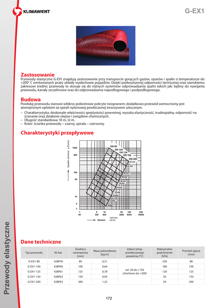 G-EX1 Zastosowanie Przewody elastyczne G-EX1 znajdują zastosowanie przy transporcie gorących gazów, oparów i spalin o temperaturze do +200° C emitowanych przez układy wydechowe pojazdów. Dzięki podwyższonej odporności termicznej oraz szerokiemu zakresowi średnic przewody te stosuje się do różnych systemów odprowadzania spalin takich jak: bębny do nawijania przewodu, kanały szczelinowe oraz do odprowadzania napodłogowego i podpodłogowego. Budowa Powłokę przewodu stanowi włókno poliestrowe pokryte neopranem; dodatkowo przewód wzmocniony jest zewnętrznym oplotem ze spirali nylonowej powleczonej tworzywem sztucznym. – Charakterystyka: doskonałe właściwości sprężystości powrotnej, wysoka elastyczność, trudnopalny, odporność na ścieranie oraz działanie olejów i związków chemicznych. – Długość standardowa: 10 m, 12 m. – Kolor: ścianka przewodu – czarny, spirala – czerwony. Przewody elastyczne Charakterystyki przepływowe Dane techniczne Typ przewodu Nr kat. Średnica wewnętrzna [mm] Masa jednostkowa [kg/m] Zakres temp. przetłaczanego powietrza [°C] Maksymalne podciśnienie [hPa] Promień gięcia [mm] G-EX1-80 428P59 80 0,51 230 80 G-EX1-100 428P60 100 0,64 180 100 G-EX1-125 428P61 125 0,78 120 125 G-EX1-150 428P62 150 0,93 50 150 G-EX1-200 428P63 200 1,22 20 200 172 od -20 do +150 (chwilowo do +200)