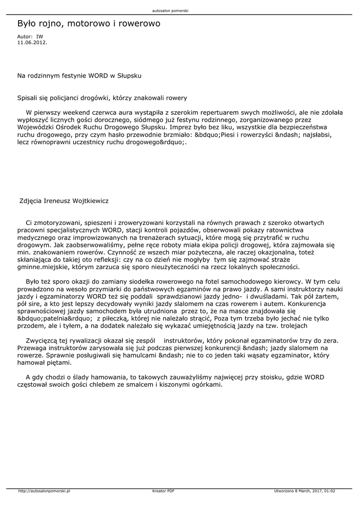 autosalon pomorski Było rojno, motorowo i rowerowo Autor: IW 11.06.2012. Na rodzinnym festynie WORD w Słupsku Spisali się policjanci drogówki, którzy znakowali rowery W pierwszy weekend czerwca aura wystąpiła z szerokim repertuarem swych możliwości, ale nie zdołała wypłoszyć licznych gości dorocznego, siódmego już festynu rodzinnego, zorganizowanego przez Wojewódzki Ośrodek Ruchu Drogowego Słupsku. Imprez było bez liku, wszystkie dla bezpieczeństwa ruchu drogowego, przy czym hasło przewodnie brzmiało: „Piesi i rowerzyści – najsłabsi, lecz równoprawni uczestnicy ruchu drogowego”. Zdjęcia Ireneusz Wojtkiewicz Ci zmotoryzowani, spieszeni i zroweryzowani korzystali na równych prawach z szeroko otwartych pracowni specjalistycznych WORD, stacji kontroli pojazdów, obserwowali pokazy ratownictwa medycznego oraz improwizowanych na trenażerach sytuacji, które mogą się przytrafić w ruchu drogowym. Jak zaobserwowaliśmy, pełne ręce roboty miała ekipa policji drogowej, która zajmowała się min. znakowaniem rowerów. Czynność ze wszech miar pożyteczna, ale raczej okazjonalna, toteż skłaniająca do takiej oto refleksji: czy na co dzień nie mogłyby tym się zajmować straże gminne.miejskie, którym zarzuca się sporo nieużyteczności na rzecz lokalnych społeczności. Było też sporo okazji do zamiany siodełka rowerowego na fotel samochodowego kierowcy. W tym celu prowadzono na wesoło przymiarki do państwowych egzaminów na prawo jazdy. A sami instruktorzy nauki jazdy i egzaminatorzy WORD też się poddali sprawdzianowi jazdy jedno- i dwuśladami. Tak pół żartem, pół sire, a kto jest lepszy decydowały wyniki jazdy slalomem na czas rowerem i autem. Konkurencja sprawnościowej jazdy samochodem była utrudniona przez to, że na masce znajdowała się „patelnia” z piłeczką, której nie należało strącić, Poza tym trzeba było jechać nie tylko przodem, ale i tyłem, a na dodatek należało się wykazać umiejętnością jazdy na tzw. trolejach Zwycięzcą tej rywalizacji okazał się zespól instruktorów, który pokonał egzaminatorów trzy do zera. Przewaga instruktorów zarysowała się już podczas pierwszej konkurencji – jazdy slalomem na rowerze. Sprawnie posługiwali się hamulcami – nie to co jeden taki wąsaty egzaminator, który hamował piętami. A gdy chodzi o ślady hamowania, to takowych zauważyliśmy najwięcej przy stoisku, gdzie WORD częstował swoich gości chlebem ze smalcem i kiszonymi ogórkami. http://autosalonpomorski.pl Kreator PDF Utworzono 8 March, 2017, 01:02