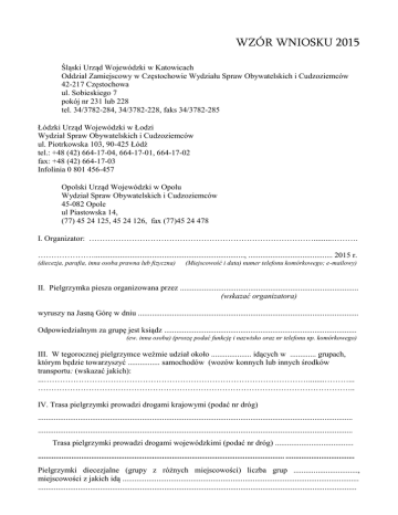 WZÓR WNIOSKU 2015 Śląski Urząd Wojewódzki w Katowicach Oddział Zamiejscowy w Częstochowie Wydziału Spraw Obywatelskich i Cudzoziemców 42-217 Częstochowa ul. Sobieskiego 7 pokój nr 231 lub 228 tel. 34/3782-284, 34/3782-228, faks 34/3782-285 Łódzki Urząd Wojewódzki w Łodzi Wydział Spraw Obywatelskich i Cudzoziemców ul. Piotrkowska 103, 90-425 Łódź tel.: +48 (42) 664-17-04, 664-17-01, 664-17-02 fax: +48 (42) 664-17-03 Infolinia 0 801 456-457 Opolski Urząd Wojewódzki w Opolu Wydział Spraw Obywatelskich i Cudzoziemców 45-082 Opole ul Piastowska 14, (77) 45 24 125, 45 24 126, fax (77)45 24 478 I. Organizator: ………………………………………………………………………….........………. …………………..........................................................................., .......................................... 2015 r. (diecezja, parafia, inna osoba prawna lub fizyczna) (Miejscowość i data) numer telefonu komórkowego; e-mailowy) II. Pielgrzymka piesza organizowana przez ......................................................................................... (wskazać organizatora) wyruszy na Jasną Górę w dniu .............................................................................................................. Odpowiedzialnym za grupę jest ksiądz ................................................................................................ (ew. inna osoba) (proszę podać funkcję i nazwisko oraz nr telefonu np. komórkowego) III. W tegorocznej pielgrzymce weźmie udział około .................... idących w ............. grupach, którym będzie towarzyszyć ................ samochodów (wozów konnych lub innych środków transportu: (wskazać jakich): ...………………………………………………………………………………………........………... ……………………………………………………………………………………………………….. IV. Trasa pielgrzymki prowadzi drogami krajowymi (podać nr dróg) ............................................................................................................................................................. ............................................................................................................................................................. Trasa pielgrzymki prowadzi drogami wojewódzkimi (podać nr dróg) ....................................... ............................................................................................................................. ................................... Pielgrzymki diecezjalne (grupy z różnych miejscowości) liczba grup ................................, miejscowości z jakich idą ...................................................................................................................... ............................................................................................................................................................... ................................................................................................................................................................ ................................................................................................................................................................ łączna szacunkowa liczba uczestników: ..........................................., miejsce połączenia wszystkich grup: ...................................................................................................................................................... ................................................................................................................................................................ V. Trasa tegorocznej pielgrzymki prowadzić będzie przez następujące miejscowości: b. istotne jest załączenie do niniejszego wykazu szczegółowej mapki całej trasy oraz przedstawienie jej dokładnego kalendarza – przez wskazanie dat i odpowiadających im odcinków marszu, w tym wypunktowanie pokonywanych miejscowości etapowych, zaś w ich obszarach – ulic, którymi przechodzić będzie pielgrzymka). Należy także w ramach kalendarza pielgrzymki określić miejscowości oraz miejsca postojów i noclegów – np.): 1 dzień .................................................................................................................................................. (punkty etapowe trasy - data - godz. pobytu - nocleg) .... dzień ............................................................................................................................................... (punkty etapowe trasy - data - godz. pobytu - nocleg) .... dzień ............................................................................................................................................... (data i miejsce wejścia grupy na teren województwa śląskiego-miejscowości, ulice przejścia, nocleg) Na ostatnim etapie pielgrzymka wejdzie do Częstochowy trasą nr ................................................ w dniu .............................................................................. o godzinie ................................................. . Miejsce odpoczynku grupy w granicach Częstochowy przed wejściem na Jasną Górę: ……………………………………………………………………………………………………...…. (dokładanie określić miejsce ostatniego postoju, nr trasy wejścia do Sanktuarium Jasnogórskiego) Gdy pielgrzymka kończy się na Jasnej Górze i nie planuje się wspólnego powrotu, a pielgrzymi wracać będą do domów indywidualnie – fakt ten należy również wyraźnie wyeksponować. Pielgrzymi wracają do swej miejscowości w dniu .............................................................................. w grupie zorganizowanej pieszo, ul. Częstochowy: ……………