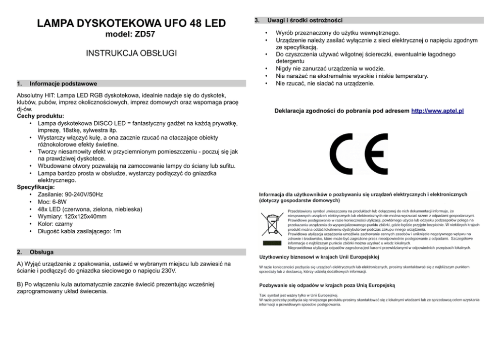 LAMPA DYSKOTEKOWA UFO 48 LED 1. Uwagi i środki ostrożności model: ZD57 • • INSTRUKCJA OBSŁUGI • Informacje podstawowe Absolutny HIT: Lampa LED RGB dyskotekowa, idealnie nadaje się do dyskotek, klubów, pubów, imprez okolicznościowych, imprez domowych oraz wspomaga pracę dj-ów. Cechy produktu: • Lampa dyskotekowa DISCO LED = fantastyczny gadżet na każdą prywatkę, imprezę, 18stkę, sylwestra itp. • Wystarczy włączyć kulę, a ona zacznie rzucać na otaczające obiekty różnokolorowe efekty świetlne. • Tworzy niesamowity efekt w przyciemnionym pomieszczeniu - poczuj się jak na prawdziwej dyskotece. • Wbudowane otwory pozwalają na zamocowanie lampy do ściany lub sufitu. • Lampa bardzo prosta w obsłudze, wystarczy podłączyć do gniazdka elektrycznego. Specyfikacja: • Zasilanie: 90-240V/50Hz • Moc: 6-8W • 48x LED (czerwona, zielona, niebieska) • Wymiary: 125x125x40mm • Kolor: czarny • Długość kabla zasilającego: 1m 2. 3. Obsługa A) Wyjąć urządzenie z opakowania, ustawić w wybranym miejscu lub zawiesić na ścianie i podłączyć do gniazdka sieciowego o napięciu 230V. B) Po włączeniu kula automatycznie zacznie świecić prezentując wcześniej zaprogramowany układ świecenia. • • • Wyrób przeznaczony do użytku wewnętrznego. Urządzenie należy zasilać wyłącznie z sieci elektrycznej o napięciu zgodnym ze specyfikacją. Do czyszczenia używać wilgotnej ściereczki, ewentualnie łagodnego detergentu Nigdy nie zanurzać urządzenia w wodzie. Nie narażać na ekstremalnie wysokie i niskie temperatury. Nie rzucać, nie siadać na urządzenie. Deklaracja zgodności do pobrania pod adresem http://www.aptel.pl