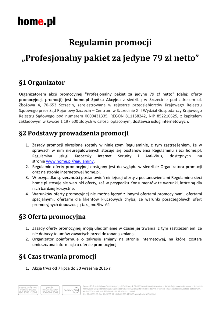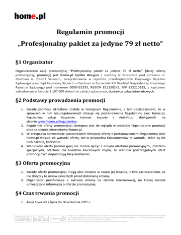 Regulamin promocji „Profesjonalny pakiet za jedyne 79 zł netto” §1 Organizator Organizatorem akcji promocyjnej "Profesjonalny pakiet za jedyne 79 zł netto" (dalej: oferty promocyjnej, promocji) jest home.pl Spółka Akcyjna z siedzibą w Szczecinie pod adresem ul. Zbożowa 4, 70-653 Szczecin, zarejestrowana w rejestrze przedsiębiorców Krajowego Rejestru Sądowego przez Sąd Rejonowy Szczecin – Centrum w Szczecinie XIII Wydział Gospodarczy Krajowego Rejestru Sądowego pod numerem 0000431335, REGON 811158242, NIP 852210325, z kapitałem zakładowym w kwocie 1 197 600 złotych w całości opłaconym, dostawca usług internetowych. §2 Podstawy prowadzenia promocji 1. Zasady promocji określone zostały w niniejszym Regulaminie, z tym zastrzeżeniem, że w sprawach w nim nieuregulowanych stosuje się postanowienia Regulaminu sieci home.pl, Regulaminu usługi Kaspersky Internet Security i Anti-Virus, dostępnych na stronie www.home.pl/regulaminy. 2. Regulamin oferty promocyjnej dostępny jest do wglądu w siedzibie Organizatora promocji oraz na stronie internetowej home.pl. 3. W przypadku sprzeczności postanowień niniejszej oferty z postanowieniami Regulaminu sieci home.pl stosuje się warunki oferty, zaś w przypadku Konsumentów te warunki, które są dla nich bardziej korzystne. 4. Warunków oferty promocyjnej nie można łączyć z innymi ofertami promocyjnymi, ofertami specjalnymi, ofertami dla klientów kluczowych chyba, że warunki poszczególnych ofert promocyjnych dopuszczają taką możliwość. §3 Oferta promocyjna 1. Zasady oferty promocyjnej mogą ulec zmianie w czasie jej trwania, z tym zastrzeżeniem, że nie dotyczy to umów zawartych przed dokonaną zmianą. 2. Organizator poinformuje o zakresie zmiany na stronie internetowej, na której została umieszczona informacja o ofercie promocyjnej. §4 Czas trwania promocji 1. Akcja trwa od 7 lipca do 30 września 2015 r. 2. Za decydującą o udziale w promocji przyjmuje się datę zgłoszenia dokonaną przez stronę internetową Organizatora. 3. Organizator może zakończyć akcję promocyjną (wycofać ofertę) przed terminem określonym powyżej bez podania przyczyny, albo zaprzestać zawierania umów na warunkach określonych w regulaminie przez pewien z góry oznaczony czas. 4. W przypadku wprowadzenia nowej oferty promocyjnej w takim samym lub podobnym zakresie, dotychczasowa oferta promocyjna przestaje wiązać Organizatora, chyba, że ten postanowi inaczej. §5 Uczestnicy 1. Oferta promocyjna skierowana jest do osób fizycznych posiadających pełną zdolność do czynności prawnych, osób prawnych i jednostek organizacyjnych posiadających zdolność prawną, które w trakcie promocji: a. zaakceptowały niniejszy Regulamin, oraz b. zaakceptowały Regulaminy wskazane w § 2 pkt 1, oraz c. w trakcie trwania promocji zarejestrują usługi w pakiecie wskazanym w § 6 pkt 1, oraz d. dokonają płatności za usługi wskazane w lit c powyżej w kwocie podanej w tabeli zawartej w § 6 pkt 1, nie później jednak, jak do dnia zakończenia promocji, oraz e. zamawiając nową usługę na warunkach promocji, w chwili rozpoczęcia akcji nie posiadały w systemie Organizatora aktywnej i opłaconej usługi o takim samym typie, jak wymienione w lit c powyżej. 2. Z udziału w akcji wyłączeni są pracownicy Organizatora, członkowie ich rodzin. 3. Z warunków oferty promocyjnej nie mogą korzystać uczestnicy, którzy nie dokonali płatności za usługi lub opóźnili się z płatnością za usługi oferowane przez Organizatora, albo dotychczas zawarte umowy wykonywali w sposób nienależyty chyba, że Organizator postanowi inaczej. §6 Zasady promocji 1. Uczestnik, który spełnił warunki opisane w § 5 jest uprawniony do dokonania zamówienia za pomocą strony internetowej, na której Organizator umieszcza informację o ofercie promocyjnej usługi opisane w § 5 pkt 1 lit c w pakietach wskazanych w tabeli poniżej na pierwszy okres abonamentowy obejmujący okres 12 miesięcy kalendarzowych za zapłatą promocyjnej ceny wskazanej w tabeli poniżej: Tabela nr 1 Typ usługi Kaspersky Internet Security multi-device Business Cloud Server Cena promocyjna 72,57 zł 24,6 zł *Podane ceny są cenami brutto 2. Promocja dotyczy wyłącznie usług: o zarejestrowanych w czasie trwania promocji, w pierwszym okresie abonamentowym, które nie biorą udziału w innych promocjach, ofertach promocyjnych i akcjach specjalnych, o opłaconych jednorazowo za pierwszy okres abonamentowy obejmujący okres 12 miesięcy kalendarzowych. 3. Prolongata ważności usługi, wniesienie opłaty rocznej za konto zarejestrowane w ramach niniejszej promocji, odbywa się na warunkach ogólnych obowiązujących w momencie odnowienia usługi i wynikających z cennika Organizatora, bez uwzględniania jakichkolwiek promocji, rabatów, czy też upustów cenowych, bez względu na ich charakter, chyba że Organizator postanowi inaczej. 4. Użytkowanie usług zarejestrowanych w trakcie trwania promocji podlega ogólnym zasadom korzystania z usług, zawartym w Regulaminach wskazanych § 2 pkt 1. 5. Uczestnik promocji zobowiązuje się nie wypowiadać umowy w zakresie usługi wskazanej w § 5 pkt 1 lit c, zarejestrowanych na warunkach promocji przed upływem 12 miesięcy kalendarzowych od dnia zawarcia umowy. W przypadku wypowiedzenia umowy przez uczestnika promocji przed upływem ww. okresu, bez wskazania przyczyny lub z przyczyn niezależnych od Organizatora, uczestnik promocji będzie zobowiązany zapłacić Organizatorowi, na jego wezwanie, karę umowną w kwocie stanowiącej różnicę pomiędzy wynagrodzeniem cennikowym za daną usługę, wynikającym z cennika obowiązującego w dniu zawarcia umowy, a promocyjną kwotą wynagrodzenia Organizatora, ustalonej proporcjonalnie do okresu trwania umowy na zasadach promocyjnych. 6. W przypadku wypowiedzenia umowy zawartej z konsumentem przez Organizatora w zakresie usługi wskazanej w § 5 pkt 1 lit c, zarejestrowany