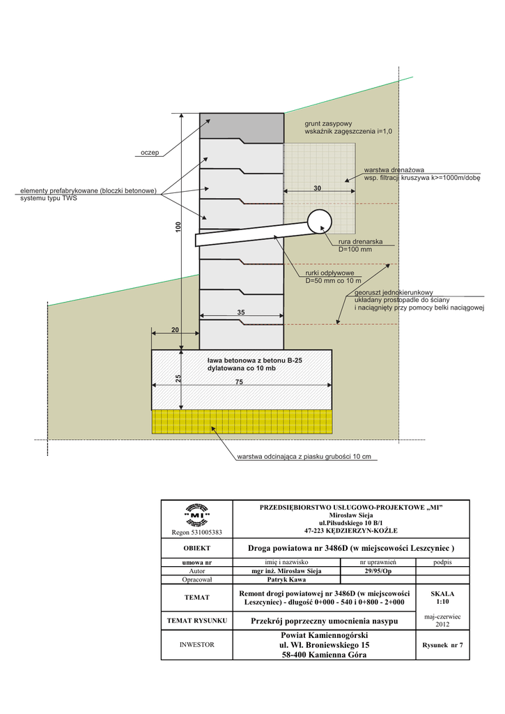 grunt zasypowy wskaźnik zagęszczenia i=1,0 oczep warstwa drenażowa wsp. filtracji kruszywa k>=1000m/dobę 30 100 elementy prefabrykowane (bloczki betonowe) systemu typu TWS rura drenarska D=100 mm rurki odpływowe D=50 mm co 10 m georuszt jednokierunkowy układany prostopadle do ściany i naciągnięty przy pomocy belki naciągowej 35 20 25 ława betonowa z betonu B-25 dylatowana co 10 mb 75 warstwa odcinająca z piasku grubości 10 cm Regon 531005383 PRZEDSIĘBIORSTWO USŁUGOWO-PROJEKTOWE „MI” Mirosław Sieja ul.Piłsudskiego 10 B/1 47-223 KĘDZIERZYN-KOŹLE OBIEKT Droga powiatowa nr 3486D (w miejscowości Leszcyniec ) umowa nr Autor Opracował imię i nazwisko mgr inż. Mirosław Sieja Patryk Kawa nr uprawnień 29/95/Op podpis TEMAT Remont drogi powiatowej nr 3486D (w miejscowości Leszcyniec) - długość 0+000 - 540 i 0+800 - 2+000 SKALA 1:10 TEMAT RYSUNKU Przekrój poprzeczny umocnienia nasypu maj-czerwiec 2012 INWESTOR Powiat Kamiennogórski ul. Wł. Broniewskiego 15 58-400 Kamienna Góra Rysunek nr 7