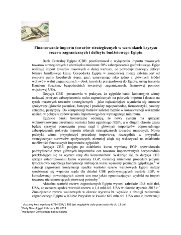 Finansowanie importu towarów strategicznych w warunkach kryzysu rezerw zagranicznych i deficytu budżetowego Egiptu Bank Centralny Egiptu /CBE/ poinformował o wyłączeniu importu masowych towarów strategicznych z obowiązku minimum 50% zabezpieczenia gotówkowego. Egipt realizuje import towarów masowych o dużej wartości, co powoduje znaczący deficyt bilansu handlowego kraju. Gospodarka Egiptu w zasadniczej mierze zależna jest od eksportu paliw kopalnych /ropa, gaz/, uznawanego jako jedno z głównych źródeł wpływów walut zagranicznych – obok turystyki przyjazdowej do Egiptu, usług tranzytu Kanałem Suezkim, bezpośrednich inwestycji zagranicznych, finansowej pomocy wojskowej USA. Decyzja CBE postanawia w praktyce, że egipskie banki komercyjne winny nadawać priorytet zabezpieczeniu walut zagranicznych na pokrycie importu i dostaw na rynek masowych towarów strategicznych – jako najważniejsze wymienia się surowce spożywcze /głównie pszenica/, benzynę i produkty ropopochodne, farmaceutyki, nawozy sztuczne, pestycydy. Do kompetencji banków należeć będzie w konsekwencji wskazanie udziału w pokryciu zobowiązania importowego bez wymaganego minimum. Egipskie banki komercyjne oceniają, że nowy system ma sprzyjać wolnorynkowemu określaniu wartości funta egipskiego /EGP/, a w długim okresie czasu będzie sprzyjać ponoszeniu przez rząd i głównych importerów odpowiedniego zabezpieczenia pokrycia importu różnych strategicznych towarów masowych. Nowa praktyka winna przyspieszyć procedurę importową, szczególnie w przypadku strategicznych surowców spożywczych, niemniej zdaje się wskazywać na osłabienie możliwości finansowych importerów egipskich. Decyzja CBE, podjęta po osłabieniu kursu wymiany EGP, spowodowała podwyższenie przez głównych importerów cen towarów importowanych bezpośrednio przekładające się na wyższe ceny dla konsumentów. Wskazuje się, że decyzja CBE sprzyja ustabilizowaniu kursu wymiany EGP, niemniej zmieniona procedura jedynie tymczasowo zapobiega kontynuacji słabnięcia kursu wymiany pieniądza egipskiego. 1 W sytuacji zagrożenia kontynuacji spadku wartości rezerw walutowych Egiptu należy spodziewać się wsparcia rządu dla działań CBE podtrzymujących wartość EGP, w konsekwencji powodujących wzrost cen oraz także ograniczających wydatki na import towarów nie stanowiących pierwszej potrzeby.2 Aktualna wartość rezerw zagranicznych Egiptu wynosi zaledwie 13,6 mld dol. USA, co oznacza spadek wartości rezerw o 1,4 mld dol. USA w okresie stycznia 2013 r.3 Zmniejszenie rezerw walutowych w okresie stycznia br. wynikło z obsługi zadłużenia zagranicznego Egiptu w Klubie Paryskim w kwocie 619 mln dol. USA oraz z interwencji 1 aktualny kurs wymiany 6,714 EGP/1 $US jest względnie stały przez ostatnie ok. 12 dni Daily News Egypt, February 10, 2013 3 wg danych Centralnego Banku Egiptu 2 Centralnego Banku Egiptu na rynku walutowym w okresie grudnia 2012 r. i stycznia 2013 r. na kwotę ok. 1 mld dol. USA. W ocenie sektora bankowego Egiptu wprowadzony w styczniu br. system Forex Auction także przyczynił się do spadku wartości egipskich rezerw zagranicznych. Zmniejszona wartość rezerw walutowych utrudnia ich wykorzystanie przez rząd Egiptu do sfinansowania importu podstawowego, którego wartość miesięczna wynosi ok. 5 mld dol. USA, co oznacza zdolność kraju do pokrycia importu przez okres 2,7 miesiąca przy założeniu utrzymania dotychczasowej skali importu. Obecna sytuacja w gospodarce wymaga radykalnych działań zapobiegających dalszemu spadkowi wartości rezerw, których część wykorzystano na import surowców spożywczych, głównie pszenicy. Dane Central Agency for Public Mobilization and Statistics /CAPMAS/ informują, że inflacja w styczniu br. wzrosła o 1,8% w porównaniu do grudnia 2012 r., a w porównaniu do stycznia 2012 r. o 6,6%. W styczniu br. wskaźnik cen żywności i napojów wzrósł o 2,7% w porównaniu do grudnia 2012 r. oraz o 8,2% w porównaniu do stycznia 2012 r. Skala ubóstwa w Egipcie zwiększyła się – obecnie niezdolne do pokrycia potrzeb jest 86% gospodarstw domowych, które przeznaczają 61,7% dochodów na żywność /średnia wielkość dla Egiptu wynosi 40%/.4 Załamanie sektora turystyki i polityczna niestabilność w Egipcie także przekłada się na osłabienie możliwości finansowych państwa i w takiej sytuacji nadzieje na poprawę sytuacji są wiązane ze sfinalizowaniem pożyczki 4,8 mld dol. USA przez Międzynarodowy Fundusz Walutowy. Decyzja MFW w tej sprawie odłożona w kontekście niestabilnej sytuacji wewnętrznej Egiptu powoduje, że aktualnie przygotowywany budżet państwa na rok finansowy 2013/2014 nie może uwzględniać wartości pożyczki MFW i ew. innych środków pomocy zagranicznej uzależnianych od stanowiska MFW. Projekt budżetu winien być przedstawiony przez rząd w ustawowym terminie najpóźniej 3 miesiące przed rozpoczęciem roku finansowego, tj. do końca marca br. Stan obecny utrudnia przygotowanie budżetu uwzględniającego zmniejszenie deficytu /w r. finan. 2011/12 wyniósł 170 mld EGP; ponad 11% GDP Egiptu/5 6, dla którego konieczne są akceptowalne społecznie reformy wydatków i wpływów budżetowych. W obecnej sytuacji wg agencji Fitch Ratings istnieje ryzyko obniżenia oceny kredytowej Egiptu, szczególnie przy braku akceptacji przez siły polityczne wyniku planowanych w marcu br. wyborów parlamentarnych. W ub. tygodniu Fitch Ratings obniżyła ocenę kredytową Egiptu z B+ na B wskazując możliwość kolejnego obniżenia ratingu jeśli nie nastąpi stabilizacja polityczna w kraju, wobec braku której nie należy spodziewać się uzyskania przez Egipt pożyczki z MFW. W grudniu 2012 r. ocenę kredytową Egiptu obniżyła agencja Standard&Poor’s do B-, a Moody’s oceniła ją na B2. Sporządził: Tomasz Przygoda I-y Sekretarz WPHI Kair, luty 2013 r. 4 Daily News Egypt, February 11, 2013 Business Today – 