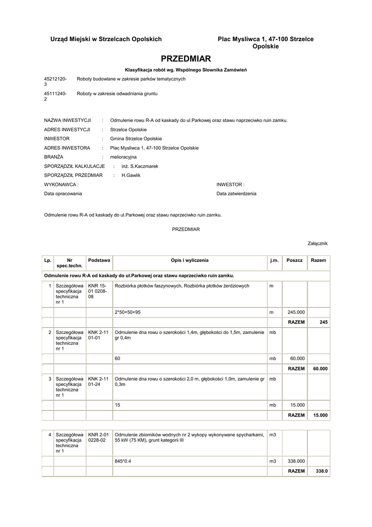 Urząd Miejski w Strzelcach Opolskich Plac Mysliwca 1, 47-100 Strzelce Opolskie PRZEDMIAR Klasyfikacja robót wg. Wspólnego Słownika Zamówień 452121203 Roboty budowlane w zakresie parków tematycznych 451112402 Roboty w zakresie odwadniania gruntu NAZWA INWESTYCJI : Odmulenie rowu R-A od kaskady do ul.Parkowej oraz stawu naprzeciwko ruin zamku. ADRES INWESTYCJI : Strzelce Opolskie INWESTOR : Gmina Strzelce Opolskie ADRES INWESTORA : Plac Mysliwca 1, 47-100 Strzelce Opolskie BRANśA : melioracyjna SPORZĄDZIŁ KALKULACJE : inŜ. S.Kaczmarek SPORZĄDZIŁ PRZEDMIAR : H.Gawlik WYKONAWCA : INWESTOR : Data opracowania Data zatwierdzenia Odmulenie rowu R-A od kaskady do ul.Parkowej oraz stawu naprzeciwko ruin zamku. PRZEDMIAR Załącznik Lp. Nr spec.techn. Podstawa Opis i wyliczenia j.m. Poszcz Razem Odmulenie rowu R-A od kaskady do ul.Parkowej oraz stawu naprzeciwko ruin zamku. 1 Szczegółowa specyfikacja techniczna nr 1 KNR 1501 020808 Rozbiórka płotków faszynowych, Rozbiórka płotków Ŝerdziowych m 2*50+50+95 m 245.000 RAZEM 2 Szczegółowa specyfikacja techniczna nr 1 KNK 2-11 01-01 Odmulenie dna rowu o szerokości 1,4m, głębokości do 1,5m, zamulenie gr 0,4m mb 60 mb 60.000 RAZEM 3 Szczegółowa specyfikacja techniczna nr 1 KNK 2-11 01-24 Odmulenie dna rowu o szerokości 2,0 m, głębokości 1,0m, zamulenie gr 0,3m mb 15 mb KNR 2-01 0228-02 Odmulenie zbiorników wodnych nr 2 wykopy wykonywane spycharkami, 55 kW (75 KM), grunt kategorii III m3 845*0.4 m3 60.000 15.000 RAZEM 4 Szczegółowa specyfikacja techniczna nr 1 245 15.000 338.000 RAZEM 338.0 5 Szczegółowa specyfikacja techniczna nr 1 KNR 2-01 0228-03 Wykopy wykonywane spycharkami, 55 kW (75 KM), grunt kategorii IV m3 poz.4 m3 338.000 RAZEM 6 Szczegółowa specyfikacja techniczna nr 1 KNR 2-01 02290501 Przemieszczenie spycharkami mas ziemnych, nakłady dodatkowe za dalsze rozpoczęte 10 m w przedziale 10-30 m, grunt kategorii III, spycharka 55 kW (75 KM) Krotność = 2 m3 poz.4 m3 338.000 RAZEM 7 Szczegółowa specyfikacja techniczna nr 1 KNR 2-01 02290601 Przemieszczenie spycharkami mas ziemnych, nakłady dodatkowe za dalsze rozpoczęte 10 m w przedziale 10-30 m, grunt kategorii IV, spycharka 55 kW (75 KM) Krotność = 2 m3 poz.4 m3 KNR 2-01 02090601 Roboty ziemne koparkami zgarniakowymi z transportem urobku samochodami samowyładowczymi do 1 km, koparka 1,20 m3, grunt kategorii III, samochód 5-10 t m3 poz.4 m3 KNR 2-01 0205-04 Roboty ziemne wykon.koparkami podsiębiernymi o poj.łyŜki 0.25 m3 w gr.kat.III z transp.urobku samochod.samowyładowczymi na odległość do 1 km m3 0.5*1.0*5.0*60.0 m3 KNR 2-11 0504-07 Wykonanie opasek podwójnych z kiszek faszynowych o śr. 20+20 cm w gruncie kat. I-II m 2*50.0+2*10.0+2*15.0 m 150.000 100 m 100.000 RAZEM 11 Szczegółowa specyfikacja techniczna nr 1 KNR 2-11 0401-11 Wykonanie narzutu kamiennego luzem, z brzegu, wyładunek ręczny, narzut nadwodny z kamienia średniego m3 100*2.0*0.3+100*5.0*0.3 m3 338 150.000 RAZEM 10 Szczegółowa specyfikacja techniczna nr 1 338 338.000 RAZEM 9 Szczegółowa specyfikacja techniczna nr 1 338 338.000 RAZEM 8 Szczegółowa specyfikacja techniczna nr 1 338.0 150.000 250.000 210.000 RAZEM 210.0 12 Szczegółowa specyfikacja techniczna nr 1 kalk. własna Ubicie narzutu kamiennego m2 poz.11 m2 210.000 RAZEM 13 Szczegółowa specyfikacja techniczna nr 1 KNR 2-01 0507-02 Plantowanie skarp, dna rowów oraz skarp i korony nasypów przy robotach wodno - inŜynieryjnych, wykopy, kategoria gruntu III m2 (2*50+2*10+2*15)*2+ 100*2.0+100*5.0 m2 1000.000 RAZEM 14 Szczegółowa specyfikacja techniczna nr 1 KNR 2-01 0510-03 Obsianie skarp w ziemi urodzajnej 2431mx5,0m m2 poz.13 m2 KNR 405II 020301/02 Ręczne czyszczenie kanałów kołowych sieci zewnętrznej o śr. 0.2 m wypełnionych osadem do 2/3 wysokości kanału - ekstrapolacja m 25+60+60+10 m KNR 1501 01080403 Oczyszczenie z namułu przepustów rurowych, przepust Fi 1,00 m, zamulenie do wysokości 2/3 Fi m 13 m KNNR 4 1414-05 + KNNR 4 1414-06 Studnie rewizyjne z kręgów betonowych i Ŝelbetowych o śr. 1000 mm wykonywane metodą studniarską w gruncie kat.III - głębokość 1,5m stud. 1 stud. KNNR 1 0205-02 Roboty ziemne wykonywane koparkami przedsiębiernymi o poj.łyŜki 0.25 m3 w gr.kat. I-III w ziemi uprzednio zmag.w hałdach z transp.urobku na odl. 1 km sam.samowyład. m3 poz.9 m3 13 1.000 RAZEM 18 Szczegółowa specyfikacja techniczna nr 1 155.000 13.000 RAZEM 17 Szczegółowa specyfikacja techniczna nr 1 1000 155.000 RAZEM 16 Szczegółowa specyfikacja techniczna nr 1 1000.0 1000.000 RAZEM 15 Szczegółowa specyfikacja techniczna nr 1 210.000 1.000 150.000 RAZEM 150.000