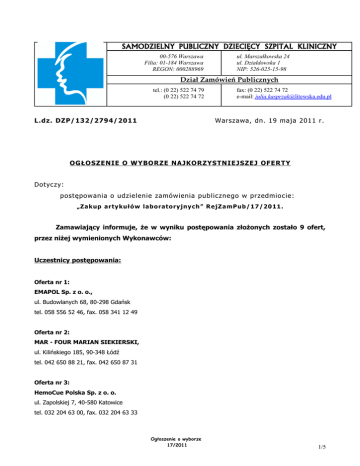 SAMODZIELNY PUBLICZNY DZIECIĘCY SZPITAL KLINICZNY 00-576 Warszawa Filia: 01-184 Warszawa REGON: 000288969 ul. Marszałkowska 24 ul. Działdowska 1 NIP: 526-025-15-98 Dział Zamówień Publicznych tel.: (0 22) 522 74 79 (0 22) 522 74 72 L.dz. DZP/ 132/2794/ 2011 fax: (0 22) 522 74 72 e-mail: [email protected] Warszawa, dn. 19 maja 2011 r. OGŁOSZENIE O WYBORZE NAJKORZYSTNIEJSZEJ OFERTY Dotyczy: postępowania o udzielenie zamówienia publicznego w przedmiocie: „Za kup a rty kuł ó w la bo ra to ry jny c h” R ejZa mP ub/ 1 7 /2 0 11 . Zamawiający informuje, że w wyniku postępowania złożonych zostało 9 ofert, przez niżej wymienionych Wykonawców: Uczestnicy postępowania: Oferta nr 1: EMAPOL Sp. z o. o., ul. Budowlanych 68, 80-298 Gdańsk tel. 058 556 52 46, fax. 058 341 12 49 Oferta nr 2: MAR - FOUR MARIAN SIEKIERSKI, ul. Kilińskiego 185, 90-348 Łódź tel. 042 650 88 21, fax. 042 650 87 31 Oferta nr 3: HemoCue Polska Sp. z o. o. ul. Zapolskiej 7, 40-580 Katowice tel. 032 204 63 00, fax. 032 204 63 33 Ogłoszenie o wyborze 17/2011 1/5 Oferta nr 4: PRZEDSIĘBIORSTWO PRODUKCYJNO – HANDLOWE „ANGA” GABRIELA ANIOŁA ul. Kosowska 13, 60-464 Poznań tel. 061 842 24 90, fax. 061 842 91 80. Oferta nr 5: SARSTED Sp. z o. o., ul. Warszawska 25 Blizne Łaszczyńskiego, 05-082 Stare Babice tel. 022 722 05 43, fax. 022 722 07 95 Oferta nr 6: ELEKTRO MED Grzegorz Pałkowski ul. Zabierzowska 11, 32-005 Niepołomice tel. 012 288 91 40, fax. 012 288 91 42 Oferta nr 7: „EQUIMED” HOŁDA, LENK, TREMBECKI S.J. ul. Włodarzewska 95 A, 02-393 Warszawa tel. 022 82 38 733, fax. 022 82 38 734 wew. 108 Oferta nr 8: OLYMPUS Polska Sp. z o. o. ul. Suwak 3, 02-676 Warszawa tel. 022 366 00 77, fax. 022 831 04 53 Oferta nr 9: MEDLAB – PRODUCTS Sp. z o. o. ul. Gałczyńskiego 8, 05-090 Raszyn tel. 022 720 35 12, fax. 022 846 29 26. Zamawiający informuje, że złożone oferty otrzymały następującą ilość punktów wg kryterium „Cena oferty” - 100 %, oraz że w wyniku oceny złożonych ofert wybrane zostały najkorzystniejsze oferty Wykonawców: Pakiet 1 MEDLAB – PRODUCTS Sp. z o. o. Wartość netto: 82.402,50 zł., tj. 89.518,50 zł. brutto Ocena punktowa kryterium „Cena Oferty” - 100 pkt pozostałe: „EQUIMED” HOŁDA, LENK, TREMBECKI S.J. Wartość netto: 86.798,00 zł., tj. 94.163,34 zł brutto Ocena punktowa kryterium „Cena Oferty” - 90,38 pkt Ogłoszenie o wyborze 17/2011 2/5 Pakiet 2 „EQUIMED” HOŁDA, LENK, TREMBECKI S.J. Wartość netto: 5.910,50 zł., tj. 6.714,39 zł. brutto Ocena punktowa kryterium „Cena Oferty” - 100 pkt Pakiet 5 „EQUIMED” HOŁDA, LENK, TREMBECKI S.J. Wartość netto: 4.762,00 zł., tj. 5.363,61 zł. brutto Ocena punktowa kryterium „Cena Oferty” - 100 pkt Pakiet 6 HemoCue Polska Sp. z o. o. Wartość netto: 7.564,00 zł., tj. 8.169,12 zł. brutto Ocena punktowa kryterium „Cena Oferty” - 100 pkt Pakiet 7 EMAPOL Sp. z o. o., Wartość netto: 5.040,00 zł., tj. 5.443,20 zł. brutto Ocena punktowa kryterium „Cena Oferty” - 100 pkt. Pakiet 9 SARSTED Sp. z o. o., Wartość netto: 10.003,50 zł., tj. 11.998,31 zł. brutto. Ocena punktowa kryterium „Cena Oferty” - 100 pkt. Pakiet 11 SARSTED Sp. z o. o., Wartość netto: 4.684,00 zł., tj. 5.761,32 zł. brutto Ocena punktowa kryterium „Cena Oferty” - 100 pkt. Pakiet 12 „EQUIMED” HOŁDA, LENK, TREMBECKI S.J. Wartość netto: 17.507,20 zł., tj. 18.907,78 zł. brutto Ocena punktowa kryterium „Cena Oferty” - 100 pkt Pozostałe: MAR - FOUR MARIAN SIEKIERSKI, wartość netto: 24.184,90 zł., tj. 26.139,19 zł. brutto Ocena punktowa kryterium „Cena Oferty” - 52,31 pkt Pakiet 14 MAR - FOUR MARIAN SIEKIERSKI, wartość netto: 522,00 zł, tj. 642,06 zł. brutto Ocena punktowa kryterium „Cena Oferty” - 100 pkt pozostałe: „EQUIMED” HOŁDA, LENK, TREMBECKI S.J. Wartość netto:540,00 zł., tj. 664,20 zł. brutto Ocena punktowa kryterium „Cena Oferty” - 93,43 pkt Ogłoszenie o wyborze 17/2011 3/5 MEDLAB – PRODUCTS Sp. z o. o. Wartość netto: 1.116,00 zł., tj. Wartość brutto: 1.372,68 zł. Ocena punktowa kryterium „Cena Oferty” - 21,88 pkt Pakiet 15 SARSTED Sp. z o. o., Wartość netto: 3.460,00 zł., tj. 4.255,80 zł. brutto. Ocena punktowa kryterium „Cena Oferty” - 100 pkt. Pakiet 16 „EQUIMED” HOŁDA, LENK, TREMBECKI S.J. Wartość netto: 38,00 zł., tj. 46,74 zł. brutto Ocena punktowa kryterium „Cena Oferty” - 100 pkt pozostałe: PRZEDSIĘBIORSTWO PRODUKCYJNO – HANDLOWE „ANGA” GABRIELA ANIOŁA Wartość netto: 40,00 zł., tj. 49,20 zł. brutto Ocena punktowa kryterium „Cena Oferty” - 90,25 pkt Pakiet 17 ELEKTRO MED Grzegorz Pałkowski wartość netto: 648,15 zł., tj. 700,00 zł brutto Ocena punktowa kryterium „Cena Oferty” - 100 pkt pozostałe: PRZEDSIĘBIORSTWO PRODUKCYJNO – HANDLOWE „ANGA” GABRIELA ANIOŁA Wartość netto: 670,00 zł., tj. 723,60 zł. brutto Ocena punktowa kryterium „Cena Oferty” - 93,57 pkt MAR - FOUR MARIAN SIEKIERSKI, wartość netto: 940,00 zł., tj. 1.015,20 zł. brutto Ocena punktowa kryterium „Cena Oferty” - 47,53 pkt Pakiet 18 ELEKTRO MED Grzegorz Pałkowski wartość netto: 4.582,80 zł., tj. 4.949,42 zł. brutto Ocena punktowa kryterium „Cena Oferty” - 100 pkt pozostałe: MAR - FOUR MARIAN SIEKIERSKI, wartość netto: 4.860,00 zł., tj. 5.248,80 zł. brutto Ocena punktowa kryterium „Cena Oferty” - 88,92 pkt OLYMPUS Polska Sp. z o. o. Wartość netto: 5.400,00 zł., tj. Wartość brutto: 5.832,00 zł. Ocena punktowa kryterium „Cena Oferty” - 72,01 pkt Pakiet 19 ELEKTRO MED Grzegorz Pałkowski Wartość netto: 1.487,50 zł., tj. 1.606,50 zł. brutto Ocena punktowa kryterium „Cena Oferty” - 100 pkt Ogłoszenie o wyborze 17/2011 4/5 Pakiet 20 MEDLAB – PRODUCTS Sp. z o. o. Wartość netto: 270,60 zł, tj. Wartość brutto: 332,84 zł. Ocena punktowa kryterium „Cena Oferty” - 100 pkt ELEKTRO MED Grzegorz Pałkowski wartość netto: 568,00 zł. tj. 613,44 zł. brutto Oc