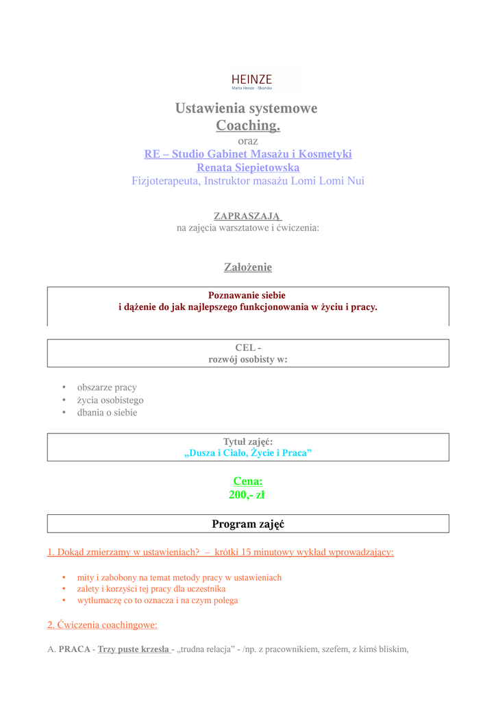 Ustawienia systemowe Coaching. oraz RE – Studio Gabinet Masażu i Kosmetyki Renata Siepietowska Fizjoterapeuta, Instruktor masażu Lomi Lomi Nui ZAPRASZAJĄ na zajęcia warsztatowe i ćwiczenia: Założenie Poznawanie siebie i dążenie do jak najlepszego funkcjonowania w życiu i pracy. CEL rozwój osobisty w: • • • obszarze pracy życia osobistego dbania o siebie Tytuł zajęć: „Dusza i Ciało, Życie i Praca” Cena: 200,- zł Program zajęć 1. Dokąd zmierzamy w ustawieniach? – krótki 15 minutowy wykład wprowadzający: • • • mity i zabobony na temat metody pracy w ustawieniach zalety i korzyści tej pracy dla uczestnika wytłumaczę co to oznacza i na czym polega 2. Ćwiczenia coachingowe: A. PRACA - Trzy puste krzesła - „trudna relacja” - /np. z pracownikiem, szefem, z kimś bliskim, towarzyska/ - ćwiczenie z neurocoachingu pozwalające na zmianę perspektywy osoby doznającej kłopotu w relacji – będzie można doświadczyć szybkiej zmiany, która w efekcie ma dać sukces w relacji CIALO - MASAŻ – jako forma dotyku 1. Charakterystyka masażu i rodzaje 2. Korzyści na poziomie psychicznym i fizycznym 3. Efekty zdrowotne 4. Kilka elementów praktycznych C. ŻYCIE - Gra z negatywnymi myślami – ćwiczenie ma dwa etapy: I etap /dokańczamy zdania/ i II etap /niespodzianka/ - potem do samodzielnej pracy w domu, a przy uzyskaniu wprawy nadaje się świetnie na imprezę CIAŁO - WZORCE POSTAWY 1. Prawidłowa postawa jako mowa ciała 2. Nawyki i przyzwyczajenia- przykłady deformacji ciała 3. Indywidualna korekta nabytych nieprawidłowych wzorców E. PRACA, ŻYCIE – Cel i zadania – ćwiczenie trwające 5 – 10 minut /niespodzianka/ - po przećwiczeniu doskonale nadaje się na imprezę lub spotkanie towarzyskie i pogaduszki CIAŁO - ODDECH – źródło życia 1. Wskazanie nieprawidłowych nawyków oddechowych 2. Wdech – witalność i energia 3. Wydech – jako forma relaksacji 4. Ćwiczenia oddechowe D. CIAŁO i DUSZA - Rozmowa z ciałem i duszą – poważniejsze ćwiczenie wyciszające dla każdej z osób, efektem tego doznania może być głębsza refleksja niż dotąd nad swoją Istotą i zajęcie się Sobą w zupełnie inny sposób niż do tej pory :) CIAŁO - AUTOMASAŻ – forma poprawy nastroju 1. Praca własna z ciałem 2. Przykłady automasażu 3. Wskazanie punktów biologicznie aktywnych odpowiedzialnych za stany emocjonalne CIAŁO - MUZYKA – ćwiczenia wg OSHO 1. Świadomy relaks – co oznacza i na czym polega 2. Ćwiczenia *** Dodatkowa korzyść dla uczestników: Networking – wymiana wizytówek Możliwość prezentacji swojej działalności ***