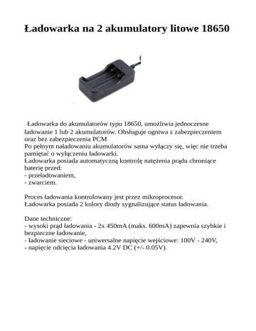 Ładowarka na 2 akumulatory litowe 18650 Ładowarka do akumulatorów typu 18650, umożliwia jednoczesne ładowanie 1 lub 2 akumulatorów. Obsługuje ogniwa z zabezpieczeniem oraz bez zabezpieczenia PCM Po pełnym naładowaniu akumulatorów sama wyłączy się, więc nie trzeba pamiętać o wyłączeniu ładowarki. Ładowarka posiada automatyczną kontrolę natężenia prądu chroniące baterię przed: - przeładowaniem, - zwarciem. Proces ładowania kontrolowany jest przez mikroprocesor. Ładowarka posiada 2 kolory diody sygnalizujące status ładowania. Dane techniczne: - wysoki prąd ładowania - 2x 450mA (maks. 600mA) zapewnia szybkie i bezpieczne ładowanie, - ładowanie sieciowe - uniwersalne napięcie wejściowe: 100V - 240V, - napięcie odcięcia ładowania 4.2V DC (+/- 0.05V).