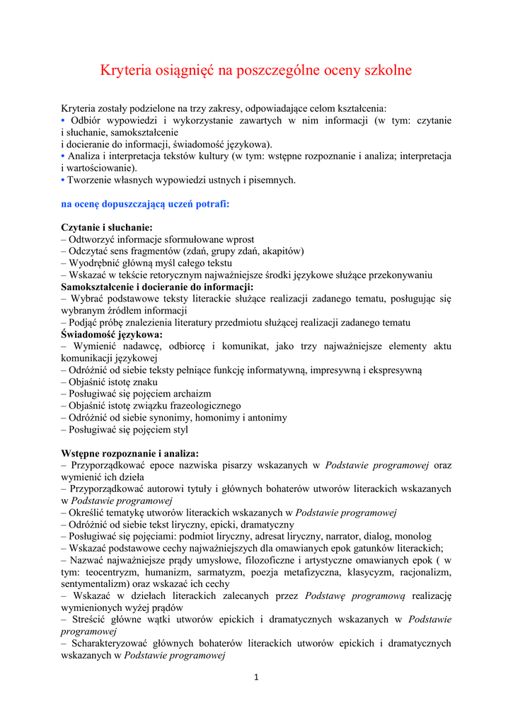 Kryteria osiągnięć na poszczególne oceny szkolne Kryteria zostały podzielone na trzy zakresy, odpowiadające celom kształcenia: • Odbiór wypowiedzi i wykorzystanie zawartych w nim informacji (w tym: czytanie i słuchanie, samokształcenie i docieranie do informacji, świadomość językowa). • Analiza i interpretacja tekstów kultury (w tym: wstępne rozpoznanie i analiza; interpretacja i wartościowanie). • Tworzenie własnych wypowiedzi ustnych i pisemnych. na ocenę dopuszczającą uczeń potrafi: Odbiór wypowiedzi i wykorzystanie zawartych w nich informacji Czytanie i słuchanie: – Odtworzyć informacje sformułowane wprost – Odczytać sens fragmentów (zdań, grupy zdań, akapitów) – Wyodrębnić główną myśl całego tekstu – Wskazać w tekście retorycznym najważniejsze środki językowe służące przekonywaniu Samokształcenie i docieranie do informacji: – Wybrać podstawowe teksty literackie służące realizacji zadanego tematu, posługując się wybranym źródłem informacji – Podjąć próbę znalezienia literatury przedmiotu służącej realizacji zadanego tematu Świadomość językowa: – Wymienić nadawcę, odbiorcę i komunikat, jako trzy najważniejsze elementy aktu komunikacji językowej – Odróżnić od siebie teksty pełniące funkcję informatywną, impresywną i ekspresywną – Objaśnić istotę znaku – Posługiwać się pojęciem archaizm – Objaśnić istotę związku frazeologicznego – Odróżnić od siebie synonimy, homonimy i antonimy – Posługiwać się pojęciem styl Analiza i interpretacja tekstów kultury Wstępne rozpoznanie i analiza: – Przyporządkować epoce nazwiska pisarzy wskazanych w Podstawie programowej oraz wymienić ich dzieła – Przyporządkować autorowi tytuły i głównych bohaterów utworów literackich wskazanych w Podstawie programowej – Określić tematykę utworów literackich wskazanych w Podstawie programowej – Odróżnić od siebie tekst liryczny, epicki, dramatyczny – Posługiwać się pojęciami: podmiot liryczny, adresat liryczny, narrator, dialog, monolog – Wskazać podstawowe cechy najważniejszych dla omawianych epok gatunków literackich; – Nazwać najważniejsze prądy umysłowe, filozoficzne i artystyczne omawianych epok ( w tym: teocentryzm, humanizm, sarmatyzm, poezja metafizyczna, klasycyzm, racjonalizm, sentymentalizm) oraz wskazać ich cechy – Wskazać w dziełach literackich zalecanych przez Podstawę programową realizację wymienionych wyżej prądów – Streścić główne wątki utworów epickich i dramatycznych wskazanych w Podstawie programowej – Scharakteryzować głównych bohaterów literackich utworów epickich i dramatycznych wskazanych w Podstawie programowej 1 – Rozpoznać najważniejsze środki i zabiegi stylistyczne w utworach literackich omawianych epok (w tym: epitet, metafora, porównanie, apostrofa, pytanie retoryczne) – Zanalizować utwory wskazane w Podstawie programowej, uwzględniając najważniejsze kategorie opisu (podmiot / adresat liryczny, narrator, świat przedstawiony) Ocenianie Interpretacja i wartościowanie: – Określić przybliżone ramy chronologiczne epok historycznoliterackich; – Objaśnić znaczenie nazw epok literackich – Odczytać znaczenie podstawowych symboli w dziełach literackich wskazanych w Podstawie programowej – Posługiwać się komunikatywnym językiem w mowie i w piśmie – Wypowiadać się w mowie i w piśmie na zadany temat, w sposób świadczący o co najmniej częściowym zrozumieniu tematu – Odnieść się w wypowiedzi do tekstów literackich – Podjąć próbę skomponowania wypowiedzi składającej się ze wstępu, rozwinięcia i zakończenia – Samodzielnie prowadzić zeszyt przedmiotowy – Zrealizować przynajmniej połowę obowiązkowych zadań przewidzianych przez nauczyciela Dopuszczalne: konieczność pomocy ze strony nauczyciela podczas realizacji zadań, ubogi komentarz, stereotypowość sądów, streszczanie utworu zamiast analizy i interpretacji, drobne błędy rzeczowe, błędy kompozycyjne (np. brak proporcji między poszczególnymi elementami pracy, brak logicznej spójności tekstu, brak wstępu lub zakończenia), błędy stylistyczne, składniowe, frazeologiczne, fleksyjne, interpunkcyjne i ortograficzne. na ocenę dostateczną uczeń potrafi to, co na ocenę dopuszczającą, a ponadto: Odbiór wypowiedzi i wykorzystanie zawartych w nich informacji Czytanie i słuchanie: – Określić funkcję środków językowych w tekście retorycznym – Rozpoznać ironię w tekście – Sformułować tezę tekstu bądź fragmentu tekstu – Podać argumenty na rzecz tezy – Odróżnić argumenty od przykładów oraz tezę od hipotezy – Rozpoznać relacje kompozycyjne między poszczególnymi fragmentami (akapitami) tekstu – Oddzielić informacje od opinii – Wskazać przyczyny i skutki Samokształcenie i docieranie do informacji: – Wyszukać podstawowe pozycje z literatury przedmiotu służącej realizacji zadanego tematu – Samodzielnie korzystać ze słowników i leksykonów Świadomość językowa: – Rozpoznać w tekście sześć elementów aktu komunikacji językowej – Określić dominującą w tekście funkcję wypowiedzi – Podać genezę i objaśnić znaczenie najczęściej pojawiających się w tekstach związków frazeologicznych o pochodzeniu biblijnym i mitologicznym – Wskazać w tekście staropolskim archaizmy fonetyczne, leksykalne i składniowe – Rozpoznać w tekście synonimię, homonimię, antonimię i polisemię – Objaśnić pojęcie stylizacji Analiza i interpretacja tekstów kultury 2 Wstępne rozpoznanie i analiza: – Określić tematykę wszystkich omawianych utworów literackich – Podać najważniejsze cechy rodzajowe tekstów lirycznych, epickich i dramatycznych – Objaśnić różnicę między literaturą a publicystyką oraz literaturą a retoryką – Wskazać podstawowe cechy wszystkich omawianych gatunków literackich – Por