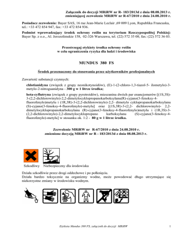Załącznik do decyzji MRiRW nr R- 183/2013d z dnia 08.08.2013 r. zmieniającej zezwolenie MRiRW nr R-67/2010 z dnia 24.08.2010 r. Posiadacz zezwolenia: Bayer SAS, 16 rue Jean-Marie Leclair ,69 009 Lyon, Republika Francuska, tel.: +33 472 854 947, fax: +33 472 854 936. Podmiot wprowadzający środek ochrony roślin na terytorium Rzeczypospolitej Polskiej: Bayer Sp. z o.o., Al. Jerozolimskie 158, 02-326 Warszawa, tel. (22) 572 35 00, fax: (22) 572 36 03. Przestrzegaj etykiety środka ochrony roślin w celu ograniczenia ryzyka dla ludzi i środowiska MUNDUS 380 FS Środek przeznaczony do stosowania przez użytkowników profesjonalnych Zawartość substancji czynnych: chlotianidyna (związek z grupy neonikotynoidów), (E)-1-(2-chloro-1,3-tiazol-5- ilometylo)-3metylo-2-nitroguanidyna - 300 g w 1 litrze środka; beta-cyflutryna (związek z grupy pyretroidów), mieszanina dwóch par enancjomerów:[(1S,3S)3-(2,2-dichlorowinylo)-2,2-dimetylocyklopropanokarboksylanu(R)-cyjano(3-fenoksy-4fluorofenylo)metylu i (1R,3R)-3-(2,2-dichlorowinylo)-2,2- dimetylo cyklopropanokarboksylanu (S)-cyjano(3-fenoksy-4-fluorofenylo)-metylu] oraz [(1S,3R)-3-(2,2- dichlorowinylo)- 2,2dimetylocyklopropanokarboksylanu (R)-cyjano(3-fenoksy-4-fluorofenylo)metylu i (1R,3S)-3(2,2-dichlorowinylo)-2,2-dimetylocyklopropano karboksylanu (S)-cyjano(3-fenoksy-4fluorofenylo)-metylu] w stosunku ok. 1:2 - 80 g w 1 litrze środka. Zezwolenie MRiRW nr R-67/2010 z dnia 24.08.2010 r. zmienione decyzją MRiRW nr R - 183/2013d z dnia 08.08.2013 r. Szkodliwy Niebezpieczny dla środowiska Działa szkodliwie przez drogi oddechowe i po połknięciu. Działa bardzo toksycznie na organizmy wodne, może powodować długo utrzymujące się niekorzystne zmiany w środowisku wodnym. Etykieta Mundus 380 FS, załącznik do decyzji MRiRW 1 Załącznik do decyzji MRiRW nr R- 183/2013d z dnia 08.08.2013 r. zmieniającej zezwolenie MRiRW nr R-67/2010 z dnia 24.08.2010 r. Uwaga! 1. Zabrania się stosowania środka w strefie bezpośredniej ochrony ujęć wody. 2. Nie zanieczyszczać wód środkiem ochrony roślin lub jego opakowaniem. Nie myć aparatury w pobliżu wód powierzchniowych. Unikać zanieczyszczania wód poprzez rowy odwadniające z gospodarstw i dróg. I OPIS DZIAŁANIA MUNDUS 380 FS jest zaprawą owadobójczą w formie płynnego koncentratu, o działaniu kontaktowym, żołądkowym i gazowym, przeznaczoną do stosowania przy użyciu profesjonalnego sprzętu do otoczkowania nasion buraka cukrowego przeciwko szkodnikom występującym we wczesnym okresie rozwoju roślin. W roślinie działa systemicznie. II ZAKRES STOSOWANIA ROŚLINY ROLNICZE Burak cukrowy Drobnica burakowa, drutowce, mszyca trzmielinowo-burakowa (do fazy 4-6 liści buraka) pchełka burakowa, pędraki, śmietka ćwiklanka. Zalecana dawka: 100 ml/jednostkę siewną. UWAGI: 1. Na opakowaniach zaprawionych nasion powinny zostać umieszczone następujące zwroty: − Siew wykonać za pomocą siewników wykluczających możliwość wzbijania się pyłu w chwili dokonywania wysiewu nasion do gleby i przy napełnianiu zasobników siewnika. − Nie stosować siewników pneumatycznych, z wyjątkiem wyposażonych w dyfuzory, których końcówki należy skierować jak najbliżej powierzchni gleby, mocując na ich wylocie elastyczną rurę lub odpowiedniej długości przewód elastyczny kończący swój wylot tuż przy powierzchni gleby. − Nie dopuszczać do uszkodzenia powłoki nasion w trakcie ich przechowywania, transportu i siewu. − Zaprawione nasiona muszą być całkowicie przykryte glebą, z uwzględnieniem końców rzędów. − Nasiona przypadkowo rozsypane zebrać lub przykryć ziemią, aby zapobiec zatruciu ptaków i ssaków. 2. Zaprawione nasiona używać wyłącznie do siewu – nie wolno przeznaczać ich na paszę i na cele konsumpcyjne. 3. Przed użyciem środek dokładnie wymieszać. 4. Zaprawiać tylko dobrze oczyszczony materiał siewny, o wysokiej energii kiełkowania i odpowiedniej wilgotności. 5. Zaprawione nasiona po dosuszeniu przechowywać w grubych papierowych lub foliowych, oznakowanych, szczelnie zamkniętych workach, w oddzielnych, chłodnych i dobrze wentylowanych pomieszczeniach. 6. Nie przechowywać razem z żywnością i paszą. 7. W przypadku przechowywania zaprawionych nasion, przed siewem sprawdzić ich siłę kiełkowania. 8. Nie stosować do zaprawiania rodów hodowlanych. Etykieta Mundus 380 FS, załącznik do decyzji MRiRW 2 Załącznik do decyzji MRiRW nr R- 183/2013d z dnia 08.08.2013 r. zmieniającej zezwolenie MRiRW nr R-67/2010 z dnia 24.08.2010 r. III TECHNIKA ZAPRAWIANIA Zaprawiać nasiona wyłącznie przy użyciu profesjonalnego sprzętu do otoczkowania nasion buraka cukrowego. Zabieg zaprawiania powinien zostać wykonany w sposób wykluczający możliwość wzbijania się pyłu podczas przechowywania i transportu. Przed użyciem środek dokładnie wymieszać. IV OKRES KARENCJI Okres od dnia ostatniego zabiegu do dnia zbioru i przeznaczenia do konsumpcji. NIE DOTYCZY V OKRES PREWENCJI DLA LUDZI, ZWIERZĄT, PSZCZÓŁ Okres zapobiegający zatruciu. NIE DOTYCZY VI PRZECHOWYWANIE Przechowywać wyłącznie w oryginalnym opakowaniu w temperaturze nie niższej niż 0° i nie wyższej niż 300 C. Przechowywać pod zamknięciem i chronić przed dziećmi. Nie przechowywać razem z żywnością, napojami i paszami dla zwierząt. VII WARUNKI BEZPIECZNEGO STOSOWANIA ŚRODKA − Nie jeść i nie pić oraz nie palić tytoniu podczas stosowania środka. − Unikać zanieczyszczenia skóry. − Natychmiast zdjąć całą zanieczyszczoną odzież. − Nosić odpowiednią odzież ochronną, odpowiednie rękawice ochronne i okulary lub ochronę twarzy. − W razie połknięcia niezwłocznie zasięgnąć porady lekarza i pokazać mu opakowanie lub etykietę. − Resztki cieczy użytkowej oraz wodę użytą do mycia zaprawiarki zużyć podczas kolejnego zaprawiania lub poddać procesowi likwidacji w specjalnie do tego celu przygotowanym stanowisku. − Zaprawiar