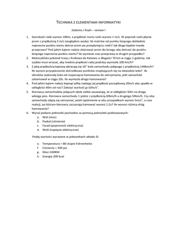 TECHNIKA Z ELEMENTAMI INFORMATYKI Zadania z fizyki – zestaw I 1. Szerokość rzeki wynosi 100m, a prędkość nurtu rzeki wynosi 1 m/s. W poprzek rzeki płynie prom z prędkością 3 m/s (względem wody). Ile metrów od punktu leżącego dokładnie naprzeciw punktu startu dotrze prom po przepłynięciu rzeki? Jak długo będzie trwała przeprawa? Pod jakim kątem należy skierować prom do brzegu aby dotrzeć do punktu leżącego naprzeciw punktu startu? Ile wyniesie czas przeprawy w drugim przypadku? 2. Motocyklista pokonał trasę z Krakowa do Katowic o długości 70 km w ciągu 1 godziny. Jak szybko musi wracać, aby średnia prędkość całej podróży wyniosła 100 km/h? 3. Z jaką prędkością kątową obracają się 16” koła samochodu jadącego z prędkością 140km/h? Ile wynosi przyspieszenie dośrodkowe punktów znajdujących się na obwodzie koła? Ile obrotów wykonały koła od rozpoczęcia hamowania do zatrzymania, jeśli samochód zahamował w ciągu 10s. Ile wyniosła droga hamowania? 4. Pod jakim kątem należy kopnąć piłkę nadając jej prędkość początkową 20m/s aby upadła w odległości 40m od nas? Założyć wartość g=10m/s2. 5. Kierowcy samochodów jadących obok siebie zauważają, że w odległości 50m na drogę wbiega pies. Kierowca samochodu 1 jedzie z prędkością 60km/h a drugiego 50km/h. Czy oba samochody zdążą się zatrzymać, jeżeli opóźnienie w obu przypadkach wynosi 5m/s2, a czas reakcji, po którym kierowcy zaczynają hamować wynosi 1,5s? Ile wynosi różnica dróg hamowania? 6. Wyraź podane jednostki pochodne za pomocą jednostek podstawowych: a. Wat (moc) b. Paskal (ciśnienie) c. Farad (pojemność elektryczna) d. Wolt (napięcie elektryczne) Podaj wartości wyrażone w jednostkach układu SI: e. f. g. h. Temperatura = 80 stopni Fahrenheita Ciśnienie = 500 psi Moc=100KM Energia 200 kcal