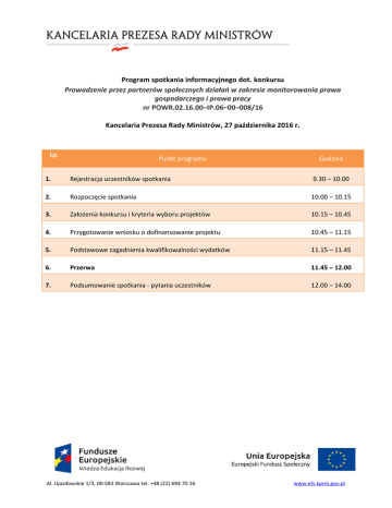 Program spotkania informacyjnego dot. konkursu Prowadzenie przez partnerów społecznych działań w zakresie monitorowania prawa gospodarczego i prawa pracy nr POWR.02.16.00–IP.06–00–008/16 Kancelaria Prezesa Rady Ministrów, 27 października 2016 r. Lp. Punkt programu Godzina 1. Rejestracja uczestników spotkania 9.30 – 10.00 2. Rozpoczęcie spotkania 10.00 – 10.15 3. Założenia konkursu i kryteria wyboru projektów 10.15 – 10.45 4. Przygotowanie wniosku o dofinansowanie projektu 10.45 – 11.15 5. Podstawowe zagadnienia kwalifikowalności wydatków 11.15 – 11.45 6. Przerwa 11.45 – 12.00 7. Podsumowanie spotkania - pytania uczestników 12.00 – 14.00 Al. Ujazdowskie 1/3, 00-583 Warszawa tel. +48 (22) 694 70 16 www.efs.kprm.gov.pl