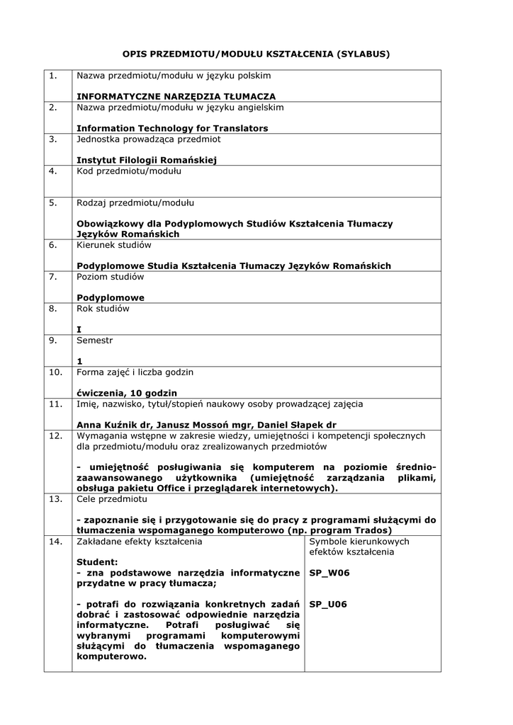 OPIS PRZEDMIOTU/MODUŁU KSZTAŁCENIA (SYLABUS) 1. Nazwa przedmiotu/modułu w języku polskim 2. INFORMATYCZNE NARZĘDZIA TŁUMACZA Nazwa przedmiotu/modułu w języku angielskim 3. Information Technology for Translators Jednostka prowadząca przedmiot 4. Instytut Filologii Romańskiej Kod przedmiotu/modułu 5. Rodzaj przedmiotu/modułu 6. Obowiązkowy dla Podyplomowych Studiów Kształcenia Tłumaczy Języków Romańskich Kierunek studiów 7. Podyplomowe Studia Kształcenia Tłumaczy Języków Romańskich Poziom studiów 8. Podyplomowe Rok studiów 9. I Semestr 10. 1 Forma zajęć i liczba godzin 11. ćwiczenia, 10 godzin Imię, nazwisko, tytuł/stopień naukowy osoby prowadzącej zajęcia 12. Anna Kuźnik dr, Janusz Mossoń mgr, Daniel Słapek dr Wymagania wstępne w zakresie wiedzy, umiejętności i kompetencji społecznych dla przedmiotu/modułu oraz zrealizowanych przedmiotów 13. 14. - umiejętność posługiwania się komputerem na poziomie zaawansowanego użytkownika (umiejętność zarządzania obsługa pakietu Office i przeglądarek internetowych). Cele przedmiotu średnioplikami, - zapoznanie się i przygotowanie się do pracy z programami służącymi do tłumaczenia wspomaganego komputerowo (np. program Trados) Zakładane efekty kształcenia Symbole kierunkowych efektów kształcenia Student: - zna podstawowe narzędzia informatyczne SP_W06 przydatne w pracy tłumacza; - potrafi do rozwiązania konkretnych zadań dobrać i zastosować odpowiednie narzędzia informatyczne. Potrafi posługiwać się wybranymi programami komputerowymi służącymi do tłumaczenia wspomaganego komputerowo. SP_U06 15. Treści programowe 16. Przedmiot zakłada zapoznanie się słuchaczy z programami służącymi do tłumaczenia wspomaganego komputerowo (np. Trados). Zalecana literatura 17. Bogucki Ł., Tłumaczenie wspomagane komputerowo Eckstein M., Sosnowski R., Komputer w pracy tłumacza: praktyczny poradnik, "Tertium" Krakowskie Towarzystwo Wiedzy o Komunikacji Językowej, Kraków 2004. Forma zaliczenia poszczególnych komponentów przedmiotu/modułu, sposób sprawdzenia osiągnięcia zamierzonych efektów kształcenia 18. zaliczenie na postawie ocen z ćwiczeń wykonywanych na zajęciach i w domu Język wykładowy 19. polski Obciążenie pracą studenta Forma aktywności studenta Średnia liczba godzin na zrealizowanie aktywności Godziny zajęć (wg planu studiów) z nauczycielem - ćwiczenia: Praca własna studenta: 10 40 - przygotowanie do zajęć (przygotowanie zadanych ćwiczeń); - przygotowanie do testów; - czytanie wskazanej literatury. Suma godzin Liczba punktów ECTS 50 2