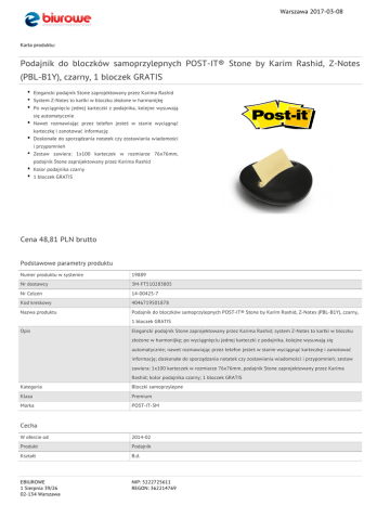 Warszawa 2017-03-08 Karta produktu: Podajnik do bloczków samoprzylepnych POST-IT® Stone by Karim Rashid, Z-Notes (PBL-B1Y), czarny, 1 bloczek GRATIS Elegancki podajnik Stone zaprojektowany przez Karima Rashid System Z-Notes to kartki w bloczku złożone w harmonijkę Po wyciągnięciu jednej karteczki z podajnika, kolejne wysuwają się automatycznie Nawet rozmawiając przez telefon jesteś w stanie wyciągnąć karteczkę i zanotować informację Doskonałe do sporządzania notatek czy zostawiania wiadomości i przypomnień Zestaw zawiera: 1x100 karteczek w rozmiarze 76x76mm, podajnik Stone zaprojektowany przez Karima Rashid Kolor podajnika czarny 1 bloczek GRATIS Cena 48,81 PLN brutto Podstawowe parametry produktu Numer produktu w systemie 19889 Nr dostawcy 3M-FT510283805 Nr Celcen 14-00425-7 Kod kreskowy 4046719501878 Nazwa produktu Podajnik do bloczków samoprzylepnych POST-IT® Stone by Karim Rashid, Z-Notes (PBL-B1Y), czarny, 1 bloczek GRATIS Opis Elegancki podajnik Stone zaprojektowany przez Karima Rashid; system Z-Notes to kartki w bloczku złożone w harmonijkę; po wyciągnięciu jednej karteczki z podajnika, kolejne wysuwają się automatycznie; nawet rozmawiając przez telefon jesteś w stanie wyciągnąć karteczkę i zanotować informację; doskonałe do sporządzania notatek czy zostawiania wiadomości i przypomnień; zestaw zawiera: 1x100 karteczek w rozmiarze 76x76mm, podajnik Stone zaprojektowany przez Karima Rashid; kolor podajnika czarny; 1 bloczek GRATIS Kategoria Bloczki samoprzylepne Klasa Premium Marka POST-IT-3M Cecha W ofercie od 2014-02 Produkt Podajnik Kształt B.d. EBIUROWE 1 Sierpnia 39/26 02-134 Warszawa NIP: 5222725611 REGON: 362214769 Warszawa 2017-03-08 Karta katalogowa produktu cd. Podajnik do bloczków samoprzylepnych POST-IT® Stone by Karim Rashid, Z-Notes (PBL-B1Y), czarny, 1 bloczek GRATIS Rodzaj B.d. Ekologiczność B.d. Typ Standard Materiał Papier Wymiary Pojemność (mm) B.d. Rozmiar B.d. Szerokość (mm) B.d. Grubość (mm) B.d. Gramatura (g/m2) B.d. Wymiary (mm) 76x76 Wspólny słownik zamówień CPV 22816300-6 Bloczki samoprzylepnych karteczek na notatki Certyfikaty Nowy produkt w ofercie Standard Hit Standard Kolor Kolor Czarny Ilość Ilość kartek 100 Pozostałe zdjęcia produktu Serdecznie zapraszamy do współpracy EBIUROWE zespół. EBIUROWE 1 Sierpnia 39/26 02-134 Warszawa NIP: 5222725611 REGON: 362214769