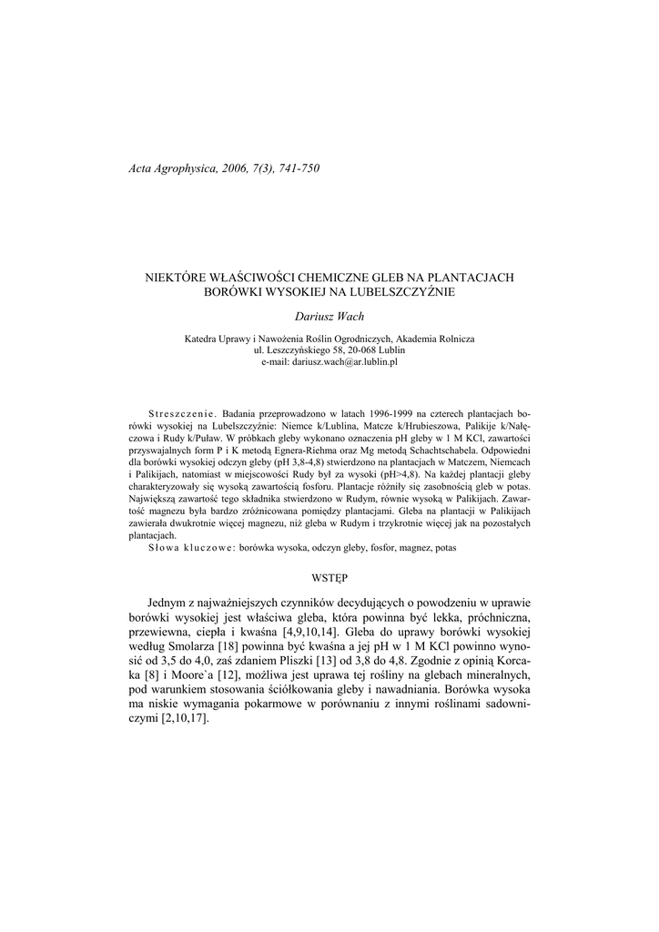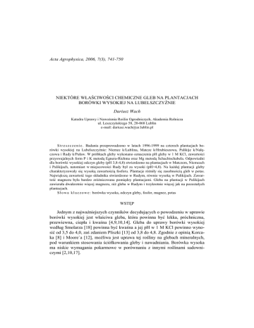 Acta Agrophysica, 2006, 7(3), 741-750 NIEKTÓRE WŁAŚCIWOŚCI CHEMICZNE GLEB NA PLANTACJACH BORÓWKI WYSOKIEJ NA LUBELSZCZYŹNIE Dariusz Wach Katedra Uprawy i NawoŜenia Roślin Ogrodniczych, Akademia Rolnicza ul. Leszczyńskiego 58, 20-068 Lublin e-mail: [email protected] S t r e s z c z e n i e . Badania przeprowadzono w latach 1996-1999 na czterech plantacjach borówki wysokiej na Lubelszczyźnie: Niemce k/Lublina, Matcze k/Hrubieszowa, Palikije k/Nałęczowa i Rudy k/Puław. W próbkach gleby wykonano oznaczenia pH gleby w 1 M KCl, zawartości przyswajalnych form P i K metodą Egnera-Riehma oraz Mg metodą Schachtschabela. Odpowiedni dla borówki wysokiej odczyn gleby (pH 3,8-4,8) stwierdzono na plantacjach w Matczem, Niemcach i Palikijach, natomiast w miejscowości Rudy był za wysoki (pH>4,8). Na kaŜdej plantacji gleby charakteryzowały się wysoką zawartością fosforu. Plantacje róŜniły się zasobnością gleb w potas. Największą zawartość tego składnika stwierdzono w Rudym, równie wysoką w Palikijach. Zawartość magnezu była bardzo zróŜnicowana pomiędzy plantacjami. Gleba na plantacji w Palikijach zawierała dwukrotnie więcej magnezu, niŜ gleba w Rudym i trzykrotnie więcej jak na pozostałych plantacjach. S ł o w a k l u c z o w e : borówka wysoka, odczyn gleby, fosfor, magnez, potas WSTĘP Jednym z najwaŜniejszych czynników decydujących o powodzeniu w uprawie borówki wysokiej jest właściwa gleba, która powinna być lekka, próchniczna, przewiewna, ciepła i kwaśna [4,9,10,14]. Gleba do uprawy borówki wysokiej według Smolarza [18] powinna być kwaśna a jej pH w 1 M KCl powinno wynosić od 3,5 do 4,0, zaś zdaniem Pliszki [13] od 3,8 do 4,8. Zgodnie z opinią Korcaka [8] i Moore`a [12], moŜliwa jest uprawa tej rośliny na glebach mineralnych, pod warunkiem stosowania ściółkowania gleby i nawadniania. Borówka wysoka ma niskie wymagania pokarmowe w porównaniu z innymi roślinami sadowniczymi [2,10,17]. 742 D. WACH MATERIAŁ I METODY Badania przeprowadzono w latach 1996-1999 na czterech plantacjach borówki wysokiej na Lubelszczyźnie: Niemce k/Lublina, Matcze k/Hrubieszowa, Palikije k/Nałęczowa i Rudy k/Puław. Plantacja w Niemcach k/Lublina została załoŜona wiosną 1993 roku na glebie kompleksu Ŝytniego dobrego, klasy bonitacyjnej IVa. Przez pierwsze trzy lata po posadzeniu stosowano tylko nawoŜenie azotowe w dawce 60 kg N⋅ha-1 dzielonej na trzy równe części w formie siarczanu amonu. Od jesieni 1996 roku stosowano nawozy potasowe a wiosną magnezowe w dawkach 60 kg K2O i 10 kg MgO⋅ha-1. Plantacja w Matczem k/Hrubieszowa została załoŜona wiosną 1990 roku na glebie kompleksu Ŝytniego bardzo dobrego i dobrego, klasy bonitacyjnej III b i IV a. W latach 1996-1997 zastosowano łącznie 78,2 kg N·ha-1, w tym 56,6 kg N w postaci saletry amonowej. W dawce 133 kg wieloskładnikowego Fructus 1 dostarczono: 22,6 kg N, 11,5 kg P2O5, 23,5 kg K2O i 9,3 kg MgO. Dodatkowo zastosowano 50 kg K2O⋅ha-1 w formie siarczanu potasu. W 1998 roku zastosowano łącznie 82,9 kg N, w tym 67,6 kg N w postaci siarczanu amonu dawką 150 kg MIS-3 dostarczono: 15,3 kg N; 12,3 kg P2O5; 23 kg K2O i 9,2 kg MgO. W 1999 roku zmniejszono dawki nawozów, które wyniosły 37,5 kg N, w tym 27,3 kg N jako siarczan amonu. Zastosowano teŜ 100 kg nawozu MIS-3, który zawierał: 10,2 kg N; 8,1 kg P2O5, 15,3 kg K2O i 6,1 kg MgO. Plantacja w Palikijach k/ Nałęczowa została załoŜona wiosną 1990 roku na glebie brunatnej właściwej kompleksu pszennego dobrego, II klasy bonitacyjnej. W latach 1996,1997 i 1999 stosowano łącznie 54,5 kg N, 10 kg P2O5, 22 kg K2O i 5 kg MgO na ha. Azot dostarczany był w postaci siarczanu amonu (41 kg·ha-1) w 1 dawce doglebowo wiosną. Część azotu i pozostałe składniki pokarmowe stosowano w czasie wegetacji łącznie z nawadnianiem a ich dawki wynikały z ilości i składu chemicznego nawozu płynnego Multivit. W 1998 roku dawka azotu wyniosła 47,7 kg N, z czego 20,5 kg w postaci siarczanu amonu. Pozostała część tj. 27,2 kg N oraz 12,8 kg P2O5, 38,2 kg K2O i 9 kg MgO wynikała ze składu chemicznego nawozu wieloskładnikowego Azofoska (200 kg). Plantacja w Rudym k/ Puław została załoŜona wiosną 1990 roku na glebie kompleksu Ŝytniego bardzo dobrego i dobrego, klasy bonitacyjnej III b i IV a. Wiosną w latach 1996-1997 zastosowano nawozy azotowe w dawce 68 kg N·ha-1 podzielonej na dwie równe części. Nawóz potasowy uŜyto w dawce 50 kg K2O·ha-1 w formie siarczanu. Od roku 1998 zwiększono dawkę nawozu azotowego do 100 kg N·ha-1. NIEKTÓRE WŁAŚCIWOŚCI CHEMICZNE GLEB NA PLANTACJACH BORÓWKI 743 Próbki gleby pobierano wiosną do połowy kwietnia i w II połowie sierpnia, oddzielnie z warstwy 0-20 cm i 20-40 cm w rzędach roślin. Wykonano w nich oznaczenia pH potencjometrycznie w 1 M KCl, zawartości przyswajalnych form P i K metodą Egnera-Riehma oraz Mg metodą Schachtschabela. Wyniki analiz chemicznych opracowano statystycznie metodą analizy wariancji w układzie kompletnej randomizacji. Istotność róŜnic oceniono za pomocą przedziałów ufności Tukey`a przy poziomie istotności 0,05. WYNIKI I DYSKUSJA Jednym z najwaŜniejszych czynników decydujących o powodzeniu w uprawie borówki wysokiej jest właściwy odczyn gleby. Analizy chemiczne wykonane w czasie prowadzenia badań wykazały dość duŜe zróŜnicowanie pH gleb na plantacjach Lubelszczyzny (tab. 1). Najbardziej stabilnym odczynem charakteryzowała się gleba w badanym okresie na plantacji Matcze i to niezaleŜnie od terminu i poziomu pobierania próbek (pH 4,05-4,89). Gleba w Niemcach charakteryzowała się najniŜszym odczynem w 1996 roku, (pH 3,48-4,18), który wzrósł w warstwie powierzchniowej wiosną 1997 do pH 4,64 oraz do pH 4,73 w warstwie 20-40 cm wiosną 1999 roku. W Palikijach najniŜszą wartość pH (pH 3,9) miała gleba jesienią 1996 roku natomiast najwyŜsze pH stwierdzono równieŜ w jesiennym terminie w dwóch kolejnych lat