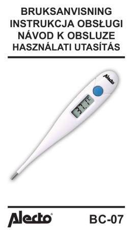 BRUKSANVISNING INSTRUKCJA OBSŁUGI NÁVOD K OBSLUZE HASZNÁLATI UTASÍTÁS BC-07 2 SWE 1 2 1: temperatursensor 2: display 3: på-/start-/stopp-/minnes-/av-knapp temperaturvisning visning av lagrad temperatur lågbatteriindikator 3 3 INLEDNING Alecto termometer är en digital termometer utformad för att mäta temperaturen på det enklaste och mest exakta sättet. Följ noga denna bruksanvisning för att få de mest tillförlitliga resultaten. För att få den mest exakta temperaturavläsningen rekommenderar vi att använda termometern rektalt. Trots att den allmänt accepterade “normala” kroppstemperaturen är 37,0°C, kan den variera från 36,1°C till 37,2°C. Temperaturvariationerna kan vara ett resultat av sådana faktorer som motion, rökning, ätande och drickande, och är även beroende av den kroppsdel där temperaturen mäts. Vid oral temperaturmätning är kroppstemperatur vanligtvis 0,5°C lägre än vid rektal mätning, medan kroppstemperatur uppmätt i armhålan är 1,0 °C lägre. Kroppstemperatur är lägre på morgonen än på kvällen. SPECIFIKATIONER Drifttemperatur: 32,0°C - 42,9°C Visning av låg temperatur: temperaturvisning ≤ 32°C: Lo°C Visning av hög temperatur: temperaturvisning ≥ 43,0°C: HI°C Gradering: 0,1°C Exakthet: 35°C - 39°C: ± 0,1°C ≤ 35°C ≥ 39°C: ± 0,2°C Feberalarm ≥ 37,5°C: 8 dubbla pip Normal temperatur ≤ 37,5°C: 4 pip Automatisk avstängning: 10 minuter ± 2 minuter Batteri: LR41, 192 eller SR41 Batteriets livslängd: 2 år Mått: 128 x 19 x 11mm Driftvillkor: Temperatur: 10°C - 40°C Luftfuktighet: 30% - 85% RH Lagringsförhållanden: Temperatur: 10°C - 60°C Luftfuktighet: 25% - -90% RH 4 TEMPERATURMÄTNING 1. Tryck på på-/av-knappen en gång för att slå på termometern. Termometern piper och 188,8°C visas i diaplayen i ca 2 sekunder. Om du håller på-/avknappen nedtryckt i ytterligare 2 sekunder, visas den senast uppmätta temperaturen. 2. Termometern visar nu en temperatur på 36,5°C. 3. När “Lo” och “°C” visas i displayen, är termometern klar för användning. Om rumstemperaturen överskrider 32,0°C, visas rumstemperaturen i stället för symbolen “Lo”. 4. Placera termometern i den utvalda kroppsdelen för att mäta temperaturen. 5. När ett pip hörs, har kroppstemperaturen sparats. • Om kroppstemperaturen är normal, hör du 4 pip. • Om kroppstemperatur är förhöjd (≥37.5°C), hör du 8 dubbla pip. 6. Tryck på på-/av-knappen för att stänga av termometern (termometern stängs av automatiskt efter ca 10 minuter). Mätning under tungan: Placera termometern under tungan, så långt det går åt höger eller vänster sida. Mätningen tar ca 10 till TEMPERATURSCHEMA TEMPERATUUR DIAGRAM 15 sekunder. Temperaturen uppmätt under tungan är ca 0,5°C lägre än vid rektal mätning 5 Mätning i armhålan: Se till att armhålan är torr och placera termometern i armhålan. Sensorn måste vidröra huden. Håll armen korsad över bröstet. Mätningen tar ca 20 sekunder. Temperaturen uppmätt i armhålan är ca 1,0°C lägre än vid rektal mätning Rektal mätning: För in sensorn på termometern försiktigt (högst 1,25 cm). Mätningen tar ca 6 till 10 sekunder. BATTERIBYTE Batteriet ska bytas ut när symbolen “ ” visas i displayen. Batterityp: 1.55V, LR41 alkaliskt eller SR41 silveroxid eller liknande. 1. Ta försiktigt bort batteriluckan från termometern. 2. 3. 4. 5. Ta bort batteriskyddet. Använd ett spetsigt (icke metalliskt) föremål för att ta ur batteriet. Sätt i det nya batteriet med +(plus) sidan uppåt. Sätt tillbaka batteriskyddet. Skjut batteriluckan på plats igen. Kasta inte urladdade eller förbrukade batterier; lämna dem i stället till lokal uppsamlingsplats för kemiskt hushållsavfall. 6 TIPS OCH VARNINGAR -- Förvara termometern och batterierna utom räckhåll för barn. -- Gå inte eller prata när du mäter temperaturen. -- Förvara termometern i ett speciellt fodral. -- Utsätt inte termometern för direkt solljus, damm eller fukt. -- Ta inte isär termometern FÖRVARING OCH RENGÖRING Rengör termometern med en mjuk trasa och alkohol eller kallt vatten och tvål före och efter användning. Termometern kan sänkas ned i vatten eller alkohol för en kort stund (blöt den inte eller sterilisera). Förvara termometern i ett speciellt fodral. CE Anordningen överensstämmer med EU-direktiv 93/42/ EEG (medicintekniska produkter). Försäkran om överensstämmelse finns på webbplatsen WWW. ALECTO.NL 7 PL 1 2 3 1 : czujnik temperatury 2 : wyświetlacz 3 : przycisk włączania/start/stop/pamięci/wyłączania wyświetlana temperatura zapamiętana wyświetlana temperatura wskaźnik słabej baterii 8 WSTĘP Termometr Alecto jest termometrem cyfrowym opracowanym w celu mierzenia temperatury w możliwie najprostszy i najdokładniejszy sposób. Aby uzyskać najbardziej wiarygodne wyniki, należy dokładnie przestrzegać niniejszej instrukcji. W celu uzyskania najdokładniejszego odczytu temperatury, zalecamy użycie termometru doodbytniczo. Pomimo, że ogólnie przyjęta „normalna” temperatura ciała wynosi 37,0°C, może się ona wahać od 36,1°C do 37,2°C. Wahania temperatury mogą być wynikiem takich czynników jak uprawianie sportu, palenie, jedzenie i picie, a także zależą od części ciała, gdzie jest mierzona temperatura. Gdy mierzona jest doustnie, temperatura ciała jest zwykle niższa o 0,5°C niż gdy mierzona jest doodbytniczo, podczas gdy temperatura mierzona pod pachą jest o 1,0 °C niższa. Temperatura ciała jest niższa rano niż wieczorem SPECYFIKACJA Zakres temperatur: Wyświetlanie niskiej temperatury: Wyświetlanie wysokiej temperatury: Gradacja wyświetlacza: Precyzja: Alarm gorączki ≥ 37,5°C: Temperatura normalna ≤ 37,5°C: Wyłączanie automatyczne: Bateria: Żywotność baterii: Wymiary: Warunki użytkowania: Warunki przechowywania: 9 32,0°C - 42,9°C temperatura ≤ 32°C wyświetla się: Lo°C temperatura ≥ 43,0°C, wy