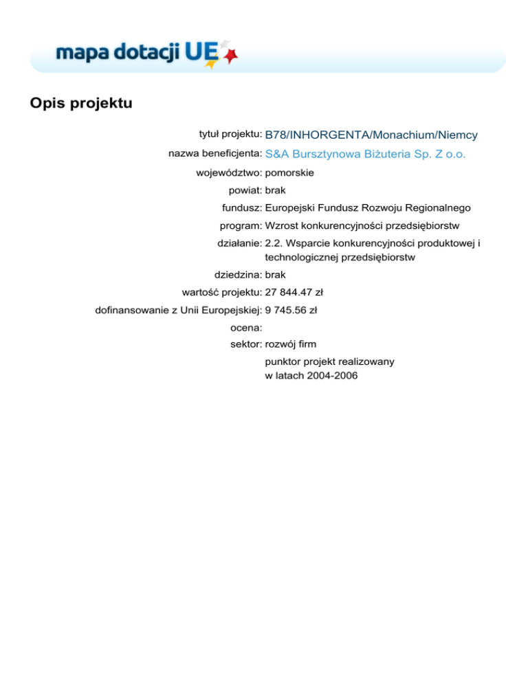 Opis projektu tytuł projektu: B78/INHORGENTA/Monachium/Niemcy nazwa beneficjenta: S&A Bursztynowa Biżuteria Sp. Z o.o. województwo: pomorskie powiat: brak fundusz: Europejski Fundusz Rozwoju Regionalnego program: Wzrost konkurencyjności przedsiębiorstw działanie: 2.2. Wsparcie konkurencyjności produktowej i technologicznej przedsiębiorstw dziedzina: brak wartość projektu: 27 844.47 zł dofinansowanie z Unii Europejskiej: 9 745.56 zł ocena: sektor: rozwój firm punktor projekt realizowany w latach 2004-2006