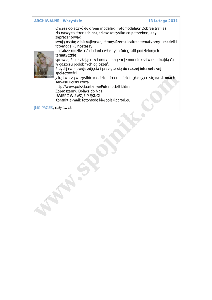 ARCHIWALNE | Wszystkie 13 Lutego 2011 .c o m Chcesz dołączyć do grona modelek i fotomodelek? Dobrze trafiłaś. Na naszych stronach znajdziesz wszystko co potrzebne, aby zaprezentować swoją osobę z jak najlepszej strony.Szeroki zakres tematyczny - modelki, fotomodelki, hostessy - a także możliwość dodania własnych fotografii podzielonych tematycznie sprawia, że działające w Londynie agencje modelek łatwiej odnajdą Cię w gąszczu podobnych ogłoszeń. Przyslij nam swoje zdjęcia i przyłącz się do naszej internetowej społeczności jaką tworzą wszystkie modelki i fotomodelki ogłaszjące się na stronach serwisu Polski Portal. http://www.polskiportal.eu/Fotomodelki.html Zapraszamy. Dołącz do Nas! UWIERZ W SWOJE PIĘKNO! Kontakt e-mail: [email protected] w w w .s po jn ik JMG PAGES, cały świat