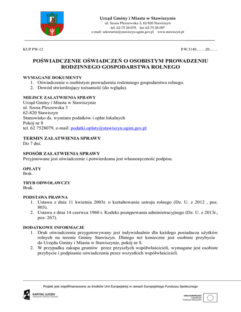 Urząd Gminy i Miasta w Stawiszynie ul. Szosa Pleszewska 3, 62-820 Stawiszyn tel. 62-75 28 079, fax 62-75 28 097 e-mail: [email protected] www.stawiszyn.pl KUP PW-12 P.W.3140.……20…… POŚWIADCZENIE OŚWIADCZEŃ O OSOBISTYM PROWADZENIU RODZINNEGO GOSPODARSTWA ROLNEGO WYMAGANE DOKUMENTY 1. Oświadczenie o osobistym prowadzeniu rodzinnego gospodarstwa rolnego. 2. Dowód stwierdzający tożsamość (do wglądu). MIEJSCE ZAŁATWIENIA SPRAWY Urząd Gminy i Miasta w Stawiszynie ul. Szosa Pleszewska 3 62-820 Stawiszyn Stanowisko ds. wymiaru podatków i opłat lokalnych Pokój nr 8 tel. 62 7528079, e-mail: [email protected] TERMIN ZAŁATWIENIA SPRAWY Do 7 dni. SPOSÓB ZAŁATWIENIA SPRAWY Przyjmowane jest oświadczenie i potwierdzana jest własnoręczność podpisu. OPŁATY Brak. TRYB ODWOŁAWCZY Brak. PODSTAWA PRAWNA 1. Ustawa z dnia 11 kwietnia 2003r. o kształtowaniu ustroju rolnego (Dz. U. z 2012 , poz. 803). 2. Ustawa z dnia 14 czerwca 1960 r. Kodeks postępowania administracyjnego (Dz. U. z 2013r., poz. 267). DODATKOWE INFORMACJE 1. Druk oświadczenia przygotowywany jest indywidualnie dla każdego posiadacza użytków rolnych na terenie Gminy Stawiszyn. Dlatego też konieczne jest osobiste przybycie do Urzędu Gminy i Miasta w Stawiszynie, pokój nr 8. 2. W przypadku zakupu gruntów przez przyszłych współwłaścicieli, wymagane jest osobiste przybycie i podpisanie oświadczenia przez wszystkich współwłaścicieli. Projekt jest współfinansowany ze środków Unii Europejskiej w ramach Europejskiego Funduszu Społecznego