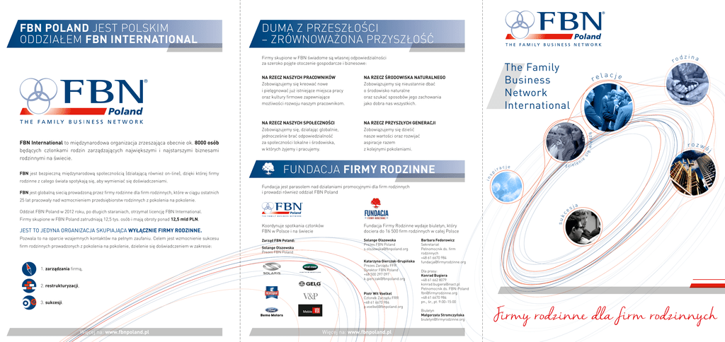FBN POLAND JEST POLSKIM ODDZIAŁEM FBN INTERNATIONAL DUMA Z PRZESZŁOŚCI – ZRÓWNOWAŻONA PRZYSZŁOŚĆ Firmy skupione w FBN świadome są własnej odpowiedzialności za szeroko pojęte otoczenie gospodarcze i biznesowe: FUNDACJA FIRMY RODZINNE rodzinne z całego świata spotykają się, aby wymieniać się doświadczeniami. FBN jest globalną siecią prowadzoną przez firmy rodzinne dla firm rodzinnych, które w ciągu ostatnich ę w iedzą NA RZECZ PRZYSZŁYCH GENERACJI Zobowiązujemy się dzielić nasze wartości oraz rozwijać aspiracje razem z kolejnymi pokoleniami. r pi en dziel acje Fundacja jest parasolem nad działaniami promocyjnymi dla firm rodzinnych i prowadzi również oddział FBN Poland 25 lat pracowały nad wzmocnieniem przedsiębiorstw rodzinnych z pokolenia na pokolenie. Firmy skupione w FBN Poland zatrudniają 12,5 tys. osób i mają obroty ponad 12,5 mld PLN. JEST TO JEDYNA ORGANIZACJA SKUPIAJĄCA WYŁĄCZNIE FIRMY RODZINNE. Koordynuje spotkania członków FBN w Polsce i na świecie Fundacja Firmy Rodzinne wydaje biuletyn, który dociera do 16 500 firm rodzinnych w całej Polsce Pozwala to na oparcie wzajemnych kontaktów na pełnym zaufaniu. Celem jest wzmocnienie sukcesu Zarząd FBN Poland: Solange Olszewska Prezes FBN Poland [email protected] 1. zarządzania firmą, Solange Olszewska Prezes FBN Poland Katarzyna Gierczak-Grupińska Prezes Zarządu FFR Dyrektor FBN Poland +48 500 297 097 [email protected] 2. restrukturyzacji, Piotr Wit Voelkel Członek Zarządu FRR +48 61 6670 984 [email protected] 3. sukcesji. Więcej na: www.fbnpoland.pl Więcej na: www.fbnpoland.pl Barbara Fedorowicz Sekretariat Pełnomocnik ds. firm rodzinnych +48 61 6670 984 [email protected] Dla prasy: Konrad Bugiera +48 61 662 8079 [email protected] Pełnomocnik ds. FBN-Poland [email protected] +48 61 6670 984 pn., śr., pt. 9:00–15:00 Biuletyn Małgorzata Stromczyńska [email protected] suk c Oddział FBN Poland w 2012 roku, po długich staraniach, otrzymał licencję FBN International. firm rodzinnych prowadzonych z pokolenia na pokolenie, dzielenie się doświadczeniem w zakresie: re si NA RZECZ NASZYCH SPOŁECZNOŚCI Zobowiązujemy się, działając globalnie, jednocześnie brać odpowiedzialność za społeczności lokalne i środowiska, w których żyjemy i pracujemy. s FBN jest bezpieczną międzynarodową społecznością (działającą również on-line), dzięki której firmy NA RZECZ ŚRODOWISKA NATURALNEGO Zobowiązujemy się nieustannie dbać o środowisko naturalne oraz szukać sposobów jego zachowania jako dobra nas wszystkich. The Family Business Network International in FBN International to międzynarodowa organizacja zrzeszająca obecnie ok. 8000 osób będących członkami rodzin zarządzających największymi i najstarszymi biznesami rodzinnymi na świecie. NA RZECZ NASZYCH PRACOWNIKÓW Zobowiązujemy się kreować nowe i pielęgnować już istniejące miejsca pracy oraz kultury firmowe zapewniające możliwości rozwoju naszym pracownikom. ro es ja ie dzina lacje rozwó j NASZA WIZJA CZY JESTEŚ NEXT GENERATION? NASZE ZASADY The Family Business Network to działania firm rodzinnych dla firm rodzinnych. Działania te mają zapewnić zrównoważoną przyszłość przedsiębiorstwom przez wszystkie pokolenia. Jeżeli masz od 18 do 40 lat, a Przyjęliśmy zasady spotkań, które są honorowo przestrzegane Przedstawicielstwa w 60 krajach dostarczają różnorodne programy dla firm rodzinnych i skupiają: • ponad 2700 rodzin i ponad 8000 osób z firm rodzinnych, • właścicieli, liderów i przyszłych liderów, • stabilne duże firmy z wieloletnim lub wielopokoleniowym doświadczeniem stanowiące platformę spotkań i wymiany doświadczeń i wiedzy, • firmy rodzinne, które podczas cyklicznych spotkań w poszczególnych krajach są zwiedzane oraz poznawani są ich właściciele i sposób zarządzania ich firmami z pokolenia na pokolenie, • platformę on-line funkcjonującą wyłącznie dla członków FBN i zapewniającą dostęp do wiedzy. • jeszcze nie dołączyłeś do rodzinnego biznesu oraz nadal jesteś na etapie edukacji lub na wczesnym etapie kariery poza biznesem rodzinnym, • rozpocząłeś pracę w rodzinnej firmie i chciałbyś rozwijać swoje umiejętności w takich dziedzinach, jak zarządzanie konfliktem, negocjacje czy komunikacja, lub ZAUFANIE I OTWARTOŚĆ Sieć oparta jest na zasadach otwartej komunikacji i zaufania. AKTYWNY UDZIAŁ Aktywne uczestnictwo członków jest istotnym elementem, który nadaje organizacji odpowiednią wartość. POUFNOŚĆ Członkowie są zobowiązani do wymiany doświadczeń i spostrzeżeń w atmosferze poufności. • nie pracujesz od jakiegoś czasu w rodzinnej firmie, a mimo to chcesz rozwijać przedsiębiorstwo, SZACUNEK I PROFESJONALIZM Dyskusje i debaty są zawsze prowadzone w sposób profesjonalny i z zachowaniem szacunku dla drugiego człowieka. nasz program dedykowany jest właśnie Tobie! ZAKAZ POZYSKIWANIA KLIENTÓW FFR nie jest miejscem sprzedaży produktów lub usług na rzecz innych członków – jest to edukacyjne forum służące wymianie idei, doświadczeń i wiedzy. DZIAŁANIA OBEJMUJĄCE NxG • możliwość międzynarodowej kariery – staże w Polsce i za granicą w stowarzyszonych firmach • międzynarodowe wydarzenia • forum NxG w FBN-I Summit • internetowa platforma społeczna wyłącznie dla członków KRYTERIA PRZYJMOWANIA NOWYCH CZŁONKÓW FBN • 12 lat istnienia firmy • obroty minimalne 3 mln EUR rocznie • 50 + 1% własności firmy w rękach rodziny • 2 osoby z rodziny mają wpływ na rozwój firmy • polecenie dotychczasowych 2 członków wprowadzających Więcej na: www.fbnpoland.pl Więcej na: www.fbnpoland.pl Więcej na: www.fbnpoland.pl