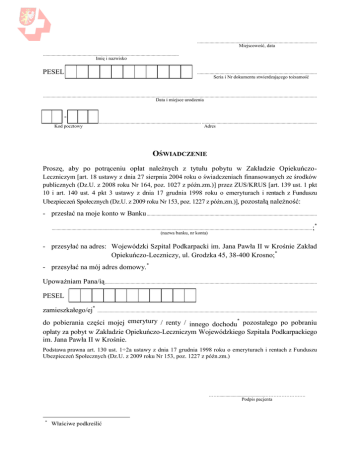................................................................................................. Miejscowość, data .............................................................................................................. Imię i nazwisko PESEL ................................................................................................. Seria i Nr dokumentu stwierdzającego tożsamość .............................................................................................................................................................................................................................. Data i miejsce urodzenia Kod pocztowy ................................................................................... ............................................................................................... Adres OŚWIADCZENIE Proszę, aby po potrąceniu opłat należnych z tytułu pobytu w Zakładzie OpiekuńczoLeczniczym [art. 18 ustawy z dnia 27 sierpnia 2004 roku o świadczeniach finansowanych ze środków publicznych (Dz.U. z 2008 roku Nr 164, poz. 1027 z późn.zm.)] przez ZUS/KRUS [art. 139 ust. 1 pkt 10 i art. 140 ust. 4 pkt 3 ustawy z dnia 17 grudnia 1998 roku o emeryturach i rentach z Funduszu Ubezpieczeń Społecznych (Dz.U. z 2009 roku Nr 153, poz. 1227 z późn.zm.)], pozostałą należność: - przesłać na moje konto w Banku .......................................................................................................................................... ................................................................................................................................................................................................................... ; (nazwa banku, nr konta) * - przesyłać na adres: Wojewódzki Szpital Podkarpacki im. Jana Pawła II w Krośnie Zakład Opiekuńczo-Leczniczy, ul. Grodzka 45, 38-400 Krosno;* - przesyłać na mój adres domowy.* Upoważniam Pana/ią............................................................................................................................................................................ PESEL zamieszkałego/ej* .................................................................................................................................................................................. do pobierania części mojej emerytury / renty / innego dochodu* pozostałego po pobraniu opłaty za pobyt w Zakładzie Opiekuńczo-Leczniczym Wojewódzkiego Szpitala Podkarpackiego im. Jana Pawła II w Krośnie. Podstawa prawna art. 130 ust. 1÷2a ustawy z dnia 17 grudnia 1998 roku o emeryturach i rentach z Funduszu Ubezpieczeń Społecznych (Dz.U. z 2009 roku Nr 153, poz. 1227 z późn.zm.) …….......................................……………………. Podpis pacjenta * Właściwe podkreślić