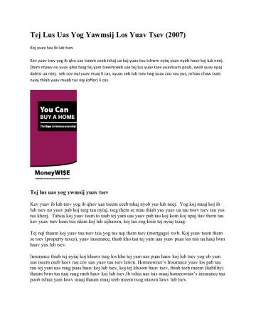 Tej Lus Uas Yog Yawmsij Los Yuav Tsev (2007) Koj yuav tau ib lub tsev Kev yuav tsev yog ib qho uas tseem ceeb tshaj ua koj yuav tau tshwm nyiaj yuav nyob hauv koj lub neej. Daim ntawv no yuav qhia txog tej yam tseemceeb uas tej tus yuav tsev yuavtsum paub, xwsli yuav npaj dabtsi ua ntej, seb cov nqi yuav muaj li cas, xyuas seb lub tsev twg yuav zoo rau yus, nrhiav chaw txais nyiaj thiab yuav muab tus nqi (offer) li cas. Tej lus uas yog ywmsij yuav tsev Kev yuav ib lub tsev yog ib qhov uas tseem ceeb tshaj nyob yus lub neej. Yog koj muaj koj ib lub tsev no yuav pab koj tseg tau nyiaj, tseg them se ntau thiab yus yuav ua tau tswv tsev rau yus tus kheej. Tabsis koj yuav tsum to taub tej yam uas yuav pab tau koj kom koj npaj tiav them tau kev yuav tsev kom tsis nkim koj lub sijhawm, koj tus zog losis tej nyiaj txiag. Tej nqi thaum koj yuav tau tsev tsis yog tus nqi them tsev (mortgage) xwb. Koj yuav tsum them se tsev (property taxes), yuav insurance, thiab kho tau tej yam uas yuav puas los tsis ua hauj lwm hauv yus lub tsev. Insurance thiab tej nyiaj koj khaws tseg los kho tej yam uas puas hauv koj lub tsev yog ob yam uas tseem ceeb heev rau cov uas yuav tau tsev lawm. Homeowner’s Insurance yuav los pab tau rau tej yam uas raug puas hauv koj lub tsev, koj tej khoom hauv tsev, thiab teeb meem (liability) thaum lwm tus tuaj raug mob hauv koj lub tsev.Ib txhia uas tsis muaj homeowner’s insurance tau poob txhua yam lawv muaj thaum muaj teeb meem txog ntawm lawv lub tsev. Kev npaj yuav tsev Kev yuav tsev yog ib qhov tseem ceeb heev. Yuavuav siv sijhawm ntau. Thawj kauj ruam yog npaj koj cov nyiajtxiag: • • • • • • Tsegnyiaj. Muab nyiaj khaws rau tom tsev txhab nyiaj (savings account) txhua hli tseg rau qhov nyiaj downpayment. Cov nyiaj no yog los tseg rau lub tsev qhov downpayment uas yuav txog li 3% mus rau 20% ntawm lub tsev tus nqi losis yog koj xav no them ntau txiv los tau thiab. Yog ntau npaum li cas los haj yam zoo dua. Yog koj cov nyiaj downpayment tsis muaj txog 20% ces cov chaw qiv nyiaj yuav kom koj them nyiaj ntxiv rau cov private mortgage insurance (PMI). Yog li no, koj yuav tau them nqi tsev ntau me ntsis txhua lub hlis. Tej tus pab yuav tsev (housing counseling). Koom nrog HUD tej kev pab tswvyim yuav tsev. Yog koj xav nrhiav tej kev pab li no mus rau HUD qhov web site uas qhia txog Yuav Tsev (http://www.hud.gov/buying) es nyem lo lus “Housing Counselor,” losis hu mus rau tus xovtooj 800-569-4287. Keebkwm them nuj nqi. Yog koj them nuj nqi zoo ces koj yuav tau them paj laum tsawg. Yog koj xav kom tau keebkwm them nuj nqi zoo ces them koj tej nuj nqi raws li sijhawm. Yog koj xav tau ib daim ntawv tshabxu dawb qhia tau tias koj them nuj nqi zoo li cas ces mus rau Annual Credit Report lub website (http://www.annualcreditreport.com) losis hu tus xovtooj 877-322-8228. Yog koj tau daim ntawv no lawm es pom tias tej yam tsis yog (xwsli muaj koj tsev neeg losis lwm tus uas muaj tib lub npe cov nuj nqi thiab) ces nyeem ntxiv thiab ua raws li daim ntawv no hais tom qab seb yuav kho li cas. Siv nyiaj zoo (budget). Sau tej yam uas koj yuav tseg rau ib daim ntawv. Ua li no koj thiaj li paub tias yuav txo koj kev siv li cas thiaj li khaws tau nyiaj los yuav ib lub tsev. Yog koj xav nrhiav tswvyim siv nyiaj zoo nomus xyuas tau “Manage Your Money Wisely" uas nyob rau MoneyWi$e (http://www.money-wise.org). Nyiaj tau los thiab qub txeeg qub teg (assets). Sau seb tagnrho koj tsev neeg cov nyiaj tau los muaj npaum li cas (xwsli nyiaj khwv los, nyiaj them los rau menyuam, nyiaj nomtswv xa tuaj thiab lwm qhov uas yus tau nyiaj los) thiab tej qub txeeg qub teg (xwsli cov txais nyiaj sau tawm, cov txhab nyiaj yuav paj me losis nyiaj laus.) Nyiaj qiv. Tagnrho koj cov nyiaj qiv no muaj npaum li cas? Sau tseg seb koj siv li cas xws li tej nuj nqi txhua hli, nyiaj xauj tsev, nyiaj them insurance, nyiaj them tsheb thiab tej nuj nqi tiv los mus rau lwm yam. Koj yuav txais tauj nyiaj ntau npaum li cas? Tsuas yog tsawg tsawg leej thiaj li muaj nyiaj txaus them tus nqi tsev tagnrho. Tabsis feem coob ces yuavtsum tau mus thov qiv nyiaj los yuav tsev. Tej yam uas yuav qhia tias koj yuav qiv tau cov zoo li cas thiab npaum li cas yog: • • • • • Koj kev them tej nuj nqi zoo li cas Koj thiab koj tsev neeg uas yuav pab koj txais tus nqi muaj nyiaj li cas Koj cov nyiaj nas tseg rau tsev (downpayment) ntau npaum li cas Koj tej nuj nqi ntau npaum cas Koj cov nyiaj uas koj tseg tau ntau npaum li cas • Koj xaiv them koj cov nuj nqi li cas (xws li fixed rate losis adjustable rate) Tom qab ntawd, seb lub tsev koj xav yuav zoo li cas, xwsli ib lub tsev rau tib yim xwb, los sis ib lub uas muaj lwm lub tsev sib txuas,los sis lwm hom tsev no, yuav los raug rau hom nyiaj (loan) uas koj txais tau. . Yog muab saib los ces yog koj xav them tus nqi tsawg ces koj yuavtsum ua kom koj cov nuj nqi tsawg li tsawg tau. Yog ua tau noces them koj cov nuj nqi tag kom tsawg li uas tsawg tau ua ntej koj sau ntawv mus thov nyiaj. Yog koj cov nyiaj nas tseg rau tsev ntau ces koj tau txais nyiaj yuav tsev tsawg. Tus nqi uas koj yuavtsum tau nrhiav nyiaj los nas tseg mas yuavtsum yog muab feem los ntawm seb qhov twg tsawg tshaj, xwsli seb yog tus nqi uas koj yuav lub tsev ntawd los yog tus nqi uas tau ntsuas seb lub tsev muaj nqi npaum li cas. Cov uas muag thiab cov uas qiv nyiaj nyiam siv 20% (losis 1 feem 5) ntawm tus nqi tiv paib los ua tus nqi nas tseg, tabsis muaj tej tus uas yuav li 3% xwb (losis txog li ze 1 feem ntawm 30) los tau thiab. Tabsis txhob rawm nas tagnrho koj cov nyiaj— koj tseem yuav tau siv nyiaj los ua ntaub ntawv kaw qhov kev sib hais tsev no thiab los pab koj tsiv. Yog koj xav paub tej qhov uas yuav pab nrhiav nyiaj nas rau tsev nua ces mus rau Local Homebuying Programs (http://portal.hud.gov/hudportal/HUD?src=/buying/localbuying) chaw faisfab (internet) los tau. Thaum uas koj ua ntaub ntawv txais nyiaj, cov qiv nyiaj ntawd yuav saib tej nyiaj uas koj ua tau thiab tej nqi uas koj muaj seb koj