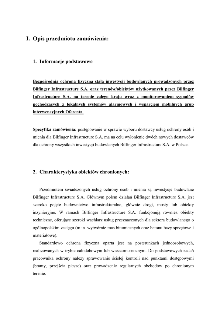 I. Opis przedmiotu zamówienia: 1. Informacje podstawowe Bezpośrednia ochrona fizyczna stała inwestycji budowlanych prowadzonych przez Bilfinger Infrastructure S.A. oraz terenów/obiektów użytkowanych przez Bilfinger Infrastructure S.A. na terenie całego kraju wraz z monitorowaniem sygnałów pochodzących z lokalnych systemów alarmowych i wsparciem mobilnych grup interwencyjnych Oferenta. Specyfika zamówienia: postępowanie w sprawie wyboru dostawcy usług ochrony osób i mienia dla Bilfinger Infrastructure S.A. ma na celu wyłonienie dwóch nowych dostawców dla ochrony wszystkich inwestycji budowlanych Bilfinger Infrastructure S.A. w Polsce. 2. Charakterystyka obiektów chronionych: Przedmiotem świadczonych usług ochrony osób i mienia są inwestycje budowlane Bilfinger Infrastructure S.A. Głównym polem działań Bilfinger Infrastructure S.A. jest szeroko pojęte budownictwo infrastrukturalne, głównie drogi, mosty lub obiekty inżynieryjne. W ramach Bilfinger Infrastructure S.A. funkcjonują również obiekty techniczne, oferujące szeroki wachlarz usług przeznaczonych dla sektora budowlanego o ogólnopolskim zasięgu (m.in. wytwórnie mas bitumicznych oraz betonu bazy sprzętowe i materiałowe). Standardowo ochrona fizyczna oparta jest na posterunkach jednoosobowych, realizowanych w trybie całodobowym lub wieczorno-nocnym. Do podstawowych zadań pracownika ochrony należy sprawowanie ścisłej kontroli nad punktami dostępowymi (bramy, przejścia piesze) oraz prowadzenie regularnych obchodów po chronionym terenie. 3. Zakres zlecanej usługi Zadania ramowe dla służby ochrony: • Zapobieganie wystąpieniu zakłóceń porządku na terenie prowadzonych inwestycji. • Zapobieganie wystąpieniu kradzieży aktywów Zamawiającego. • Przeciwdziałanie przedostawaniu się na teren obiektu osób nie posiadających uprawnień (zarówno przez bramy wjazdowe, jak i ogrodzenie obiektu). • Zapobieganie kradzieżom sprzętu i materiałów budowlanych. • W godzinach prowadzenia prac oraz występowania ruchu kołowego, pełna obsługa bramy wjazdowej (kontrola, rejestracja) pod kątem ruchu materiałowego, jak i ruchu pieszego. • W godzinach po zakończeniu prowadzenia prac oraz po obniżeniu natężenia ruchu kołowego, realizowanie obchodów terenu obiektu. • Stosowanie się i reagowanie na przypadki łamania procedur bezpieczeństwa i BHP. • Nadzorowanie wskazanych wyładunków i załadunków. • Sprawdzanie prawidłowości zamknięć kontenerów, bram i okien. • Współdziałanie z przedstawicielem Zamawiającego w rutynowych kontrolach osób pod kątem trzeźwości. • Reagowanie na wypadek stwierdzenia przebywania na terenie inwestycji osób będących pod wpływem alkoholu lub innych środków o podobnym działaniu. • Zapobieganie ujawnieniu tajemnic Zamawiającego. • Nadzór nad przestrzeganiem regulaminów obiektowych. • Reagowanie na wszelkiego rodzaju zagrożenie dla życia, zdrowia osób przebywających na terenie obiektu lub aktywów Zamawiającego. • Reagowanie na wszelkie próby zakłócenia porządku, regulaminu lub próby kradzieży. • Podejmowanie reakcji na wypadek ujawnienia faktu lub wszelkich śladów wskazujących na zaistnienie czynu przestępczego. • Wykonywanie podstawowych prac porządkowych w okolicach posterunku, w tym zapewnienie środków czystości na własne potrzeby. Służba ochrony wspierana jest przez grupę interwencyjną, składającą się z dwóch pracowników ochrony posiadających wpisy kwalifikacyjne każdy, wyposażonych w broń palną krótką bojową (opcjonalnie, w zależności od wymogów bezpieczeństwa), środki przymusu bezpośredniego oraz środki łączności. Do zadań grup interwencyjnych należy bezzwłoczne reagowanie na sygnały pochodzące z lokalnych systemów sygnalizacji włamania, systemów antynapadowych lub na wezwanie telefoniczne oraz prowadzenie rutynowych zadań patrolowych w rejonie obiektu wraz z kontrolą służby ochrony stacjonarnej. Standardowy czas dojazdu grupy interwencyjnej na sygnał alarmowy (czas może ulec wydłużeniu w przypadku realizacji usługi w lokalizacjach oddalonych od miejsca stacjonowania grup interwencyjnych – ustalane indywidualnie): • 5 min. w ciągu nocy (godz. 18.00-6.00), • 15 min. w ciągu dnia (godz. 6.00-18.00) 4. Wymagania w stosunku do Oferenta: Warunek Opis Polisa ubezpieczeniowa Dysponowanie polisą ubezpieczeniową od odpowiedzialności cywilnej przez cały czas trwania umowy na kwotę nie mniejszą niż 4 000 000 zł – bez limitu zdarzeń. min. 500 000 zł w pełni wpłacony, Kapitał zakładowy Zaświadczenia o niezaleganiu Oświadczenia o terminowym regulowaniu płatności wynagrodzeń Koncesja na prowadzenie usług Zaświadczenia o niezaleganiu z należnościami w stosunku do ZUS i Urzędu Skarbowego, wystawione nie później niż na 2 miesiące przed datą złożenia oferty. Oświadczenia o terminowym regulowaniu płatności wynagrodzeń na rzecz pracowników ochrony (z podaniem comiesięcznych terminów przekazywania środków na rzecz osoby zatrudnionej) Posiadania aktualnej koncesji MSW na usługi ochrony osób i mienia oraz udokumentowania nieprzerwanego prowadzenia takiej działalności przez co najmniej 5 lat. ochrony osób i mienia Zezwolenie na broń na okaziciela Doświadczenie Posiadanie aktualnej decyzji na posiadanie broni na okaziciela w zakresie uzbrojenia grup interwencyjnych przewidzianych do realizacji usługi. Oferent dysponuje potwierdzeniem prawidłowego wykonania usług ochrony związanych z obsługą min. 3 firm z sektora budowlanego przez okres ostatnich 36 miesięcy o łącznym wolumenie roboczogodzin na poziomie nie mniejszym niż 60.000 rbg lub ekwiwalentnie wolumenie generowanych obrotów na poziomie nie mniejszym niż 480 000 zł netto – w skali 12 miesięcy. Dedykowanie osoby do kontaktów roboczych, posiadającej udokumentowane doświadczenie w ochronie inwestycji budowlanych. Prowadzenie rekrutacji pr