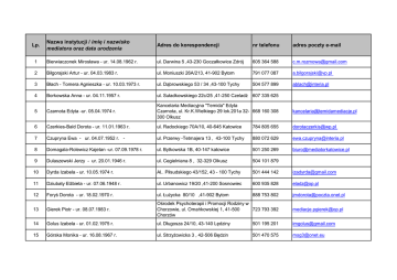 Nazwa instytucji / imię i nazwisko mediatora oraz data urodzenia Adres do korespondencji nr telefonu adres poczty e-mail 1 Bierwiaczonek Mirosława - ur. 14.08.1962 r. ul. Darwina 5 ,43-230 Goczałkowice Zdrój 605 364 588 [email protected] 2 Biłgorajski Artur - ur. 04.03.1983 r. ul. Moniuszki 26A/213, 41-902 Bytom 791 077 087 [email protected] 3 Błach - Tomera Agnieszka - ur. 10.03.1973 r. ul. Dąbrowskiego 53 / 34 ,43-100 Tychy 504 577 899 [email protected] 4 Borkowska Anna - ur. 04.11.1957 r. ul. Suładkowskiego 22c/25 ,41-250 Czeladż 607 335 625 5 Czarnota Edyta -ur. 05.04.1974 r. Kancelaria Mediacyjna "Temida" Edyta Czarnota, ul. Kr.K.Wielkiego 29 lok.201a 32- 668 160 308 300 Olkusz [email protected] 6 Czerkies-Bald Dorota - ur. 11.01.1963 r. ul. Radockiego 70A/10, 40-645 Katowice 784 805 655 [email protected] 7 Czupryna Ewa - ur. 04.07.1952 r. - ul. Przerwy -Tetmajera 13 , 43-100 Tychy 880 072 629 [email protected] 8 Domagala-Rolewicz Kajetan -ur. 07.09.1978 r. ul. Bytkowska 1B, 40-147 katowice 501 250 269 [email protected] 9 Dulaszewski Jerzy - ur. 20.01.1946 r. ul. Cegielniana 8 , 32-329 Olkusz 504 101 879 10 Dyrda Izabela - ur. 10.05.1974 r. Al.. Piłsudskiego 43/152, 43 - 100 Tychy 501 444 142 [email protected] 11 Dziubaty Elżbieta - ur. 07.06.1948 r. ul. Urbanowicz 19/20 ,41-200 Sosnowiec 600 935 828 [email protected] 12 Foryś Dorota - ur. 18.02.1970 r. ul. Łużycka 80/10 ,41-902 Bytom 888 753 802 [email protected] 13 Gierek Piotr - ur. 08.07.1983 r. Ośrodek Psychoterapii i Promocji Rodziny w Chorzowie, ul. Omańkowskiej 1, 41-500 723 793 392 Chorzów [email protected] 14 Golus Izabela - ur. 01.02.1975 r. ul. Długosza 24/10, 43-140 Lędziny 501 195 201 [email protected] 15 Górska Monika - ur. 16.08.1967 r. ul. Strzyżowicka 3 , 42-506 Będzin 501 470 575 [email protected] Lp. 16 Hachulska –Olszewska Katarzyna - ur. 28.01.1969r. ul. Ogrodowa 18/8 ,41-250 Czeladż 600 879 609 17 Kalisz Anna - ur. 03.09.1976 r. ul.Jagiellońska 19a, 44-100 Gliwice 518 135 318, 604 [email protected] 756 628 18 Kasprzyk - Brajer Helena - ur. 18.07.1956 r. ul.Główna 46 , 32-329 Bolesław 502 356 972 [email protected] 19 Kortyka - Bogdan Ewa - ur. 12.08.1971 r. Gabinet Pomocy Psychologicznej i Mediacji ,40-749 Katowice ,Pl. Kasprowicza 1/1 668 163 130 [email protected] 20 Kotela Teresa - ur. 10.03.1951 r. ul. Szczecińska 10/215 ,41-500 Chorzów 502 510 722 [email protected] 21 Krawczyk - Kalitowska Agata - ur. 08.03.1977r. ul. Białostocka 30/25 ,41-220 Sosnowiec 600 031 505 [email protected] 32 35911 41 www.fimediacje.pl 607 812 200 [email protected] Ośrodek Mediacji FAKULTAS IURIDIKA Fundacja Wydziału Prawa i Administracji Uniwersytetu Śląskiego w Katowicach , ul. Bankowa 118 , 40 - 007 Katowice ul. Wróblewskiego 38B/3, 41-106 Siemianowice Śląskie [email protected] 22 Krukowska Ewa - ur. 16.02.1949 r. 23 Kudełko Jerzy - ur. 30.09.1964 r. 24 Kula Lilla - ur. 22.07.1961 r. 32-332 Bukowno 664 738 020 [email protected] 25 Kumala Roman - ur. 15.11.1980 r. ul. Górska 30 ,32-555 Zagórze 880 360 604 [email protected] 26 Lasoń Mariola - ur. 12.05.1956 r. ul. 3 Powstania Ślaskiego 12/1 ,41-303 Dabrowa Górnicza 509 988 271 [email protected] 27 Leś Jerzy - ur. 24.06.1960 r. 32-332 Bukowno 692 327 560 [email protected] 28 Łuczak Elżbieta - ur. 18.07.1951 r. Nowa Wieś/6, 42-265 Dąbrowa Zielona 695 580 999 29 Malina Jolanta - ur. 14.01.1966 r. ul. Nowa 66A , 42 - 580 Wojkowice 726 134 813 [email protected] 30 Manowska Karolina - ur. 14.01.1981r. 41-215 Sosnowiec ,ul. Wagowa 50/54 660 566 064 [email protected] 31 Marszołek Marcin, ur. 21.04.1968 r. ul. Jagiellońska 5/15 40-035 Kaowice 602 223 430 [email protected] 32 Modrzejewski Maciej - ur 22.04.1967 r. ul. Rynek 10/5, 47-400 Racibórz 603 388 467 [email protected] 33 Neko Joanna - ur. 17.10.1974 r. ul. Warszawska 9a ,41-200 Sosnowiec 505 717 099 [email protected] 34 Olech Alicja - ur. 20.06.1954 r. ul. Tulipanów 7 ,43-100 Tychy 507 107 021 [email protected] 35 Polskie Centrum Mediacji o/Siemianowice Śl. ul. Szkolna 7, 41-100 Siemianowice Ś. 607 812 200 [email protected] 36 Raczyńska Renata - ur. 13.08.1963 r. ul. Kozia 13/7, 43-300 Bielsko Biała 517 301 547 [email protected] 37 Sitarz Olga, - ur. 23.05.1968 r. Ośrodek Mediacji FAKULTAS IURIDIKA Fundacja Wydziału Prawa i Administracji Uniwersytetu Śląskiego w Katowicach , ul. Bankowa 11B , 40 - 007 Katowice 606 626 323 [email protected] 38 Skwara Aleksandra, ur. 27.04.1964 r. ul. Łokietka 14a/3, 41-106 Siemianowice Śl. 501 409 954 [email protected] 39 Sochocka Janina - ur. 11.05.1960 r. ul. Niepodległości 42/1 ,41-106 Siemianowice Śląskie 506 332 586 [email protected] 40 Stachowicz Nina - ur. 05.09.1980 r. ul. Nowowiejska17, 42-454 Niegowonice 692 690 152 [email protected] 41 Stachura Agnieszka - ur.18.10.1970 r. ul. Partyzantów 12/20 ,42-500 Będzin 509 745 012 [email protected] 42 Szostek Jadwiga - ur. 22.03.1947 r. ul. Wodzińska 4/29 ,32-500 Chrzanów 32 623 51 89 43 Szydłowska-Bartosik Jolanta - ur. 27.02.1954 r. 44 Zielińska Natalia - ur. 17.06.1957 r. Gabinet Logopedyczno - Pedagogiczny ,ul. 1606 432 529 Maja 110/4 , 40-237 Katowice ul.. Korfantego 10B /34, 41-100 501 562 422 Siemianowice Śląskie [email protected]