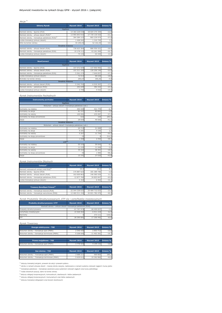 Aktywność inwestorów na rynkach Grupy GPW - styczeń 2016 r. (załącznik) Akcje 1) Główny Rynek Styczeń 2016 Styczeń 2015 Zmiana % Ogółem Wartość obrotu - łącznie (PLN) 14 360 228 038 18 604 370 394 -22,8 13 995 843 916 17 739 130 420 -21,1 364 384 123 865 239 974 -57,9 Liczba transakcji (arkusz zleceń) 1 408 942 1 310 795 7,5 WIG na koniec okresu 44 290,05 52 102,39 -15,0 736 623 364 886 956 521 -16,9 19 178 112 43 261 999 -55,7 74 155 65 540 13,1 Wartość obrotu - arkusz zleceń (PLN) 2) Wartość obrotu - transakcje pakietowe (PLN)3) Średnie dzienne Wartość obrotu - arkusz zleceń (PLN) Wartość obrotu - transakcje pakietowe (PLN) Liczba transakcji (arkusz zleceń) NewConnect Styczeń 2016 Styczeń 2015 Zmiana % Ogółem Wartość obrotu - łącznie (PLN) 107 072 609 137 850 983 -22,3 Wartość obrotu - arkusz zleceń (PLN) 101 511 335 130 206 146 -22,0 5 561 274 7 644 837 -27,3 Liczba transakcji (arkusz zleceń) 72 013 88 638 -18,8 NCIndex na koniec okresu 285,67 300,36 -4,9 5 342 702 6 510 307 -17,9 292 699 382 242 -23,4 3 790 4 432 -14,5 Wartość obrotu - transakcje pakietowe (PLN) Średnie dzienne Wartość obrotu - arkusz zleceń (PLN) Wartość obrotu - pakietowe (PLN) Liczba transakcji (arkusz zleceń) Rynek Instrumentów Pochodnych Instrumenty pochodne Styczeń 2016 Styczeń 2015 Zmiana % Ogółem Wolumen - arkusz zleceń i transakcje pakietowe (szt.) Kontrakty na indeksy Kontrakty na akcje Kontrakty na waluty Kontrakty na stopy procentowe Opcje 393 540 421 770 81 537 83 891 -6,7 -2,8 100 081 235 087 -57,4 632 164 285,4 28 654 49 006 -41,5 -1,8 Średnie dzienne Wolumen - arkusz zleceń i transakcje pakietowe (szt.) Kontrakty na indeksy 20 713 21 089 Kontrakty na akcje 4 291 4 195 2,3 Kontrakty na waluty 5 267 11 754 -55,2 Kontrakty na stopy procentowe 33 8 312,5 1 508 2 450 -38,4 Kontrakty na indeksy 55 103 59 043 -6,7 Kontrakty na akcje 11 539 11 948 -3,4 Kontrakty na waluty 39 322 48 301 -18,6 35 1 980 -98,2 15 191 27 030 -43,8 Opcje LOP4) Kontrakty na stopy procentowe Opcje Rynek Instrumentów Dłużnych Catalyst5) Styczeń 2016 Styczeń 2015 Zmiana % 69,9 64,5 Wartość obrotu - łącznie (PLN) 175 887 623 181 389 786 -3,0 Wartość obrotu - arkusz zleceń (PLN) 163 009 863 146 585 939 11,2 12 877 760 34 803 847 -63,0 5 364 6 402 -16,2 Wartość notowanych emisji (mld PLN)6) Wartość obrotu - transakcje pakietowe (PLN) Liczba transakcji (arkusz zleceń) Treasury BondSpot Poland7) Styczeń 2016 Styczeń 2015 8,4 Zmiana % Wartość obrotu - transakcje kasowe (PLN) 22 544 338 025 29 484 712 025 -23,5 Wartośc obrotu - transakcje warunkowe (PLN) 12 460 511 334 20 821 782 476 -40,2 Rynek Produktów Strukturyzowanych, ETF-ów i certyfikatów inwestycyjnych Produkty strukturyzowane i ETF Styczeń 2016 Styczeń 2015 Zmiana % Wartość obrotu - arkusz zleceń i transakcje pakietowe (PLN) Produkty strukturyzowane 67 797 974 68 499 837 Certyfikaty inwestycyjne 10 568 460 6 911 218 52,9 0 373 111 -100,0 28 390 681 17 356 492 63,6 Warranty ETF -1,0 Rynek Towarowy Energia elektryczna - TGE Styczeń 2016 Styczeń 2015 Zmiana % Wolumen obrotu - transakcje spot (MWh) 2 546 435 2 853 713 -10,8 Wolumen obrotu - transakcje terminowe (MWh) 9 208 606 11 463 361 -19,7 Prawa majątkowe - TGE Styczeń 2016 Wolumen obrotu - transakcje spot (MWh) Gaz ziemny - TGE 3 778 925 Styczeń 2016 Styczeń 2015 4 199 142 Styczeń 2015 Zmiana % -10,0 Zmiana % Wolumen obrotu - Transakcje spot (MWh) 3 688 211 969 805 280,3 Wolumen obrotu - Transakcje terminowe (MWh) 5 639 612 10 362 860 -45,6 1) dotyczy transakcji akcjami, prawami do akcji i prawami poboru 2) obroty w ramach arkusza zleceń – inaczej obroty sesyjne, realizowane w ramach systemu notowań ciągłych i kursu jednolitego 3) 4) transakcje pakietowe – transakcje zawierane poza systemem notowań ciągłych oraz kursu jednolitego liczba otwartych pozycji, dane na koniec okresu 5) dotyczy obligacji korporacyjnych, komunalnych, skarbowych i listów zastawnych 6) dotyczy obligacji korporacyjnych i komunalnych oraz listów zastawnych 7) dotyczy transakcji obligacjami oraz bonami skarbowymi