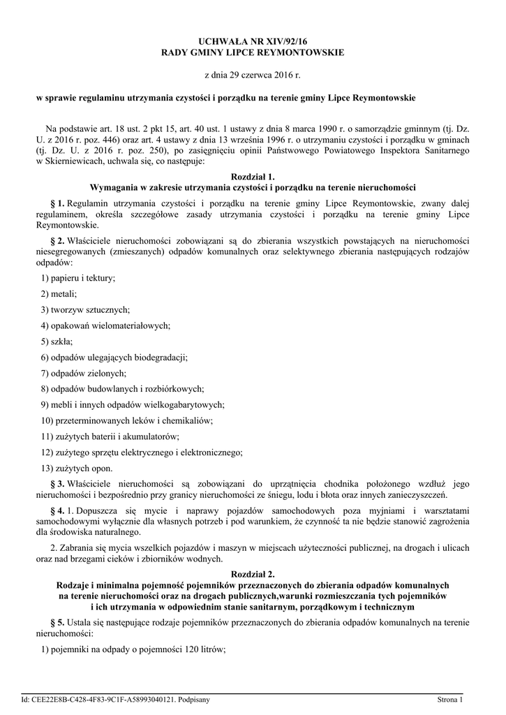 UCHWAŁA NR XIV/92/16 RADY GMINY LIPCE REYMONTOWSKIE z dnia 29 czerwca 2016 r. w sprawie regulaminu utrzymania czystości i porządku na terenie gminy Lipce Reymontowskie Na podstawie art. 18 ust. 2 pkt 15, art. 40 ust. 1 ustawy z dnia 8 marca 1990 r. o samorządzie gminnym (tj. Dz. U. z 2016 r. poz. 446) oraz art. 4 ustawy z dnia 13 września 1996 r. o utrzymaniu czystości i porządku w gminach (tj. Dz. U. z 2016 r. poz. 250), po zasięgnięciu opinii Państwowego Powiatowego Inspektora Sanitarnego w Skierniewicach, uchwala się, co następuje: Rozdział 1. Wymagania w zakresie utrzymania czystości i porządku na terenie nieruchomości § 1. Regulamin utrzymania czystości i porządku na terenie gminy Lipce Reymontowskie, zwany dalej regulaminem, określa szczegółowe zasady utrzymania czystości i porządku na terenie gminy Lipce Reymontowskie. § 2. Właściciele nieruchomości zobowiązani są do zbierania wszystkich powstających na nieruchomości niesegregowanych (zmieszanych) odpadów komunalnych oraz selektywnego zbierania następujących rodzajów odpadów: 1) papieru i tektury; 2) metali; 3) tworzyw sztucznych; 4) opakowań wielomateriałowych; 5) szkła; 6) odpadów ulegających biodegradacji; 7) odpadów zielonych; 8) odpadów budowlanych i rozbiórkowych; 9) mebli i innych odpadów wielkogabarytowych; 10) przeterminowanych leków i chemikaliów; 11) zużytych baterii i akumulatorów; 12) zużytego sprzętu elektrycznego i elektronicznego; 13) zużytych opon. § 3. Właściciele nieruchomości są zobowiązani do uprzątnięcia chodnika położonego wzdłuż jego nieruchomości i bezpośrednio przy granicy nieruchomości ze śniegu, lodu i błota oraz innych zanieczyszczeń. § 4. 1. Dopuszcza się mycie i naprawy pojazdów samochodowych poza myjniami i warsztatami samochodowymi wyłącznie dla własnych potrzeb i pod warunkiem, że czynność ta nie będzie stanowić zagrożenia dla środowiska naturalnego. 2. Zabrania się mycia wszelkich pojazdów i maszyn w miejscach użyteczności publicznej, na drogach i ulicach oraz nad brzegami cieków i zbiorników wodnych. Rozdział 2. Rodzaje i minimalna pojemność pojemników przeznaczonych do zbierania odpadów komunalnych na terenie nieruchomości oraz na drogach publicznych,warunki rozmieszczania tych pojemników i ich utrzymania w odpowiednim stanie sanitarnym, porządkowym i technicznym § 5. Ustala się następujące rodzaje pojemników przeznaczonych do zbierania odpadów komunalnych na terenie nieruchomości: 1) pojemniki na odpady o pojemności 120 litrów; Id: CEE22E8B-C428-4F83-9C1F-A58993040121. Podpisany Strona 1 2) pojemniki na odpady o pojemności 240 litrów; 3) pojemniki na odpady o pojemności 1100 litrów; 4) pojemniki (KP7, KP10) o pojemności od 7 m3 do 10 m3; 5) pojemniki na odpady komunalne segregowane odpowiednio oznakowane w stosunku do rodzaju odpadów selektywnie zbieranych, o których mowa w §2 pkt 1-5, o pojemnościach od 120 litrów do 240 litrów; 6) specjalne pojemniki na zużyte baterie; 7) pojemniki zlokalizowane przy drogach publicznych, przystankach komunikacyjnych oraz innych terenach użytku publicznego o pojemności od 20 l do 70 l. § 6. Odpady komunalne, które są segregowane, należy gromadzić w pojemnikach oznaczonych kolorem: 1) żółtym – odpady, o których mowa w §2 pkt 1-4; 2) pomarańczowym – odpady, o których mowa w §2 pkt 5. § 7. Dodatkowo będą ustawione specjalne pojemniki na: 1) zużyte baterie – w placówkach oświatowych oraz w innych obiektach użyteczności publicznej; 2) przeterminowane leki – w punktach aptecznych oraz w innych obiektach użyteczności publicznej. § 8. 1. Ustala się minimalną pojemność pojemnika do zbierania na terenie nieruchomości niesegregowanych (zmieszanych) odpadów komunalnych, jeżeli z takiego pojemnika korzysta: 1) od 1 do 4 osób – o pojemności 120 l; 2) od 5 do 8 osób – o pojemności 240 l; 3) powyżej 8 osób – odpowiednio do liczby zamieszkałych osób uwzględniając pojemności podane w pkt 1 i 2. 2. Ustala się minimalną pojemność pojemnika do selektywnego zbierania odpadów komunalnych na terenie nieruchomości, jeżeli z takiego pojemnika korzysta: 1) dla nieruchomości zamieszkałej od 1 do 7 osób: a) pojemnik na niesegregowane (zmieszane) – o pojemności 120 l; b) pojemnik na szkło – o pojemności 120 l; c) pojemnika na papier i tekturę, metale, tworzywa sztuczne i odpady wielomateriałowe – o pojemności 240 l; 2) dla nieruchomości zamieszkałej od 8 do 12 osób: a) pojemnik na niesegregowane (zmieszane) – o pojemności 240 l; b) pojemnik na szkło – 2 pojemniki o pojemności 120 l; c) pojemnika na papier i tekturę, metale, tworzywa sztuczne i odpady wielomateriałowe – 2 pojemniki o pojemności 240 l; 3) dla nieruchomości zamieszkałej przez więcej niż 12 osób: a) pojemnik na niesegregowane (zmieszane) – odpowiednio do liczby zamieszkałych osób uwzględniając pojemności podane w pkt 1 i 2; b) pojemnik na szkło – odpowiednio do liczby zamieszkałych osób uwzględniając pojemności podane w pkt 1 i 2; c) pojemnika na papier i tekturę, metale, tworzywa sztuczne i odpady wielomateriałowe – odpowiednio do liczby zamieszkałych osób uwzględniając pojemności podane w pkt 1 i 2. § 9. Pojemniki na odpady, o których mowa w §5 pkt 7, powinny być rozstawione w sposób i ilościach zapewniających utrzymanie czystości w miejscach publicznych. § 10. 1. Pojemniki na odpady komunalne należy, w dniu odbioru, wystawić na chodnik lub pobocze przed ogrodzeniem nieruchomości lub udostępnić w altance śmietnikowej z wejściem od strony ulicy, w sposób nieutrudniający komunikacji w ruchu pieszych i pojazdów oraz nie powodujący nadmiernych uciążliwości dla mieszkańców nieruchomości lub osób trzecich. Id: CEE22E8B-C428-4F83-9C1F-A58993040121. Podpisany Strona 2 2. Pojemniki należy ustawić w miejscach umożliwiających dojazd pojazdu odbierającego odpady. Je