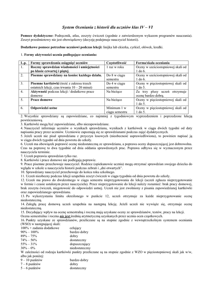 System Oceniania z historii dla uczniów klas IV – VI Pomoce dydaktyczne: Podręcznik, atlas, zeszyty ćwiczeń (zgodnie z zatwierdzonym wykazem programów nauczania). Zeszyt przedmiotowy nie jest obowiązkowy (decyzję podejmuje nauczyciel historii). Dodatkowe pomoce potrzebne uczniowi podczas lekcji: linijka lub ekierka, cyrkiel, ołówek, kredki. 1. Formy aktywności ucznia podlegające ocenianiu: L.p. 1. Formy sprawdzania osiągnięć uczniów Roczny sprawdzian wiadomości i umiejętności po klasie czwartej i piątej. Pisemne sprawdziany na koniec każdego działu. Częstotliwość 1 raz w roku Forma/skala oceniania Oceny w sześciostopniowej skali od 1 do 6. 2. Do 8 w ciągu Oceny w sześciostopniowej skali od semestru 1 do 6. 3. Pisemne kartkówki (treść z zakresu trzech Do 4 w ciągu Oceny w pięciostopniowej skali od ostatnich lekcji, czas trwania 10 – 20 minut) semestru 1 do 5. 4. Aktywność podczas lekcji / dodatkowe prace Na bieżąco Za trzy plusy uczeń otrzymuje domowe ocenę bardzo dobrą. 5. Na bieżąco Oceny w pięciostopniowej skali od Prace domowe 1 do 5. 6. Minimum 1 w Oceny w pięciostopniowej skali od Odpowiedzi ustne ciągu semestru 1 do 5. 2. Wszystkie sprawdziany są zapowiedziane, co najmniej z tygodniowym wyprzedzeniem i poprzedzone lekcją powtórzeniową. 3. Kartkówki mogą być zapowiedziane, albo niezapowiedziane. 4. Nauczyciel informuje uczniów o wynikach sprawdzianu, wynikach z kartkówek w ciągu dwóch tygodni od daty napisania pracy przez uczniów. Uczniowie zapoznają się ze sprawdzianami podczas zajęć dydaktycznych. 5. Jeżeli uczeń nie pisał sprawdzianu z przyczyn losowych (nieobecność usprawiedliwiona), to powinien napisać ją w ciągu dwóch tygodni od dnia powrotu do szkoły. 6. Uczeń ma obowiązek poprawić ocenę niedostateczną ze sprawdzianu, a poprawa oceny dopuszczającej jest dobrowolna. Czas na poprawę to dwa tygodnie od dnia oddania sprawdzonych prac. Poprawa odbywa się w wyznaczonym przez nauczyciela terminie. 7. Uczeń poprawia sprawdzian tylko raz. 8. Kartkówki i prace domowe nie podlegają poprawie. 9. Prace pisemne przechowuje nauczyciel. Rodzice (opiekunowie ucznia) mogą otrzymać sprawdzian swojego dziecka do wglądu w szkole u nauczyciela historii podczas zebrań i „dni otwartych”. 10. Sprawdziany nauczyciel przechowuje do końca roku szkolnego. 11. Uczeń nieobecny podczas lekcji uzupełnia zeszyt ćwiczeń w ciągu tygodnia od dnia powrotu do szkoły. 12. Uczeń ma prawo do dwukrotnego w ciągu semestru nieprzygotowania do lekcji (uczeń zgłasza nieprzygotowanie w formie i czasie ustalonym przez nauczyciela). Przez nieprzygotowanie do lekcji należy rozumieć: brak pracy domowej, brak zeszytu ćwiczeń, niegotowość do odpowiedzi ustnej. Uczeń nie jest zwolniony z pisania zapowiedzianej kartkówki oraz zapowiedzianego sprawdzianu. 13. Po wykorzystaniu limitu określonego w punkcie 12, uczeń otrzymuje za każde nieprzygotowanie ocenę niedostateczną. 14. Zaległą pracę domową uczeń uzupełnia na następną lekcję. Jeżeli uczeń nie wywiąże się, otrzymuje ocenę niedostateczną. 15. Decydujący wpływ na ocenę semestralną i roczną mają uzyskane oceny ze sprawdzianów, testów, pracy na lekcji. Ocena semestralna i roczna nie jest średnią arytmetyczną uzyskanych przez ucznia ocen cząstkowych. 16. Punkty uzyskane ze sprawdzianów, przeliczane są na stopnie zgodnie z wewnątrzszkolnym systemem oceniania (WSO) w następującej skali: 100% + zadania dodatkowe celujący 90% – 100% bardzo dobry 89% – 75% dobry 74% – 56% dostateczny 55% – 31% dopuszczający 30% – 0% niedostateczny W zależności od rodzaju kartkówki punkty przeliczane są na stopnie zgodnie z WZO w pięciostopniowej skali jak w/w, albo jak poniżej: 9 – 10 punktów bardzo dobry 7 – 8 punktów dobry 5 – 6 punktów dostateczny 4 – 3 punkty dopuszczający 2 – 1 punkt niedostateczny Przy ocenach bieżących dopuszcza się stosowanie znaku (+), oraz znaku (-). 17. Ocenę celującą uczeń na koniec roku szkolnego może otrzymać wtedy, jeżeli osiąga sukcesy w konkursach pozaszkolnych (ogólnopolskim, wojewódzkim, powiatowym, gminnym) oraz posiada ocenę celującą z jednego sprawdzianu. 18. Oceny za konkursy: a) udział w konkursie szkolnym – „+”, b) I, II, III miejsce w konkursie szkolnym – ocena bardzo dobra, c) udział w konkursie gminnym, powiatowym, wojewódzkim ogólnopolskim, międzynarodowym – ocena bardzo dobra, d) I, II, III miejsce w konkursie międzynarodowym, ogólnopolskim, wojewódzkim, powiatowym, gminnym – ocena celująca, e) wyróżnienie w konkursie międzynarodowym, ogólnopolskim, wojewódzkim, powiatowym, gminnym – ocena celująca, f) udział w etapie rejonowym lub wojewódzkim konkursu organizowanego przez Kuratorium Oświaty – ocena celująca. ……………… Podpis ucznia: …………………………… Podpis rodziców: ……………………… Podpis nauczyciela: