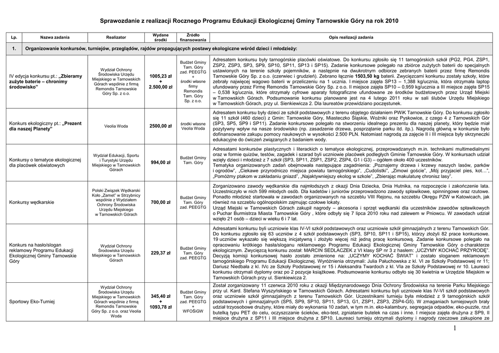 Sprawozdanie z realizacji Rocznego Programu Edukacji Ekologicznej Gminy Tarnowskie Góry na rok 2010 Lp. 1. Nazwa zadania Realizator Wydane środki Źródło finansowania Opis realizacji zadania Organizowanie konkursów, turniejów, przeglądów, rajdów propagujących postawy ekologiczne wśród dzieci i młodzieŜy: IV edycja konkursu pt.: „Zbieramy zuŜyte baterie – chronimy środowisko” Wydział Ochrony Środowiska Urzędu Miejskiego w Tarnowskich Górach wspólnie z firmą Remondis Tarnowskie Góry Sp. z o.o. Konkurs ekologiczny pt.: „Prezent dla naszej Planety” Veolia Woda Konkursy o tematyce ekologicznej dla placówek oświatowych Wydział Edukacji, Sportu i Turystyki Urzędu Miejskiego w Tarnowskich Górach Konkursy wędkarskie Polski Związek Wędkarski Koło „Zamet” w Strzybnicy wspólnie z Wydziałem Ochrony Środowiska Urzędu Miejskiego w Tarnowskich Górach Konkurs na hasło/slogan reklamowy Programu Edukacji Ekologicznej Gminy Tarnowskie Góry Wydział Ochrony Środowiska Urzędu Miejskiego w Tarnowskich Górach Sportowy Eko-Turniej Wydział Ochrony Środowiska Urzędu Miejskiego w Tarnowskich Górach wspólnie z firmą Remondis Tarnowskie Góry Sp. z o.o. oraz Veolia Woda 1005,23 zł + 2.500,00 zł 2500,00 zł 994,00 zł BudŜet Gminy Tarn. Góry zad. PEEGTG + środki własne firmy Remondis Tarn. Góry Sp. z o.o. Adresatem konkursu były tarnogórskie placówki oświatowe. Do konkursu zgłosiło się 11 tarnogórskich szkół (PG2, PG4, ZSP1, ZSP2, ZSP3, SP3, SP9, SP10, SP11, SP13 i SP15). Zadanie konkursowe polegało na zbiórce zuŜytych baterii do specjalnych ustawionych na terenie szkoły pojemników, a następnie na dwukrotnym odbiorze zebranych baterii przez firmę Remondis Tarnowskie Góry Sp. z o.o. (czerwiec i grudzień). Zebrano łącznie 1503,50 kg baterii. Zwycięzcami konkursu zostały szkoły, które zebrały najwięcej wagowo baterii w przeliczeniu na 1 ucznia. I miejsce zajęła SP13 – 1,388 kg/ucznia, która otrzymała laptop ufundowany przez Firmę Remondis Tarnowskie Góry Sp. z o.o. II miejsce zajęła SP10 – 0,959 kg/ucznia a III miejsce zajęła SP15 – 0,538 kg/ucznia, które otrzymały cyfrowe aparaty fotograficzne ufundowane ze środków budŜetowych przez Urząd Miejski w Tarnowskich Górach. Podsumowanie konkursu planowane jest na 4 lutego 2011 roku w sali ślubów Urzędu Miejskiego w Tarnowskich Górach, przy ul. Sienkiewicza 2. Dla laureatów przewidziano poczęstunek. środki własne Veolia Woda Adresatem konkursu były dzieci ze szkół podstawowych z terenu objętego działaniem PWiK Tarnowskie Góry. Do konkursu zgłosiło się 11 szkół (460 dzieci) z Gmin: Tarnowskie Góry, Miasteczko Śląskie, Woźniki oraz Pyskowice, z czego 4 z Tarnowskich Gór (SP3, SP5, SP9 i SP11). Zadanie konkursowe polegało na stworzeniu idealnego prezentu dla naszej planety, który będzie miał pozytywny wpływ na nasze środowisko (np. zasadzenie drzewa, posprzątanie parku itd. itp.). Nagrodą główną w konkursie było dofinansowanie zakupu pomocy naukowych w wysokości 2.500 PLN. Natomiast nagrodą za zajęcie II i III miejsca były skrzyneczki edukacyjne do ćwiczeń związanych z badaniem wody. BudŜet Gminy Tarn. Góry Adresatami konkursów plastycznych i literackich o tematyce ekologicznej, przeprowadzanych m.in. technikami multimedialnymi oraz w formie quizów, testów, zagadek i szarad byli uczniowie placówek podległych Gminie Tarnowskie Góry. W konkursach udział wzięły dzieci i młodzieŜ z 7 szkół (SP3, SP11, ZSP1, ZSP2, ZSP4, G1 i G3) – ogółem około 400 uczestników. Tematyka organizowanych zadań obejmowała następujące zagadnienia: „Poznajemy drzewa i krzewy naszych lasów, parków i ogrodów”, „Ciekawe przyrodniczo miejsca powiatu tarnogórskiego”, „Cudolistki”, „Zimowi goście”, „Mój przyjaciel pies, kot…”, „PomóŜmy ptakom w zakładaniu gniazd”, „Najaktywniejszy ekolog w szkole”, „Zbierając makulaturę chronisz lasy”. BudŜet Gminy Tarn. Góry zad. PEEGTG Zorganizowano zawody wędkarskie dla najmłodszych z okazji Dnia Dziecka, Dnia Hutnika, na rozpoczęcie i zakończenie lata. Uczestniczyło w nich 599 młodych osób. Dla kadetów i juniorów przeprowadzono zawody spławikowe, spinningowe oraz rzutowe. Ponadto młodzieŜ startowała w zawodach organizowanych na szczeblu VIII Rejonu, na szczeblu Okręgu PZW w Katowicach, jak równieŜ na szczeblu ogólnopolskim zajmując czołowe lokaty. Urząd Miejski w Tarnowskich Górach zakupił nagrody – akcesoria i sprzęt wędkarski dla uczestników zawodów spławikowych o Puchar Burmistrza Miasta Tarnowskie Góry , które odbyły się 7 lipca 2010 roku nad zalewem w Pniowcu. W zawodach udział wzięło 21 osób – dzieci w wieku 6 i 7 lat. 229,37 zł BudŜet Gminy Tarn. Góry zad. PEEGTG Adresatami konkursu byli uczniowie klas IV-VI szkół podstawowych oraz uczniowie szkół gimnazjalnych z terenu Tarnowskich Gór. Do konkursu zgłosiło się 63 uczniów z 4 szkół podstawowych (SP3, SP10, SP11 i SP15), którzy złoŜyli 82 prace konkursowe. 19 uczniów wykazało się większą inicjatywną i złoŜyło więcej niŜ jedną pracę konkursową. Zadanie konkursowe polegało na opracowaniu krótkiego hasła/sloganu reklamowego Programu Edukacji Ekologicznej Gminy Tarnowskie Góry o charakterze ekologicznym. Zwycięzcą konkursu został: MARCIN SEDLACZEK z VI klasy SP nr 3 z hasłem: „UCZYMY KOCHAĆ PRZYRODĘ”. Decyzją komisji konkursowej hasło zostało zmienione na: „UCZYMY KOCHAĆ ŚWIAT” i zostało sloganem reklamowym tarnogórskiego Programu Edukacji Ekologicznej. WyróŜnienia otrzymali: Julia Pałuchowska z kl. VI ze Szkoły Podstawowej nr 11; Dariusz Niedbała z kl. IVc ze Szkoły Podstawowej nr 15 i Aleksandra Twardoch z kl. VIa ze Szkoły Podstawowej nr 10. Laureaci konkursu otrzymali dyplomy oraz po 2 pozycje ksiąŜkowe. Podsumowanie konkursu odbyło się 30 kwietnia w Urzędzie Miejskim w Tarnowskich Gór