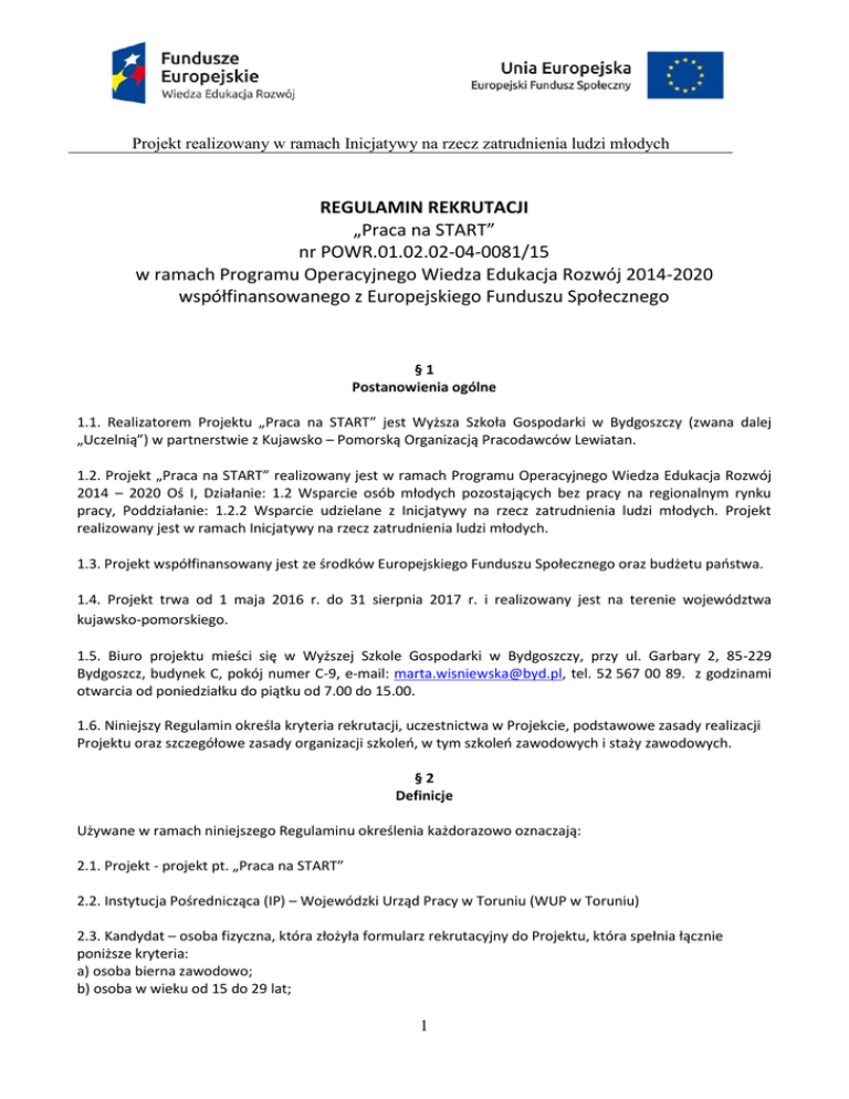 Projekt realizowany w ramach Inicjatywy na rzecz zatrudnienia ludzi młodych REGULAMIN REKRUTACJI „Praca na START” nr POWR.01.02.02-04-0081/15 w ramach Programu Operacyjnego Wiedza Edukacja Rozwój 2014-2020 współfinansowanego z Europejskiego Funduszu Społecznego §1 Postanowienia ogólne 1.1. Realizatorem Projektu „Praca na START” jest Wyższa Szkoła Gospodarki w Bydgoszczy (zwana dalej „Uczelnią”) w partnerstwie z Kujawsko – Pomorską Organizacją Pracodawców Lewiatan. 1.2. Projekt „Praca na START” realizowany jest w ramach Programu Operacyjnego Wiedza Edukacja Rozwój 2014 – 2020 Oś I, Działanie: 1.2 Wsparcie osób młodych pozostających bez pracy na regionalnym rynku pracy, Poddziałanie: 1.2.2 Wsparcie udzielane z Inicjatywy na rzecz zatrudnienia ludzi młodych. Projekt realizowany jest w ramach Inicjatywy na rzecz zatrudnienia ludzi młodych. 1.3. Projekt współfinansowany jest ze środków Europejskiego Funduszu Społecznego oraz budżetu państwa. 1.4. Projekt trwa od 1 maja 2016 r. do 31 sierpnia 2017 r. i realizowany jest na terenie województwa kujawsko-pomorskiego. 1.5. Biuro projektu mieści się w Wyższej Szkole Gospodarki w Bydgoszczy, przy ul. Garbary 2, 85-229 Bydgoszcz, budynek C, pokój numer C-9, e-mail: [email protected], tel. 52 567 00 89. z godzinami otwarcia od poniedziałku do piątku od 7.00 do 15.00. 1.6. Niniejszy Regulamin określa kryteria rekrutacji, uczestnictwa w Projekcie, podstawowe zasady realizacji Projektu oraz szczegółowe zasady organizacji szkoleń, w tym szkoleń zawodowych i staży zawodowych. §2 Definicje Używane w ramach niniejszego Regulaminu określenia każdorazowo oznaczają: 2.1. Projekt - projekt pt. „Praca na START” 2.2. Instytucja Pośrednicząca (IP) – Wojewódzki Urząd Pracy w Toruniu (WUP w Toruniu) 2.3. Kandydat – osoba fizyczna, która złożyła formularz rekrutacyjny do Projektu, która spełnia łącznie poniższe kryteria: a) osoba bierna zawodowo; b) osoba w wieku od 15 do 29 lat; 1 Projekt realizowany w ramach Inicjatywy na rzecz zatrudnienia ludzi młodych c) osoba o niskich kwalifikacjach1 - osoba posiadające wykształcenie co najwyżej ponadgimnazjalne (ukończone liceum, technikum, technikum uzupełniające, zasadnicza szkoła zawodowa) lub osoba posiadająca orzeczenie o niepełnosprawności z wykształceniem policealnym i wyższym; d) osoba należąca do kategorii NEET; e) osoba zamieszkała na obszarze województwa kujawsko - pomorskiego w rozumieniu Kodeksu Cywilnego; 2.4. Osoba bierna zawodowo - osoby bierne zawodowo, to osoby, które w danej chwili nie tworzą zasobów siły roboczej (tzn. nie pracują i nie są bezrobotne). Studenci studiów stacjonarnych są uznawani za osoby bierne zawodowo. Osoby będące na urlopie wychowawczym (rozumianym jako nieobecność w pracy, spowodowana opieką nad dzieckiem w okresie, który nie mieści się w ramach urlopu macierzyńskiego lub urlopu rodzicielskiego), są uznawane za bierne zawodowo, chyba że są zarejestrowane już jako bezrobotne (wówczas status bezrobotnego ma pierwszeństwo). Osoby prowadzące działalność na własny rachunek (w tym członek rodziny bezpłatnie pomagający osobie prowadzącej działalność) nie są uznawane za bierne zawodowo 2.5 Młodzież NEET – zgodnie z definicją osoby z kategorii NEET przyjętą w Programie Operacyjnym Wiedza Edukacja Rozwój 2014-2020. Za osobę z kategorii NEET uznaje się osobę młodą w wieku 15-29 lat, która spełnia łącznie trzy warunki, czyli nie pracuje (tj. jest bezrobotna lub bierna zawodowo), nie kształci się (tj. nie uczestniczy w kształceniu formalnym w trybie stacjonarnym) ani nie szkoli się (tj. nie uczestniczy w pozaszkolnych zajęciach mających na celu uzyskanie, uzupełnienie lub doskonalenie umiejętności i kwalifikacji zawodowych lub ogólnych, potrzebnych do wykonywania pracy; w procesie oceny czy dana osoba się nie szkoli, a co za tym idzie kwalifikuje się do kategorii NEET, należy zweryfikować czy brała ona udział w tego typu formie aktywizacji, finansowanej ze środków publicznych, w okresie ostatnich 4 tygodni). Kształcenie formalne w trybie stacjonarnym rozumiane jest jako kształcenie w systemie szkolnym na poziomie szkoły podstawowej, gimnazjum, szkół ponadgimnazjalnych, jak również kształcenie na poziomie wyższym w formie studiów wyższych lub doktoranckich realizowanych w trybie dziennym. 2.6. Uczestnik Projektu – Beneficjent pomocy - osoba zakwalifikowana do udziału w projekcie, od momentu podpisania umowy uczestnictwa do momentu przerwania udziału w Projekcie lub zakończenia udziału w Projekcie. 2.7. Kandydatem/ką do udziału w Projekcie jest osoba, która złożyła dokumenty rekrutacyjne i stara się o zakwalifikowanie do udziału w Projekcie. 2.8. Formy wsparcia zostały określone w Projekcie działania na rzecz Uczestników, w których uczestnictwo jest obowiązkowe. Formy wsparcia są wskazane w § 6. Regulaminu. 1 - wykształcenie PONADGIMNAZJALNE, ma na celu uzupełnienie wykształcenia średniego i przygotowanie do podjęcia studiów wyższych lub umożliwienie osobom uczącym się nabycia umiejętności istotnych dla podjęcia zatrudnienia. Uczniowie przystępują do nauki na tym poziomie zwykle pomiędzy 15 a 16 rokiem życia. Programy na poziomie ISCED 3 z reguły kończą się 12 lub 13 lat po rozpoczęciu nauki na poziomie ISCED 1 (lub mniej więcej w wieku 18 lat), przy czym najczęściej jest to okres 12 lat. Osoby przystępujące do projektu należy wykazać tylko raz uwzględniając najwyższy ukończony poziom ISCED, z wyjątkiem uczestników, którzy nie ukończyli jeszcze poziomu ISCED 1 i 2, ale są nadal w przyjętym w kraju zwyczajowo lub prawnie wieku obowiązku szkolnego. Stopień uzyskanego wykształcenia jest określany w dniu rozpoczęcia uczestnictwa w projekcie 2 Projekt realizowany w ramach Inicjatywy na rzecz zatrudnienia ludzi młodych § 3. Zasady rekrutacji 3.1 Proces rekru