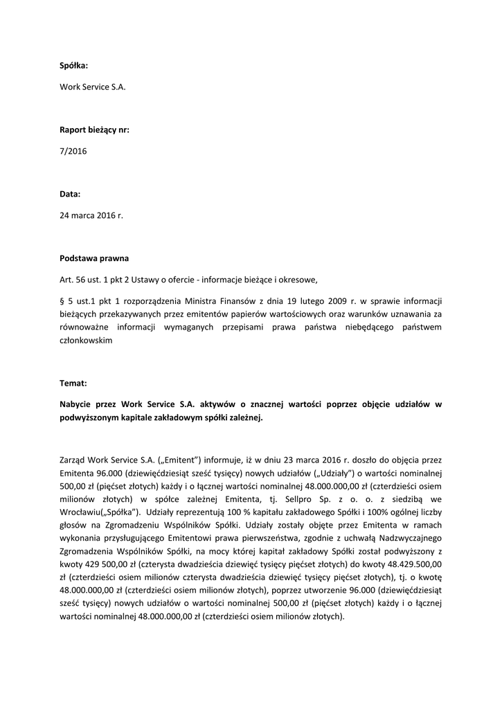 Spółka: Work Service S.A. Raport bieżący nr: 7/2016 Data: 24 marca 2016 r. Podstawa prawna Art. 56 ust. 1 pkt 2 Ustawy o ofercie - informacje bieżące i okresowe, § 5 ust.1 pkt 1 rozporządzenia Ministra Finansów z dnia 19 lutego 2009 r. w sprawie informacji bieżących przekazywanych przez emitentów papierów wartościowych oraz warunków uznawania za równoważne informacji wymaganych przepisami prawa państwa niebędącego państwem członkowskim Temat: Nabycie przez Work Service S.A. aktywów o znacznej wartości poprzez objęcie udziałów w podwyższonym kapitale zakładowym spółki zależnej. Zarząd Work Service S.A. („Emitent”) informuje, iż w dniu 23 marca 2016 r. doszło do objęcia przez Emitenta 96.000 (dziewięćdziesiąt sześć tysięcy) nowych udziałów („Udziały”) o wartości nominalnej 500,00 zł (pięćset złotych) każdy i o łącznej wartości nominalnej 48.000.000,00 zł (czterdzieści osiem milionów złotych) w spółce zależnej Emitenta, tj. Sellpro Sp. z o. o. z siedzibą we Wrocławiu(„Spółka”). Udziały reprezentują 100 % kapitału zakładowego Spółki i 100% ogólnej liczby głosów na Zgromadzeniu Wspólników Spółki. Udziały zostały objęte przez Emitenta w ramach wykonania przysługującego Emitentowi prawa pierwszeństwa, zgodnie z uchwałą Nadzwyczajnego Zgromadzenia Wspólników Spółki, na mocy której kapitał zakładowy Spółki został podwyższony z kwoty 429 500,00 zł (czterysta dwadzieścia dziewięć tysięcy pięćset złotych) do kwoty 48.429.500,00 zł (czterdzieści osiem milionów czterysta dwadzieścia dziewięć tysięcy pięćset złotych), tj. o kwotę 48.000.000,00 zł (czterdzieści osiem milionów złotych), poprzez utworzenie 96.000 (dziewięćdziesiąt sześć tysięcy) nowych udziałów o wartości nominalnej 500,00 zł (pięćset złotych) każdy i o łącznej wartości nominalnej 48.000.000,00 zł (czterdzieści osiem milionów złotych). Podstawowym przedmiotem działalności Spółki jest Pozostała działalność związana z udostępnianiem pracowników (PKD 78.30.Z). Emitent objął Udziały za łączną cenę 48.000.000, 00 zł., którą w dniu 23 marca 2016 r. opłacił pokrywając wkład na kapitał zakładowy w całości w formie pieniężnej. Wartość ewidencyjna Udziałów objętych przez Emitenta w podwyższonym kapitale zakładowym Spółki wynosi w księgach rachunkowych Emitenta 48.000.000,00 zł. Udziały mają charakter inwestycji długoterminowej Emitenta. Pomiędzy Emitentem oraz osobami zarządzającymi i nadzorującymi Emitenta a Spółką i osobami zarządzającymi i nadzorującymi Spółki, zachodzą następujące powiązania: (i) Emitent jest podmiotem dominującym wobec Spółki, posiadającym 100% udziałów w kapitale zakładowym Spółki. Źródłem finansowania objęcia Udziałów przez Emitenta są środki własne oraz pożyczki od podmiotów zależnych. Emitent jest jedynym udziałowcem Spółki i po zarejestrowaniu podwyższenia kapitału zakładowego w drodze utworzenia Udziałów posiadać będzie 100% w kapitale zakładowym Spółki. Po zarejestrowaniu podwyższenia kapitału zakładowego Spółki Emitent posiadać będzie 96.859 udziałów o wartości nominalnej 500,00 zł każdy i o łącznej wartości nominalnej 48.429.500, 00 zł. Objęte przez Emitenta Udziały w podwyższonym kapitale zakładowym Spółki zostały uznane za aktywa o znacznej wartości, ze względu na ich wartość, przekraczającą 10% kapitałów własnych Emitenta. Podstawa prawna: Art. 56 ust. 1 pkt 2 Ustawy o ofercie publicznej i warunkach wprowadzania instrumentów finansowych do zorganizowanego systemu obrotu oraz o spółkach publicznych (Dz. U. z 2013 r., poz. 1382 ze zm.) w związku z § 5 ust 1 pkt. 1 Rozporządzenia Ministra Finansów z dnia 19 lutego 2009 r. w sprawie informacji bieżących i okresowych przekazywanych przez emitentów papierów wartościowych oraz warunków uznawania za równoważne informacji wymaganych przepisami prawa państwa niebędącego państwem członkowskim Podpisy: Iwona Szmitkowska – Wiceprezes Zarządu Tomasz Ślęzak – Wiceprezes Zarządu
