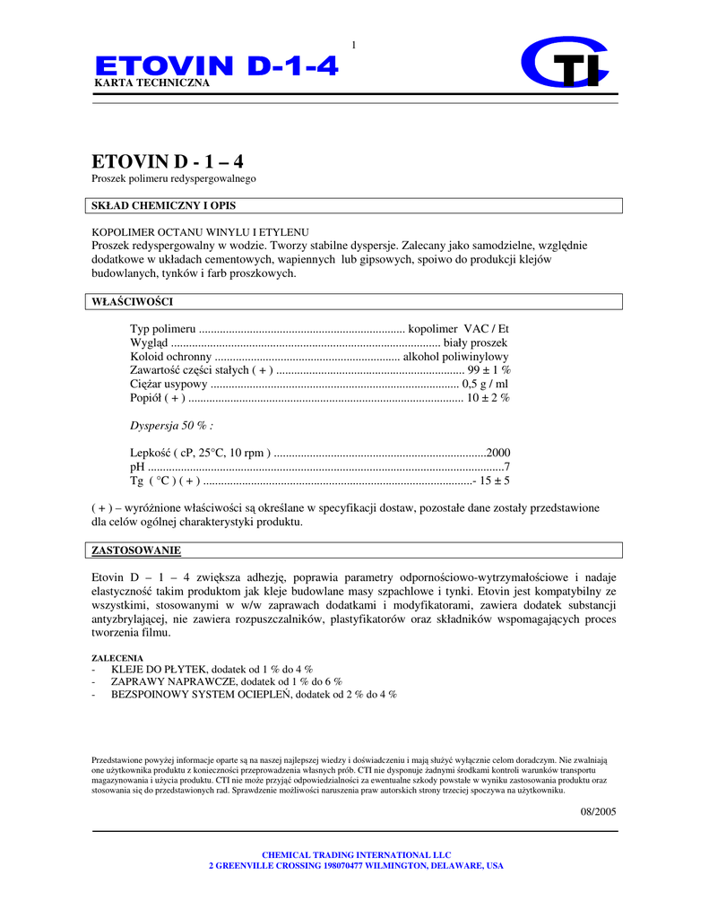 1 KARTA TECHNICZNA TI ETOVIN D - 1 – 4 Proszek polimeru redyspergowalnego SKŁAD CHEMICZNY I OPIS KOPOLIMER OCTANU WINYLU I ETYLENU Proszek redyspergowalny w wodzie. Tworzy stabilne dyspersje. Zalecany jako samodzielne, względnie dodatkowe w układach cementowych, wapiennych lub gipsowych, spoiwo do produkcji klejów budowlanych, tynków i farb proszkowych. WŁAŚCIWOŚCI Typ polimeru ..................................................................... kopolimer VAC / Et Wygląd .......................................................................................... biały proszek Koloid ochronny .............................................................. alkohol poliwinylowy Zawartość części stałych ( + ) ............................................................... 99 ± 1 % Ciężar usypowy ................................................................................... 0,5 g / ml Popiół ( + ) ............................................................................................ 10 ± 2 % Dyspersja 50 % : Lepkość ( cP, 25°C, 10 rpm ) .......................................................................2000 pH .......................................................................................................................7 Tg ( °C ) ( + ) ..........................................................................................- 15 ± 5 ( + ) – wyróżnione właściwości są określane w specyfikacji dostaw, pozostałe dane zostały przedstawione dla celów ogólnej charakterystyki produktu. ZASTOSOWANIE Etovin D – 1 – 4 zwiększa adhezję, poprawia parametry odpornościowo-wytrzymałościowe i nadaje elastyczność takim produktom jak kleje budowlane masy szpachlowe i tynki. Etovin jest kompatybilny ze wszystkimi, stosowanymi w w/w zaprawach dodatkami i modyfikatorami, zawiera dodatek substancji antyzbrylającej, nie zawiera rozpuszczalników, plastyfikatorów oraz składników wspomagających proces tworzenia filmu. ZALECENIA - KLEJE DO PŁYTEK, dodatek od 1 % do 4 % ZAPRAWY NAPRAWCZE, dodatek od 1 % do 6 % BEZSPOINOWY SYSTEM OCIEPLEŃ, dodatek od 2 % do 4 % Przedstawione powyżej informacje oparte są na naszej najlepszej wiedzy i doświadczeniu i mają służyć wyłącznie celom doradczym. Nie zwalniają one użytkownika produktu z konieczności przeprowadzenia własnych prób. CTI nie dysponuje żadnymi środkami kontroli warunków transportu magazynowania i użycia produktu. CTI nie może przyjąć odpowiedzialności za ewentualne szkody powstałe w wyniku zastosowania produktu oraz stosowania się do przedstawionych rad. Sprawdzenie możliwości naruszenia praw autorskich strony trzeciej spoczywa na użytkowniku. 08/2005 CHEMICAL TRADING INTERNATIONAL LLC 2 GREENVILLE CROSSING 198070477 WILMINGTON, DELAWARE, USA 2 KARTA TECHNICZNA TI PAKOWANIE 150 kg big-bag. PRZECHOWYWANIE W czystych, suchych, dobrze wentylowanych magazynach, w temperaturze otoczenia. Zaleca się zużycie produktu w okresie 6 miesięcy. Magazynowanie w podwyższonej temperaturze i wilgotności może powodować zbrylanie. ZAGROŻENIA Produkt nie jest sklasyfikowany jako niebezpieczny. Szczegółowa charakterystyka – oddzielna karta bezpieczeństwa. Przedstawione powyżej informacje oparte są na naszej najlepszej wiedzy i doświadczeniu i mają służyć wyłącznie celom doradczym. Nie zwalniają one użytkownika produktu z konieczności przeprowadzenia własnych prób. CTI nie dysponuje żadnymi środkami kontroli warunków transportu magazynowania i użycia produktu. CTI nie może przyjąć odpowiedzialności za ewentualne szkody powstałe w wyniku zastosowania produktu oraz stosowania się do przedstawionych rad. Sprawdzenie możliwości naruszenia praw autorskich strony trzeciej spoczywa na użytkowniku. 08/2005 CHEMICAL TRADING INTERNATIONAL LLC 2 GREENVILLE CROSSING 198070477 WILMINGTON, DELAWARE, USA