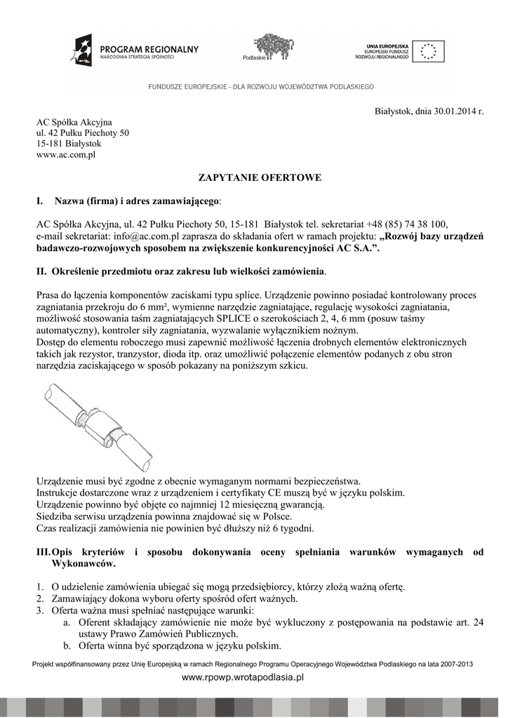Białystok, dnia 30.01.2014 r. AC Spółka Akcyjna ul. 42 Pułku Piechoty 50 15-181 Białystok www.ac.com.pl ZAPYTANIE OFERTOWE I. Nazwa (firma) i adres zamawiającego: AC Spółka Akcyjna, ul. 42 Pułku Piechoty 50, 15-181 Białystok tel. sekretariat +48 (85) 74 38 100, e-mail sekretariat: [email protected] zaprasza do składania ofert w ramach projektu: „Rozwój bazy urządzeń badawczo-rozwojowych sposobem na zwiększenie konkurencyjności AC S.A.”. II. Określenie przedmiotu oraz zakresu lub wielkości zamówienia. Prasa do łączenia komponentów zaciskami typu splice. Urządzenie powinno posiadać kontrolowany proces zagniatania przekroju do 6 mm², wymienne narzędzie zagniatające, regulację wysokości zagniatania, moŜliwość stosowania taśm zagniatających SPLICE o szerokościach 2, 4, 6 mm (posuw taśmy automatyczny), kontroler siły zagniatania, wyzwalanie wyłącznikiem noŜnym. Dostęp do elementu roboczego musi zapewnić moŜliwość łączenia drobnych elementów elektronicznych takich jak rezystor, tranzystor, dioda itp. oraz umoŜliwić połączenie elementów podanych z obu stron narzędzia zaciskającego w sposób pokazany na poniŜszym szkicu. Urządzenie musi być zgodne z obecnie wymaganym normami bezpieczeństwa. Instrukcje dostarczone wraz z urządzeniem i certyfikaty CE muszą być w języku polskim. Urządzenie powinno być objęte co najmniej 12 miesięczną gwarancją. Siedziba serwisu urządzenia powinna znajdować się w Polsce. Czas realizacji zamówienia nie powinien być dłuŜszy niŜ 6 tygodni. III. Opis kryteriów i sposobu dokonywania oceny spełniania warunków wymaganych od Wykonawców. 1. O udzielenie zamówienia ubiegać się mogą przedsiębiorcy, którzy złoŜą waŜną ofertę. 2. Zamawiający dokona wyboru oferty spośród ofert waŜnych. 3. Oferta waŜna musi spełniać następujące warunki: a. Oferent składający zamówienie nie moŜe być wykluczony z postępowania na podstawie art. 24 ustawy Prawo Zamówień Publicznych. b. Oferta winna być sporządzona w języku polskim. Projekt współfinansowany przez Unię Europejską w ramach Regionalnego Programu Operacyjnego Województwa Podlaskiego na lata 2007-2013 c. Oferta winna być złoŜona w terminie wyznaczonym do składania ofert. 4. Oferent upowaŜnia Zamawiającego do sprawdzenia prawdziwości wszystkich danych zawartych w ofercie. 5. Oferentów wobec których stwierdzi się, Ŝe dostarczone przez nich informacje istotne dla prowadzonego postępowania są nieprawdziwe - wyklucza się z postępowania konkursowego. IV. Miejsce i termin składania ofert: 1. Ofertę naleŜy złoŜyć do godz. 14:00 dnia 07.02.2014 r. w sekretariacie zamawiającego w Białymstoku, przy ul. 42 Pułku Piechoty 50. Na kopercie powinny znajdować się nazwa (firma) i adres oferenta lub faxem na nr +48 85 653 93 83 lub emailem na adres: [email protected] 2. WiąŜąca jest data i godzina wpływu oferty. V. Kryteria oceny oferty: 1. Specyfikacja wymagań AC SA dla parametrów technicznych – 100% 2. Przy spełnionych warunkach specyfikacji technicznej kolejnym kryterium wyboru jest: − cena – 60% − atrakcyjność oferty (np. bezpłatne pakiety wdroŜeniowe, szkolenia, dodatkowa funkcjonalność, dostępność serwisu ) – 40%. VI. Oferta podlega odrzuceniu w następujących przypadkach: 1. Wniesienia po terminie określonym w pkt IV 1. 2. Niespełnienie wymogów określonych w pkt V. VII. Termin związania ofertą. Okres związania ofertą nie moŜe być krótszy niŜ 1 miesiąc od momentu jej złoŜenia. VIII. Termin realizacji zamówienia (odbioru końcowego): 28.03.2014 r. IX. Oczekiwana oferta musi stanowić ofertę w rozumieniu art. 66 Kodeksu cywilnego. Z góry dziękujemy i licząc na szybką odpowiedź pozostajemy z powaŜaniem. Zarząd AC SA Projekt współfinansowany przez Unię Europejską w ramach Regionalnego Programu Operacyjnego Województwa Podlaskiego na lata 2007-2013