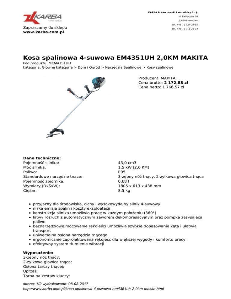 KARBA B.Karczewski i Wspólnicy Sp.J. ul. Fabryczna 14 53-609 Wrocław tel. +48 71 724-24-65 Zapraszamy do sklepu www.karba.com.pl tel. +48 71 718-20-03 Kosa spalinowa 4-suwowa EM4351UH 2,0KM MAKITA kod produktu: MEM4351UH kategoria: Główne kategorie > Dom i Ogród > Narzędzia Spalinowe > Kosy spalinowe Producent: MAKITA. Cena brutto: 2 172,88 zł Cena netto: 1 766,57 zł Dane techniczne: Pojemność silnika: Moc silnika: Paliwo: Standardowe narzędzie tnące: Pojemność zbiornika: Wymiary (DxSxW): Ciężar: 43,0 cm3 1,5 kW (2,0 KM) E95 3-zębny nóż tnący, 2-żyłkowa głowica tnąca 0,68 l 1805 x 613 x 438 mm 8,5 kg przyjazny dla środowiska, cichy i wysokowydajny silnik 4-suwowy niska emisja spalin i koszty eksploatacji konstrukcja silnika umożliwia pracę w każdym położeniu (360°) łatwy rozruch z automatycznym zaworem dekompresacyjnym oraz pompką zasysającą paliwo beznarzędziowe mocowanie rękojeści umożliwia szybkie dopasowanie kąta i ułatwia transport uniwersalna osłona narzędzia tnącego ergonomicznie zaprojektowana rękojeść dla większej wygody i komfortu pracy efektywny system tłumienia wibracji Wyposażenie: 3-zębny nóż tnący: 2-żyłkowa głowica tnąca: Osłona tarczy tnącej: Uprząż: Torba na zestaw kluczy: strona: 1/2 wydrukowano: 08-03-2017 http://www.karba.com.pl/kosa-spalinowa-4-suwowa-em4351uh-2-0km-makita.html Komplet kluczy: strona: 2/2 wydrukowano: 08-03-2017 http://www.karba.com.pl/kosa-spalinowa-4-suwowa-em4351uh-2-0km-makita.html