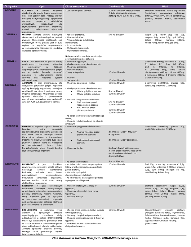 Odżywka ACIDOMID H OPTIMIN H AMIVIT H AQUAKAR H ENERGIT H ELEKTROLIT H KNOBLAMIN H BRONCHOXAN H Opis ACIDOMID H zawiera wszystkie niezbędne dla gołębi kwasy organiczne oraz jako jedyny tego rodzaju środek dostępny na rynku glukozę i optymalnie dobrane proporcje składników mineralnych, niezbędnych do stymulowania procesów przemiany materii i podwyższenia odporności organizmów. OPTIMIN zawiera zestaw niezwykle skutecznych soli mineralnych w postaci płynnej. Skutecznośd niektórych soli mineralnych w tej postaci jest o 80% wyższa od wyników uzyskiwanych w zastosowaniu klasycznych środków w postaci sproszkowanej. AMIVIT jest środkiem w postaci cieczy zawierającej L-karnitynę, witaminy i aminokwasy w ilościach zaspokajających zapotrzebowanie gołębi na te środki. Pozwala utrzymad organizm w odpowiednim stanie zdrowia oraz wspierad system odpornościowy. AQUAKAR H jest przeznaczony dla wszystkich gatunków gołębi. Poprawia ogólną kondycję organizmu, zmniejsza wrażliwośd na stres i polepsza pracę mięśnia sercowego. Wspomaga proces spalania tłuszczów i powstawania energii oraz podwyższa przyswajalnośd witamin A, D, E, K zawartych w karmie. ENERGIT to wysoko stężona dawka Lkarnityny, która zaspokaja zapotrzebowanie organizmu gołębia na czas lotów oraz w znacznym stopniu tłumi stres związany z transportem. Dodatkowo ENERGIT zawiera duże ilości glukozy i sorbitu, które są niezbędne w początkowych fazach lotu. Po zakooczeniu lotów Energit bardzo szybko regeneruje organizm. ELEKTROLYT H jest środkiem zawierającym elektrolity, dzięki którym następuje szybkie wchłanianie kationów, anionów oraz łatwo przyswajalnych węglowodanów. Podwyższa sprawnośd organizmu. Podczas wysiłku chroni przed utratą elektrolitów z organizmu. Knoblamin H jest czosnkowym ekstraktem olejowym wzbogaconym w substancje mineralne, wspomagające procesy przemiany materii. Czosnek, który używany jest od tysiącleci w medycynie naturalnej poprawia ogólny stan zdrowia i polepsza zdolności przeciwstawiania się chorobom. BRONCHOXAN to naturalny syrop ziołowy o specjalnym składzie zapobiegającym chorobom dróg oddechowych u gołębi. BRONCHOXAN może byd stosowany w prewencji oraz w trakcie leczenia – odblokowuje górne drogi oddechowe i ułatwia oddychanie. Zawiera specjalny ekstrakt ziołowy, którego skład gwarantuje szybkie i efektywne działanie. Okres stosowania Dawkowanie - Codziennie przez cały rok. 10ml na 1l wody. Przez pierwsze 2-3 dni stosowania podawad połowę dawki tj. 5ml na 1l wody. Składniki mineralne, kwasy organiczne (mrówkowy, propianowy, mlekowy, octowy, cytrynowy), kwas L-askrobiowy, glukoza, chlorek miedzi, uzdatniona woda. - Podczas pierzenia, - W sezonie lotów, - Przy niedoborze składników mineralnych, - Po szczepieniu, - W stanach stresowych, - W przypadku infekcji. 5ml na 1l wody Wapo 25g, fosfor 15g, sód 10g, magnez 1,6g, potas 0,5g, cynk 500mg, żelazo 350mg, mangan 300mg, miedź 70mg, kobalt 3mg, jod 2mg. Najlepsze efekty uzyskuje się stosując profilaktycznie przez cały rok. - W okresie lęgowym, - Młodym ptakom w okresie wzrostu, - W okresie pierzenia, - W sezonie lotów, x2 razy w tygodniu. 10ml na 1l wody - W zimie x1 w tygodniu. - W okresie parowania i lęgów 10ml na 1l wody 10ml na 1l wody - Młodym ptakom w okresie wzrostu: Młode gołębie pocztowe Młode gołębie ozdobne 5ml na 1l wody 10ml na 1l wody - W czasie przygotowao do sezonu: Na 2 miesiące przed rozpoczęciem sezonu Na 1 miesiąc przed pierwszym lotem Skład L-karnityna 800mg, witamina E B1 80mg, B2 15mg, B6 B12 5 000mg, C H (biotyna) 8mg, amid nikotynowego 400mg, L-lizyna L-metionina 300mg, L-treonina L-tryptofan 60mg. 120mg, 40mg, 500mg, kwasu 600mg, 200mg, L-karnityna 25 000mg, glukoza 50g, sorbit 20g, witamina C 2 000mg. 5ml na 1l wody 10ml na 1l wody 10ml na 1l wody 10ml na 1l wody - Po zakooczeniu okresów wzmożonego stresu, - W czasie redukcji nadwagi po okresie zimowym. - W okresie przygotowao do sezonu: L-karnityna 50 000mg, glukoza 50g, sorbit 50g, witamina C 2500mg. Na dwa miesiące przed pierwszym startem. 2,5 ml na 1 l wody - trzy razy w tygodniu. Na jeden miesiąc przed startem. 2,5 ml na 1 l wody codziennie. - W okresie lotów 5 ml na 1 l wody dziennie, a na 3-5 dni przed lotem w ilości 10 ml na 1 l wody (w zależności od długości lotów). - Po zakooczeniu lotów - Na jeden dzieo przed rozpoczęciem lotów oraz bezpośrednio po przylocie gołębi z lotów, - W czasie upalnych i długodystansowych lotach, - Po chorobach, a szczególnie podczas występowania biegunek. 5ml na 1l wody 10ml na 1l wody - W sezonie lotowym 1-2 razy w tygodniu, - W okresie pierzenia i zimą raz w tygodniu, - W czasie infekcji. 10ml na 1l wody Ekstrakt czosnkowy, wapo 12,5g, fosfor 7,5g, sód 5g, magnez 0,8g, potas 0,24g, żelazo 174mg, mangan 150mg, cynk 250mg, miedź 34mg, jod 1mg, kobalt 1,5mg. - Miesiąc przed sezonem lotów: kuracja dwutygodniowa, - Pierwszy i drugi dzieo po zawodach, - W czasie sezonu zimowego 1-2 razy w tygodniu - W trakcie leczenia schorzeo układu dróg oddechowych. 10ml na 1l wody Skoncentrowany ekstrakt ziołowy (Polygoni avicularis herba, Thymi herba, Salviae folium, Foeniculi fructus, Urticae herba, Althaeae radix, Sambuci flos, Liguiritiae radix, Malvae folium), glukoza 160. Plan stosowania środków Benefeed - AQUAMID technology s.r.o. Sód 15g, potas 9g, witamina C 2,5g, wapo 1,5g, witamina E 500mg, magnez 0,5g, cynk 80mg, mangan 50 mg, miedź 40mg, kobalt 5mg.