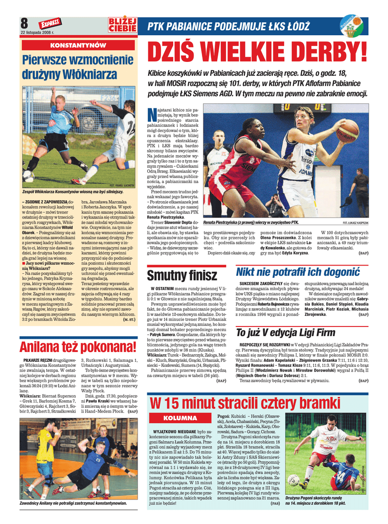 8 PTK PABIANICE PODEJMUJE ŁKS ŁÓDŹ 22 listopada 2008 r. KONSTANTYNÓW Pierwsze wzmocnienie drużyny Włókniarza DZIŚ WIELKIE DERBY! Kibice koszykówki w Pabianicach już zacierają ręce. Dziś, o godz. 18, w hali MOSiR rozpoczną się 101. derby, w których PTK Aflofarm Pabianice podejmuje ŁKS Siemens AGD. W tym meczu na pewno nie zabraknie emocji. N – ZGODNIE Z ZAPOWIEDZIĄ dokonałem rewolucji kadrowej w drużynie – mówi trener ostatniej drużyny w trzecioligowych rozgrywkach, Włókniarza Konstantynów Witold Obarek. – Pożegnaliśmy się aż z dziewięcioma zawodnikami z pierwszej kadry klubowej. Są to ci, którzy nie dawali nadziei, że drużyna będzie mogła grać lepiej na wiosnę. ■ Jacy nowi piłkarze wzmocnią Włókniarz? – Na razie pozyskaliśmy tylko jednego, Patryka Krymarysa, który występował swego czasu w Sokole Aleksandrów. Zagrał on w naszej drużynie w minioną sobotę w meczu sparingowym z Zawiszą Rzgów, który zakończył się naszym zwycięstwem 3:2 po bramkach Witolda Zio- bra, Jarosława Marczaka i Roberta Janczyka. W spotkaniu tym szansę pokazania i wykazania się otrzymali także nasi młodzi wychowankowie. Oczywiście, na tym nie kończą się wzmocnienia personalne naszej drużyny. Prowadzone są rozmowy z innymi interesującymi nas piłkarzami, którzy powinni przyczynić się do podniesienia poziomu i skuteczności gry zespołu, abyśmy mogli uchronić się przed ewentualną degradacją. Teraz jesteśmy wprawdzie w okresie roztrenowania, ale zajęcia odbywają się 4 razy w tygodniu. Musimy bardzo solidnie pracować przez całą zimę, aby nie sprawić zawodu naszym wiernym kibicom. (M. ST.) Anilana też pokonana! PIŁKARZE RĘCZNI drugoligowego Włókniarza Konstantynów nie zwalniają tempa. W ostatniej kolejce w derbach regionu bez większych problemów pokonali 36:24 (19:10) w Łodzi Anilanę. Włókniarz: Biernat Superson – Grek 11, Barłomiej Kosma 7, Główczyński 4, Rajchert 3, Sobór 3, Rajchert 3, Strzałkowski 3, Rutkowski 1, Salamaga 1, Urbańczyk i Augustyniak. To było ósme zwycięstwo konstantynowian w 9 meczu. Wyżej w tabeli są tylko niepokonane w tym sezonie rezerwy Wisły Płock. Dziś, godz. 17.30, podopieczni Pawła Kraski we własnej hali zmierzą się z ósmym w tabeli Hand–Medem Płock. (BAP) Renata Piestrzyńska (z prawej) wierzy w zwycięstwo PTK. tego prestiżowego pojedynku. Oby nie przerosły ich chęci – podreśla szkoleniowiec. Dopiero dziś okaże się, czy FOT. PAWEŁ ŁACHETA pomoże im doświadczona Olena Proszczenko. Z kolei w ekipie ŁKS zabraknie Lady Kowalenko, ale gotowa do gry ma być Edyta Koryzna. W 100 dotychczasowych meczach 51 górą były pabianiczanki, a 49 razy triumfowały ełkaesianki. (BAP) Nikt nie potrafił ich dogonić Smutny finisz W OSTATNIM meczu rundy jesiennej V ligi piłkarze Włókniarza Pabianice przegrali 0:1 w Głownie z nie najsilniejszą Stalą. Pewnym usprawiedliwieniem może być fakt, że do Głowna pabianiczanie pojechali w zaeldwie 12-osobowym składzie. Do tego już w 14 minucie trener Piotr Urbaniak musiał wykorzystać jedyną zmianę, bo kontuzji doznał bohater poprzedniego meczu – Patryk Sumera. Gospodarze, dla których było to pierwsze zwycięstwo przed własną publicznością, jedynego gola na wagę trzech punktów zdobyli w 38 min (Kluska). Włókniarz: Turek – Bednarczyk, Załoga, Molski – Kluch, Starzyński, Grącki, Urbaniak, Plisiecki – Kozłewski, Sumera (14, Stężycki). Pabianiczanie przerwę zimową spędzą na czwartym miejscu w tabeli (36 pkt). (BAP) SUKCESEM ZAKOŃCZYŁY się dwudniowe zmagania młodych pływaków UKS piątka o miano najlepszej Drużyny Województwa Łódzkiego. Podopieczni Roberta Bujnowicza rywalizując z zawodnikami z 12 klubów z rocznika 1996 wygrali z ponad- stupunktową przewagą nad kolejną drużyną, zdobywając 24 medale! W dziesiątce najlepszych zawodników zawodów znaleźli się: Gabrysia Bakies, Daniel Stępień, Klaudia Marciniak , Piotr Koziak , Michasia Zbrojewska. (BAP) To już V edycja Ligi Firm ROZPOCZĘŁY SIĘ ROZGRYWKI w V edycji Pabianickiej Ligi Zakładów Pracy. Pierwszą dyscypliną był tenis stołowy. Tradycyjnie już najlepszymi okazali się zawodnicy Philipsa I, którzy w finale pokonali MOSiR 2:0. Wyniki finału: Adam Kapelański – Zbigniewem Grzanka 7:11, 11:6 i 12:10, Ryszard Romanowski – Tomasz Kloze 9:11, 11:6, 11:3. W pojedynku o brąz Philips II (Włodzimierz Nowak i Mirosław Dorowolski) wygrał z Polfą II (Wojciech Oberle i Dariusz Dobrosz) 2:1. Teraz zawodnicy będą rywalizować w pływaniu. (BAP) W 15 minut stracili cztery bramki KOLUMNA Zawodnicy Anilany nie potraligi zastrzymać konstantynowian. FOT. ŁUKASZ KASPRZAK WYJĄTKOWO NIEUDANE było zakończenie sezonu dla piłkarzy Pogoni Salmaru Łask Kolumna. Przegrali oni zaległy wyjazdowy mecz z Pelikanem II aż 1:5. Do 75 minuty nic nie zapowiadało tak bolesnej porażki. W 50 min Kukieła wyrównał na 1:1 i wydawało się, że remis jest w zasięgu drużyny z Kolumny. Końcówka Pelikana była jednak piorunująca. W 15 minut Pogoń straciła aż cztery gole. Cóż, miejmy nadzieję, że po dobrze przepracowanej zimie, takich wpadek już nie będzie! Pogoń: Kubicki – Herski (Olszewski), Acela, Chabasiński, Pecyna (Tosik, Zołotarew) – Kukieła, Karp, Oborowski, Sadura – Gorący, Cichosz. Drużyna Pogoni skończyła rundę na 14. miejscu z dorobkiem 18 pkt. Strzeliła 18 bramek, straciła aż 40. Więcej wpadło tylko do siatki Astry Zduny i SAS Skierniewice (straciły po 50 goli). Przypomnijmy, że z 18-drużynowej IV ligi bezpośrednio spadają dwa zespoły, ale ta liczba może być większa. Zależy od tego, ile drużyn z okręgu łódzkiego pożegna się z III ligą. Pierwszą kolejkę IV ligi rundy wiosennej zaplanowano na 21 marca. (PAS) FOT. ŁUKASZ KASPRZAK FOT. PAWEŁ ŁACHETA Zespół Włókniarza Konsantynów wiosną ma być silniejszy. ajstarsi kibice nie pamiętają, by wynik bezpo