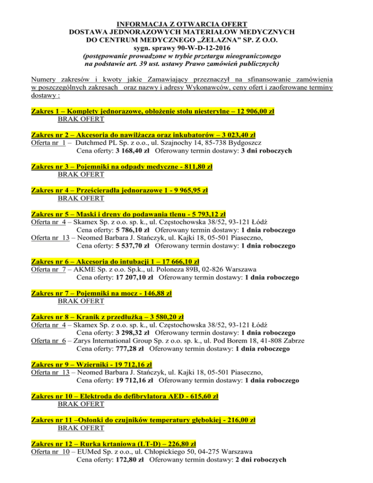 INFORMACJA Z OTWARCIA OFERT DOSTAWA JEDNORAZOWYCH MATERIAŁOW MEDYCZNYCH DO CENTRUM MEDYCZNEGO „ŻELAZNA” SP. Z O.O. sygn. sprawy 90-W-D-12-2016 (postępowanie prowadzone w trybie przetargu nieograniczonego na podstawie art. 39 ust. ustawy Prawo zamówień publicznych) Numery zakresów i kwoty jakie Zamawiający przeznaczył na sfinansowanie zamówienia w poszczególnych zakresach oraz nazwy i adresy Wykonawców, ceny ofert i zaoferowane terminy dostawy : Zakres 1 – Komplety jednorazowe, obłożenie stołu niesterylne – 12 906,00 zł BRAK OFERT Zakres nr 2 – Akcesoria do nawilżacza oraz inkubatorów – 3 023,40 zł Oferta nr 1 – Dutchmed PL Sp. z o.o., ul. Szajnochy 14, 85-738 Bydgoszcz Cena oferty: 3 168,40 zł Oferowany termin dostawy: 3 dni roboczych Zakres nr 3 – Pojemniki na odpady medyczne - 811,80 zł BRAK OFERT Zakres nr 4 – Prześcieradła jednorazowe 1 - 9 965,95 zł BRAK OFERT Zakres nr 5 – Maski i dreny do podawania tlenu - 5 793,12 zł Oferta nr 4 – Skamex Sp. z o.o. sp. k., ul. Częstochowska 38/52, 93-121 Łódź Cena oferty: 5 786,10 zł Oferowany termin dostawy: 1 dnia roboczego Oferta nr 13 – Neomed Barbara J. Stańczyk, ul. Kajki 18, 05-501 Piaseczno, Cena oferty: 5 537,70 zł Oferowany termin dostawy: 1 dnia roboczego Zakres nr 6 – Akcesoria do intubacji 1 – 17 666,10 zł Oferta nr 7 – AKME Sp. z o.o. Sp.k., ul. Poloneza 89B, 02-826 Warszawa Cena oferty: 17 207,10 zł Oferowany termin dostawy: 1 dnia roboczego Zakres nr 7 – Pojemniki na mocz - 146,88 zł BRAK OFERT Zakres nr 8 – Kranik z przedłużką – 3 580,20 zł Oferta nr 4 – Skamex Sp. z o.o. sp. k., ul. Częstochowska 38/52, 93-121 Łódź Cena oferty: 3 298,32 zł Oferowany termin dostawy: 1 dnia roboczego Oferta nr 6 – Zarys International Group Sp. z o.o. sp. k., ul. Pod Borem 18, 41-808 Zabrze Cena oferty: 777,28 zł Oferowany termin dostawy: 1 dnia roboczego Zakres nr 9 – Wzierniki - 19 712,16 zł Oferta nr 13 – Neomed Barbara J. Stańczyk, ul. Kajki 18, 05-501 Piaseczno, Cena oferty: 19 712,16 zł Oferowany termin dostawy: 1 dnia roboczego Zakres nr 10 – Elektroda do defibrylatora AED - 615,60 zł BRAK OFERT Zakres nr 11 –Osłonki do czujników temperatury głębokiej - 216,00 zł BRAK OFERT Zakres nr 12 – Rurka krtaniowa (LT-D) – 226,80 zł Oferta nr 10 – EUMed Sp. z o.o., ul. Chłopickiego 50, 04-275 Warszawa Cena oferty: 172,80 zł Oferowany termin dostawy: 2 dni roboczych Zakres nr 13 – Wkładki domaciczne – 823,85 zł BRAK OFERT Zakres nr 14 – Worki na wymiociny – 5 216,40 zł Oferta nr 2 – Duolux Medical Sp. z o.o., Os. B. Chrobrego 40F/53, 60-681 Poznań Cena oferty: 3 515,40 zł Oferowany termin dostawy: 1 dnia roboczego Oferta nr 9 – Visterion Witold Skrabot, ul. Fredry 16/53, 33-100 Tarnów Cena oferty: 2 698,92 zł Oferowany termin dostawy: 1 dnia roboczego Zakres nr 15 – Serweta pod pośladki - 49 863,60 zł Oferta nr 4 – Skamex Sp. z o.o. sp. k., ul. Częstochowska 38/52, 93-121 Łódź Cena oferty: 60 889,00 zł Oferowany termin dostawy: 1 dnia roboczego Oferta nr 5 – Toruńskie Zakłady Materiałów Opatrunkowych S.A., ul. Żółkiewskiego 20/26, 87-100 Toruń Cena oferty: 32 799,17 zł Oferowany termin dostawy: 1 dnia roboczego Oferta nr 6 – Zarys International Group Sp. z o.o. sp. k., ul. Pod Borem 18, 41-808 Zabrze Cena oferty: 49 808,20 zł Oferowany termin dostawy: 1 dnia roboczego Oferta nr 11 – PANEP s.r.o. , Brnenska 1246, 665 01 Rosice u Brna, Republika Czeska Cena oferty: 66 207,78 zł Oferowany termin dostawy: 2 dni roboczych Zakres nr 16 – Test do diagnostyki przedwczesnego pęknięcia błon płodowych – 2 160,00 zł Oferta nr 8 – Euro-Centrum Bożena i Cezariusz Wirkowscy Sp. j., ul. Chodakowska 10, 95-503 Sochaczew Cena oferty: 28 422,25 zł Oferowany termin dostawy: 1 dnia roboczego Zakres nr 17 – Artykuły ochrony osobistej - 8 596,80 zł BRAK OFERT Zakres nr 18 – Środek zapobiegający zrostom 1 – 1 006,56 zł BRAK OFERT Zakres nr 19– Środek zapobiegający zrostom 2 – 37 033,20 zł Oferta nr 12 – Bialmed Sp. z o.o., ul. Marii Konopnickiej 11a, 12-230 Biała Piska Cena oferty: 29 937,60 zł Oferowany termin dostawy: 1 dnia roboczego Zakres nr 20– Kapcie fizelinowe – 1 026,00 zł BRAK OFERT Zakres nr 21 – Igła do linii krwi - 1 830,60 zł Oferta nr 12 – Bialmed Sp. z o.o., ul. Marii Konopnickiej 11a, 12-230 Biała Piska Cena oferty: 1 782,00 zł Oferowany termin dostawy: 1 dnia roboczego Zakres nr 22 – Środek zapobiegający zrostom 3 - 5 942,14 zł Oferta nr 3 – „ANMAR” Spółka z o.o. Sp. k., ul. Strefowa 22, 43-100 Tychy Cena oferty: 5 942,12 zł Oferowany termin dostawy: 2 dni roboczych Zakres nr 23 – Nakładka na końcówkę sondy zewnętrznej - 6 480,00 zł BRAK OFERT Sporządziła: Martyna Strzępka Specjalista w Sekcji Zamówień Publicznych Warszawa, dnia 17.01.2017r.