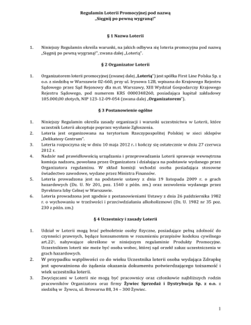 Regulamin Loterii Promocyjnej pod nazwą „Sięgnij po pewną wygraną!” § 1 Nazwa Loterii 1. Niniejszy Regulamin określa warunki, na jakich odbywa się loteria promocyjna pod nazwą „Sięgnij po pewną wygraną!”, zwana dalej „Loterią”. § 2 Organizator Loterii 1. Organizatorem loterii promocyjnej (zwanej dalej „Loterią”) jest spółka First Line Polska Sp. z o.o. z siedzibą w Warszawie 02-660, przy ul. Irysowa 12B, wpisana do Krajowego Rejestru Sądowego przez Sąd Rejonowy dla m.st. Warszawy, XIII Wydział Gospodarczy Krajowego Rejestru Sądowego, pod numerem KRS 0000348260, posiadająca kapitał zakładowy 105.000,00 złotych, NIP 123-12-09-054 (zwana dalej „Organizatorem”). § 3 Postanowienie ogólne 1. 2. 3. 4. 5. 6. Niniejszy Regulamin określa zasady organizacji i warunki uczestnictwa w Loterii, które uczestnik Loterii akceptuje poprzez wysłanie Zgłoszenia. Loteria jest organizowana na terytorium Rzeczypospolitej Polskiej w sieci sklepów „Delikatesy Centrum”. Loteria rozpoczyna się w dniu 10 maja 2012 r. i kończy się ostatecznie w dniu 27 czerwca 2012 r. Nadzór nad prawidłowością urządzania i przeprowadzania Loterii sprawuje wewnętrzna komisja nadzoru, powołana przez Organizatora i działająca na podstawie wydanego przez Organizatora regulaminu. W skład komisji wchodzi osoba posiadająca stosowne świadectwo zawodowe, wydane przez Ministra Finansów. Loteria prowadzona jest na podstawie ustawy z dnia 19 listopada 2009 r. o grach hazardowych (Dz. U. Nr 201, poz. 1540 z późn. zm.) oraz zezwolenia wydanego przez Dyrektora Izby Celnej w Warszawie. Loteria prowadzona jest zgodnie z postanowieniami Ustawy z dnia 26 października 1982 r. o wychowaniu w trzeźwości i przeciwdziałaniu alkoholizmowi (Dz. U. 1982 nr 35 poz. 230 z późn. zm.) § 4 Uczestnicy i zasady Loterii 1. Udział w Loterii mogą brać pełnoletnie osoby fizyczne, posiadające pełną zdolność do czynności prawnych, będące konsumentem w rozumieniu przepisów kodeksu cywilnego art.221, nabywające określone w niniejszym regulaminie Produkty Promocyjne. Uczestnikiem loterii nie może być osoba wobec, której sąd orzekł zakaz uczestniczenia w grach hazardowych. 2. W przypadku wątpliwości co do wieku Uczestnika loterii osoba wydająca Zdrapkę jest upoważniona do żądania okazania dokumentu potwierdzającego tożsamość i wiek uczestnika loterii. 3. Zwycięzcami w Loterii nie mogą być pracownicy oraz członkowie najbliższych rodzin pracowników Organizatora oraz firmy Żywiec Sprzedaż i Dystrybucja Sp. z o.o. z siedzibą w Żywcu, ul. Browarna 88, 34 – 300 Żywiec. 1 4. 5. 6. 7. 8. 9. 10. 11. 12. 13. 14. 15. Przez członków rodziny, o których mowa w pkt 3 powyżej, rozumie się: wstępnych, zstępnych, rodzeństwo, małżonków, małżonków i zstępnych rodzeństwa, rodziców i rodzeństwo małżonków oraz osoby pozostające w stosunku przysposobienia. Przedmiotami (zwanymi dalej „Produktami Promocyjnymi”) których nabycie uprawnia do udziału w Loterii są: - piwo WARKA o pojemności 0,5 litra w puszce - piwo WARKA o pojemności 0,5 litra w butelce Sprzedaż Produktów Promocyjnych rozpoczyna się w dniu 10 maja 2012 r. i trwać będzie do dnia 31 maja 2012 r. Poza tym okresem Produkty Promocyjne będą dostępne w sprzedaży, jednak ich zakup nie będzie uprawniał do udziału w Loterii. Uczestnikiem Loterii może być każda osoba fizyczna, o której mowa w § 4 pkt. 1, (dalej „Uczestnik”), która w okresie od dnia 10 maja 2012 r. do dnia 31 maja 2012 r. spełni łącznie następujące warunki: 1) dokona jednorazowo zakupu co najmniej 2 (dwóch) litrów piwa WARKA tj. 4 (czterech) sztuk piwa WARKA o pojemności 0,5 litra, w sklepie biorącym udział w Loterii zgodnie z §3 pkt. 2 - zakup wyżej wymienionych Produktów Promocyjnych musi być potwierdzony jednym dowodem zakupu; 2) odbierze w kasie sklepu zdrapkę promocyjną (dalej „ Zdrapkę”). 3) zachowa dowód zakupu – paragon. Odbiór Zdrapki u sprzedawcy przy kasie jest możliwy tylko i wyłącznie podczas dokonywania zakupu Promocyjnych Produktów. W celu uzyskania wyniku gry, Uczestnik Loterii usuwa warstwę ścieralna z pola gry Zdrapki. W polu zdrapkowym może znajdować się jedno z trzech oznaczeń: 1) symbol „szklanki” oznacza, iż Uczestnik wygrał promocyjną szklankę BIAŁOCZERWONYCH 2) symbol „puszki” oznacza, iż Uczestnik wygrał piwo WARKA 0,5 litra w puszcze 3) symbol „pędzelka” oznacza, iż Uczestnik wygrał farbki do ciała biało-czerwone Zdrapki wydawane będą przez sklepy biorące udział w Loterii, do wyczerpania ich nakładu. Organizator nie ponosi odpowiedzialności za wyczerpanie nakładu zdrapek przewidzianego w niniejszej Loterii. Organizator przewidział nakład 74 008 (słownie: siedemdziesiąt cztery tysiące osiem) sztuk zdrapek. W Loterii biorą udział wyłącznie oryginalne zdrapki. Zdrapki podrobione, przerobione zniszczone lub uszkodzone w sposób uniemożliwiający weryfikację ich autentyczności, a także co do których można mieć podejrzenia, że nie są oryginalne lub nie zostały uzyskane przez Uczestnika w sposób przewidziany regulaminem, nie uprawniają do udziału w Loterii i otrzymania jakiejkolwiek z nagród przewidzianych w Regulaminie. Każdy Uczestnik Loterii może brać udział w Loterii dowolną ilość razy pod warunkiem spełnienia wymogów, o których mowa w § 4 pkt. 7. Okazując zgłoszenie udziału w Loterii (zdrapkę), Uczestnicy Loterii wyrażają zgodę na udział w Loterii na warunkach określonych w niniejszym Regulaminie, jak również wyrażają zgodę na przetwarzanie danych osobowych w celach związanych z przeprowadzeniem Loterii. Jeżeli na jednym paragonie będzie wielokrotność 4 (czterech) Produktów Promocyjnych (tj. 8, 12, 16, 20 itd. ) Uczestnik jest uprawniony do otrzymania wielokrotności Zdrapek (np. za zakup 4 Produktów Promocyjnych – 1 zdrapka, 8 Produktów Promocyjnych – 2 zdrapki